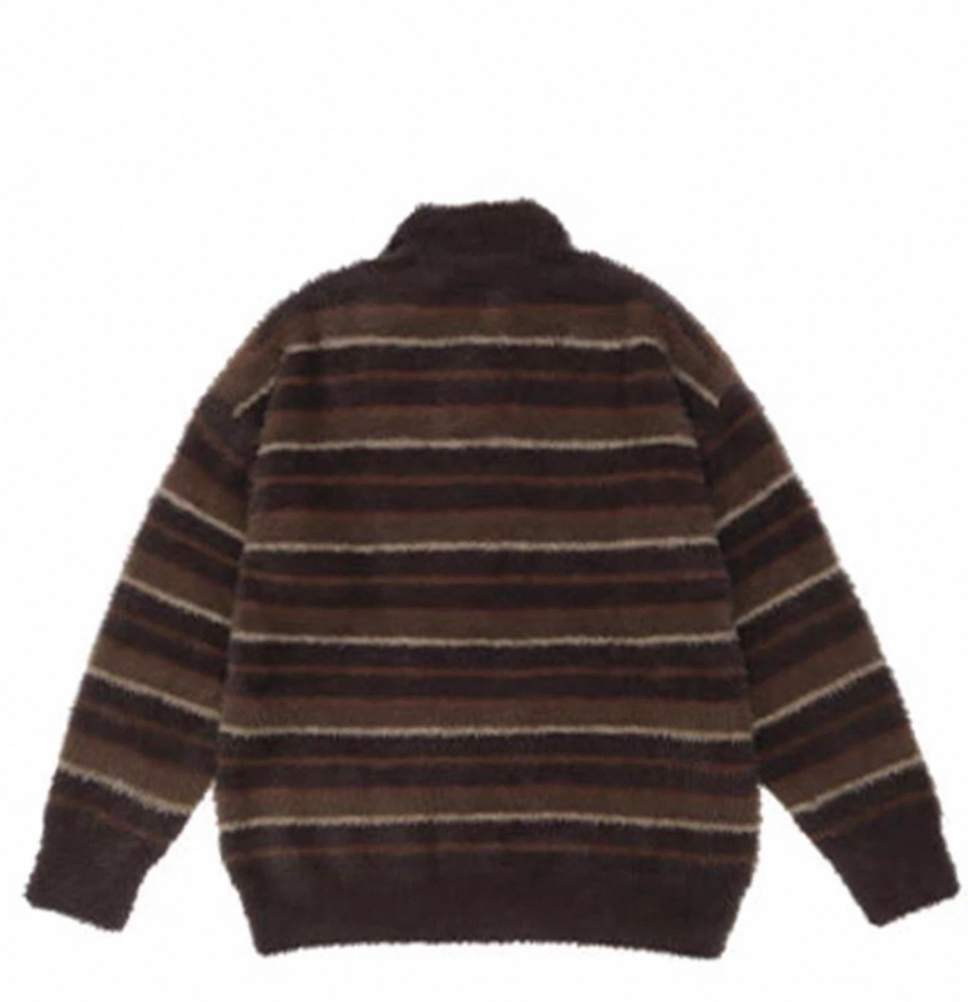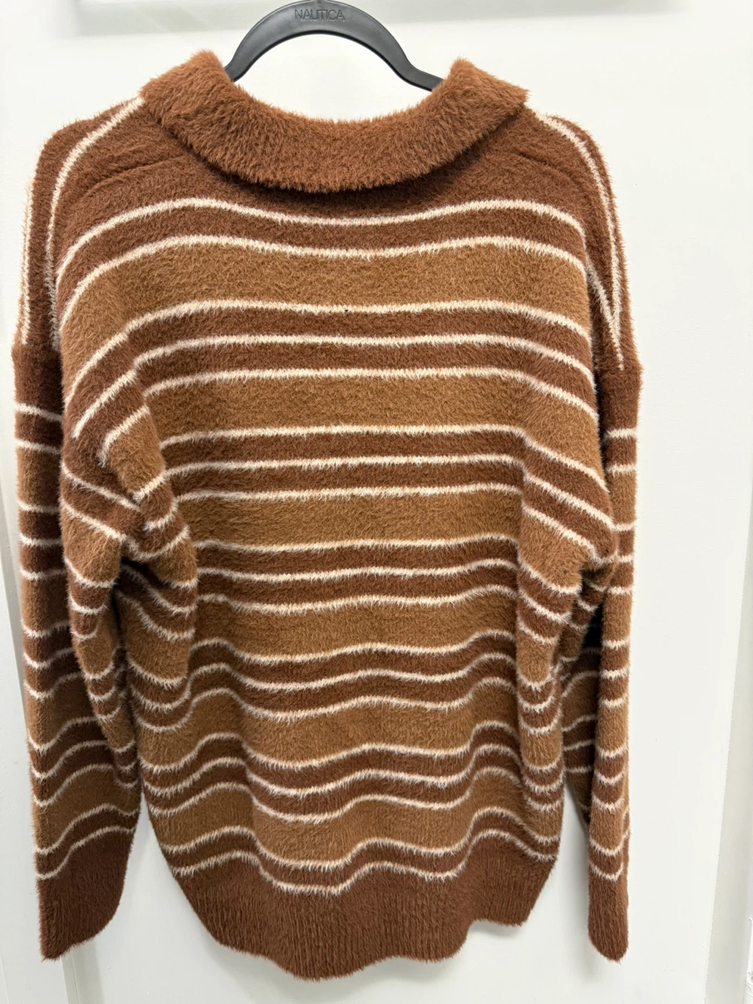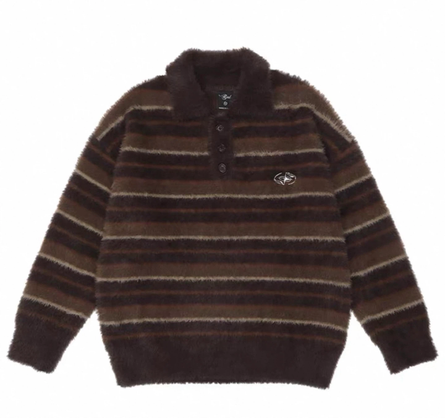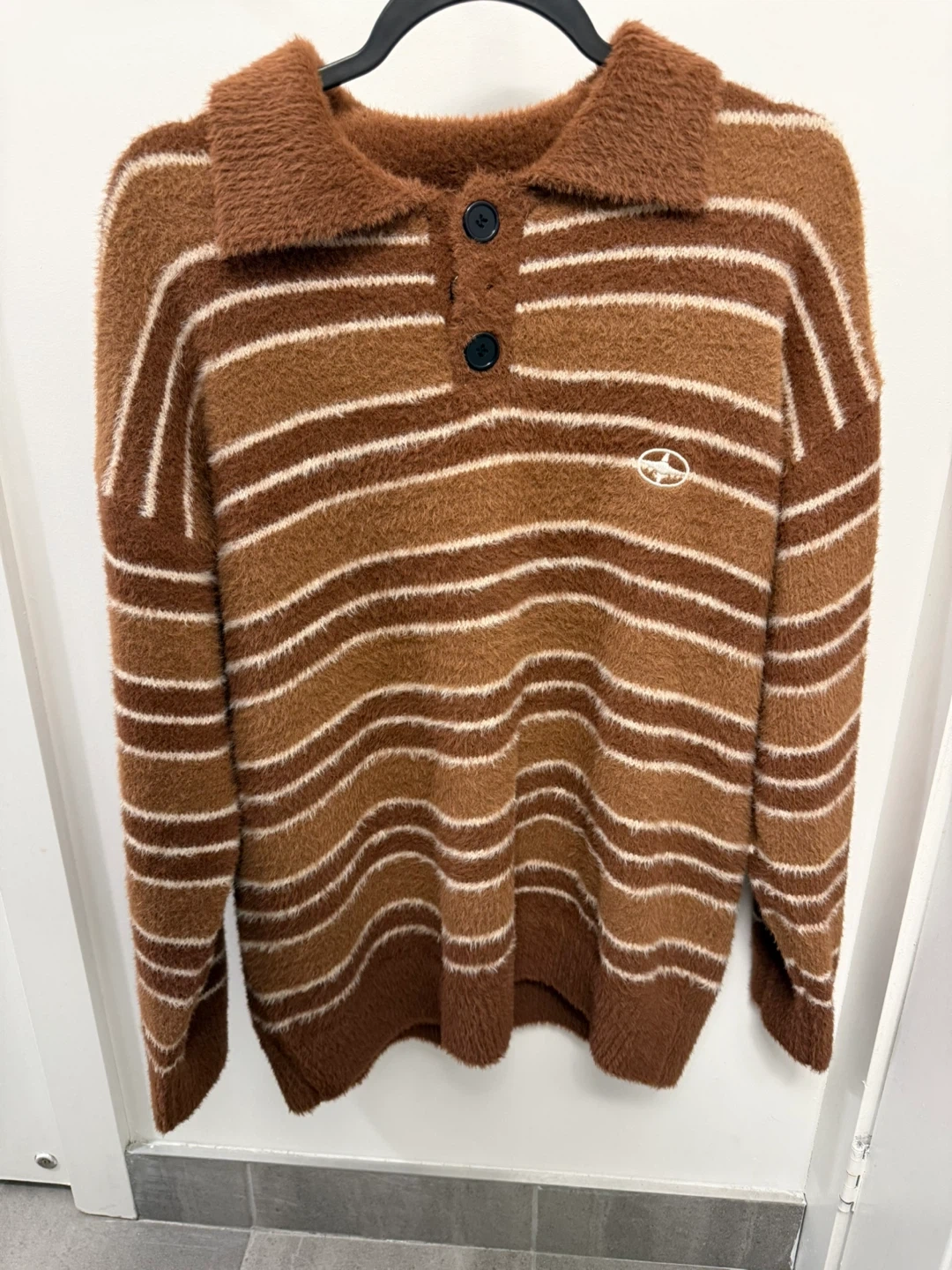 Cozy Lazy Oaf knit sweater with a polo collar. Features brown and white stripes, perfect for a comfy and stylish look!