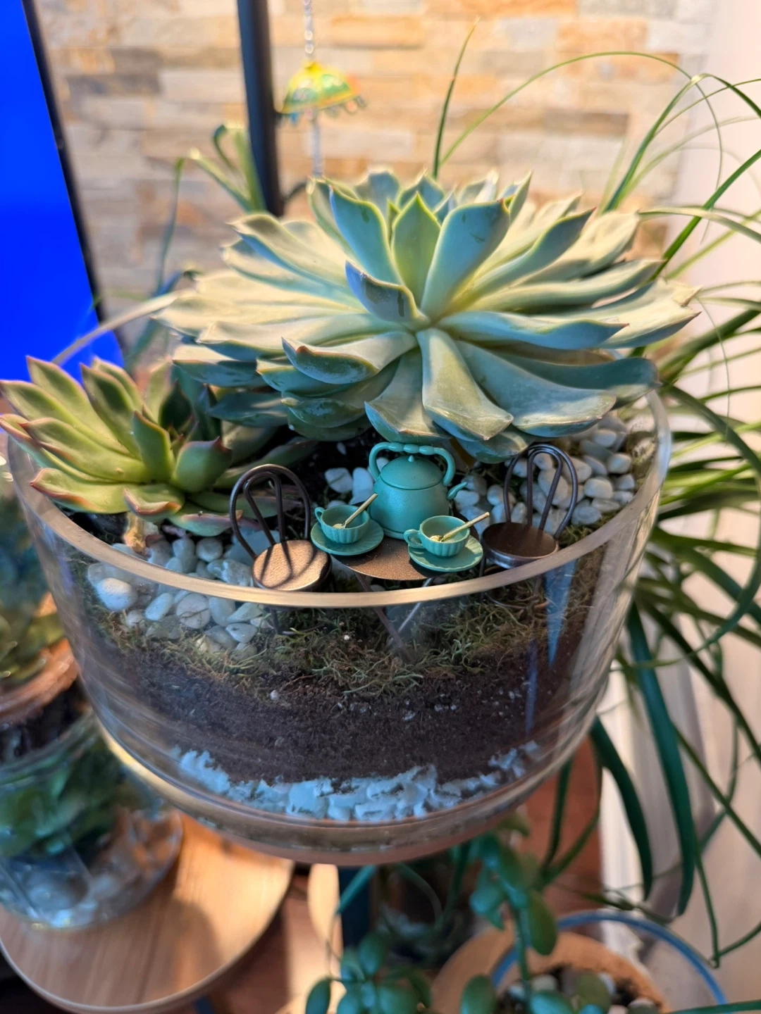 I'm selling a lovely succulent terrarium! It features a variety of succulents planted in a clear glass container. There's also a cute miniature tea set with tiny chairs inside, making it a unique and charming decorative piece for any space