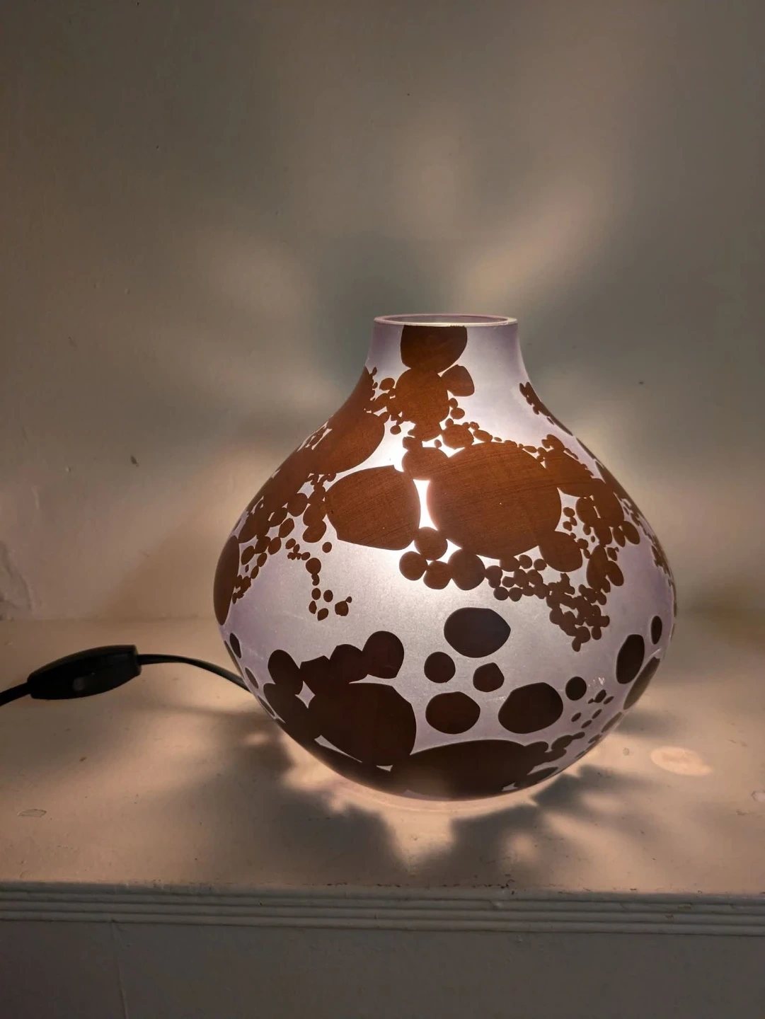 Here's a lovely lamp with a unique pattern! It gives off a nice warm light and would look great in any room. Lightbulb included.