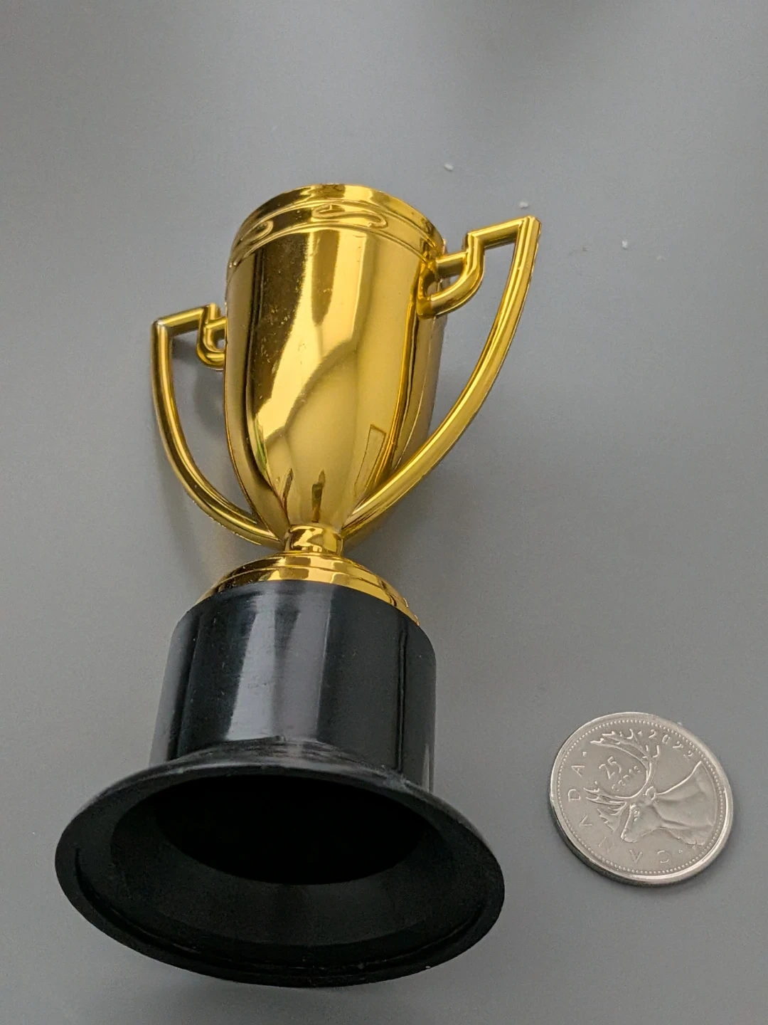 Selling a cute little trophy! It's gold and black plastic and would be perfect for a fun award or decoration.