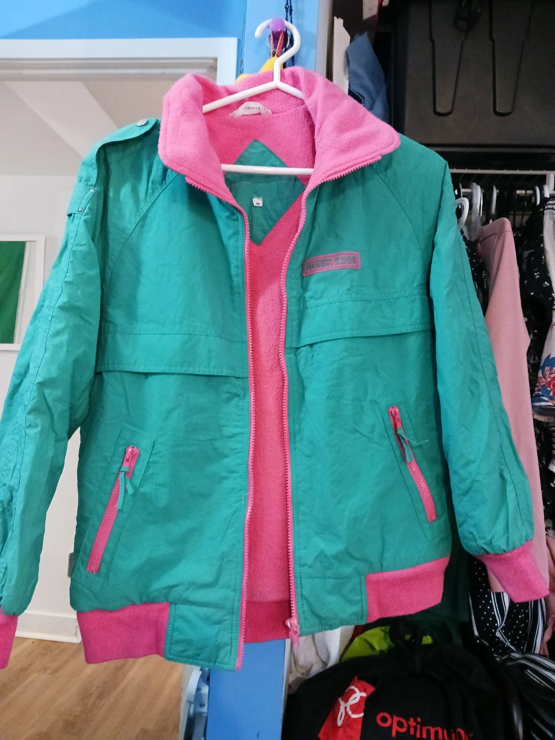 Selling a Higier Edge jacket in size M. It's a vibrant green with pink accents. Perfect for adding a pop of colour to your wardrobe!