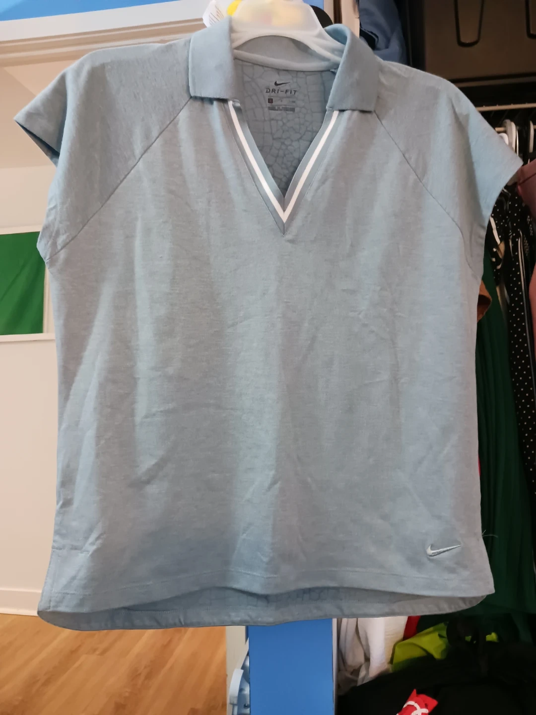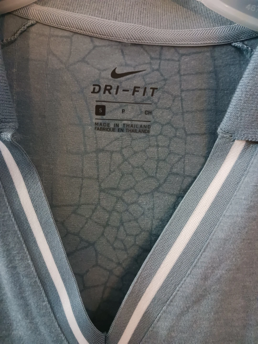 Selling a Nike Dri-FIT polo shirt in size small. It's a light, breathable material, perfect for sports or casual wear. The shirt features the classic Nike swoosh and a stylish V-neck design with white trim