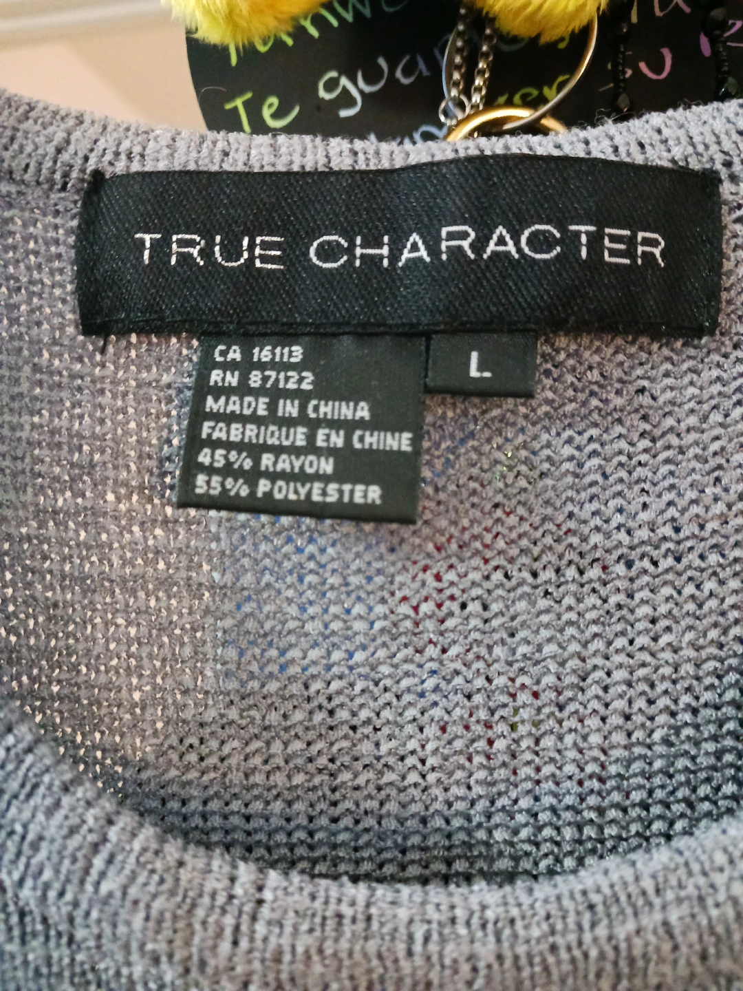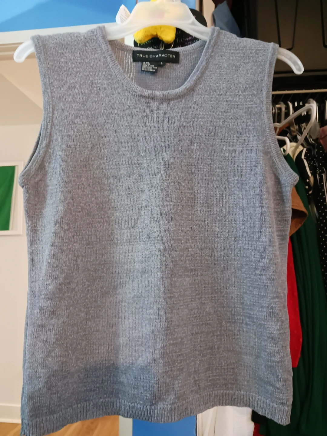 Here's a comfy grey sleeveless top from True Character! It's a size large and made from a blend of 45% rayon and 55% polyester. Perfect for layering or wearing on its own