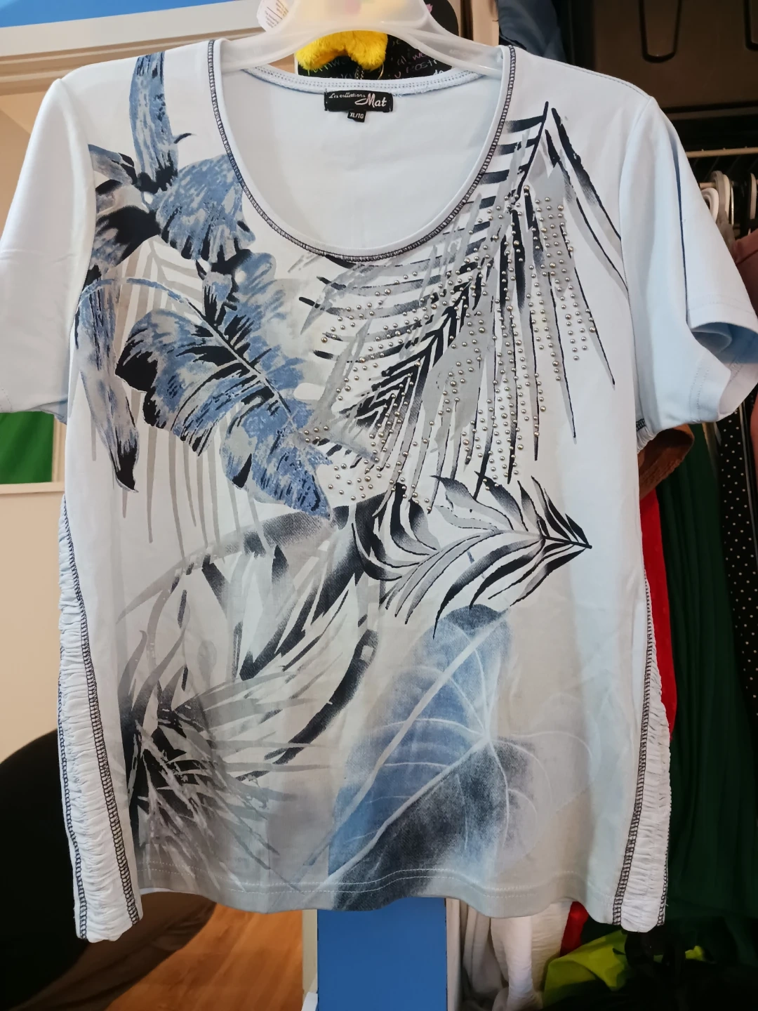 Here's a lovely Les Collections Mat top in size XL/TG! It features a beautiful floral design in shades of blue, grey, and white. The top is in good condition and ready for a new home!