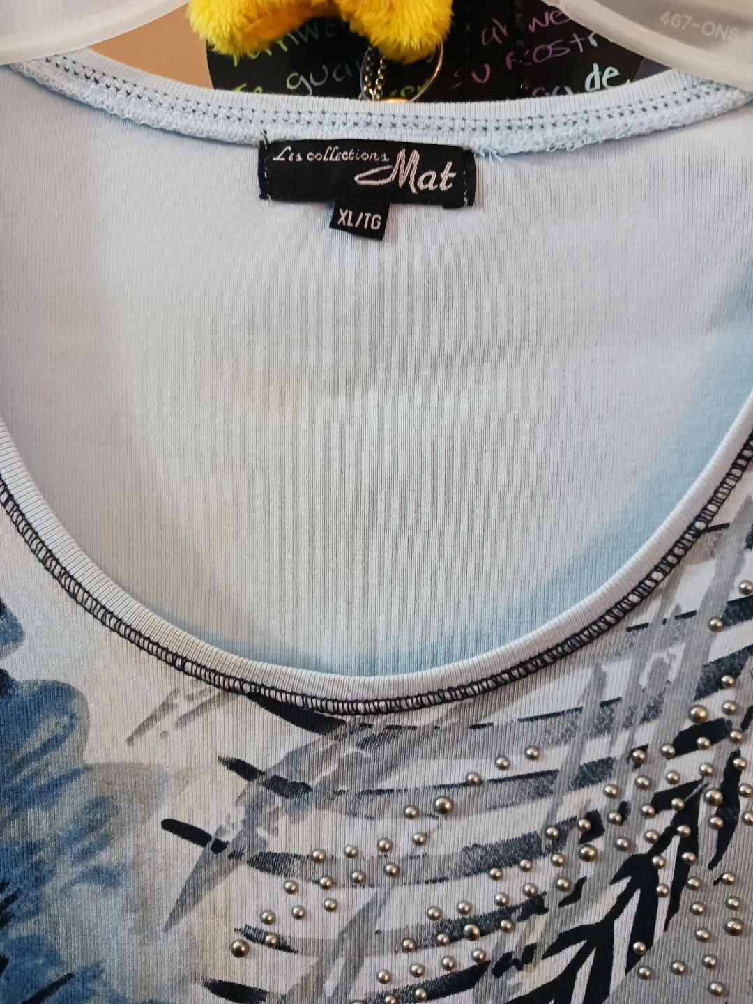 Here's a lovely Les Collections Mat top in size XL/TG! It features a beautiful floral design in shades of blue, grey, and white. The top is in good condition and ready for a new home!