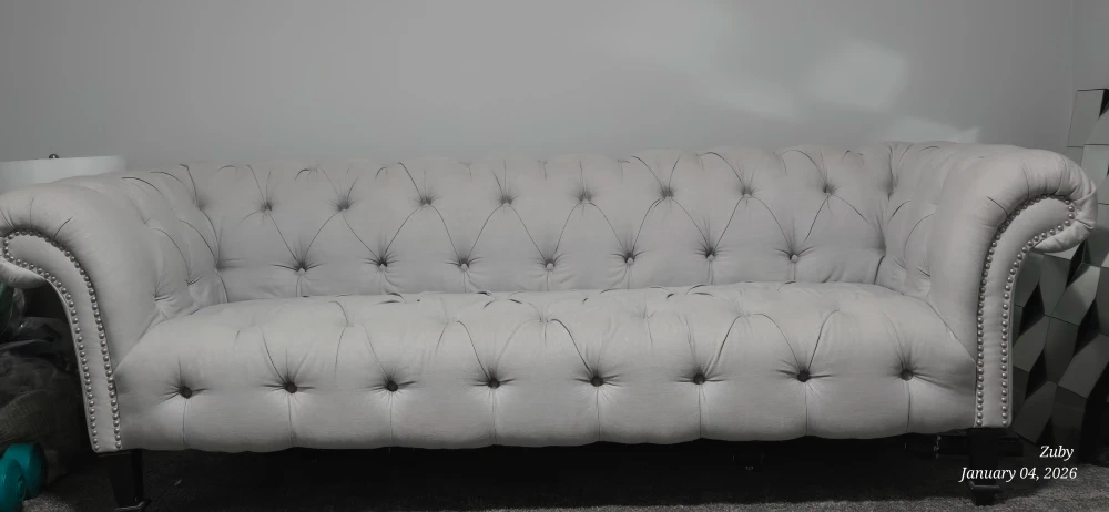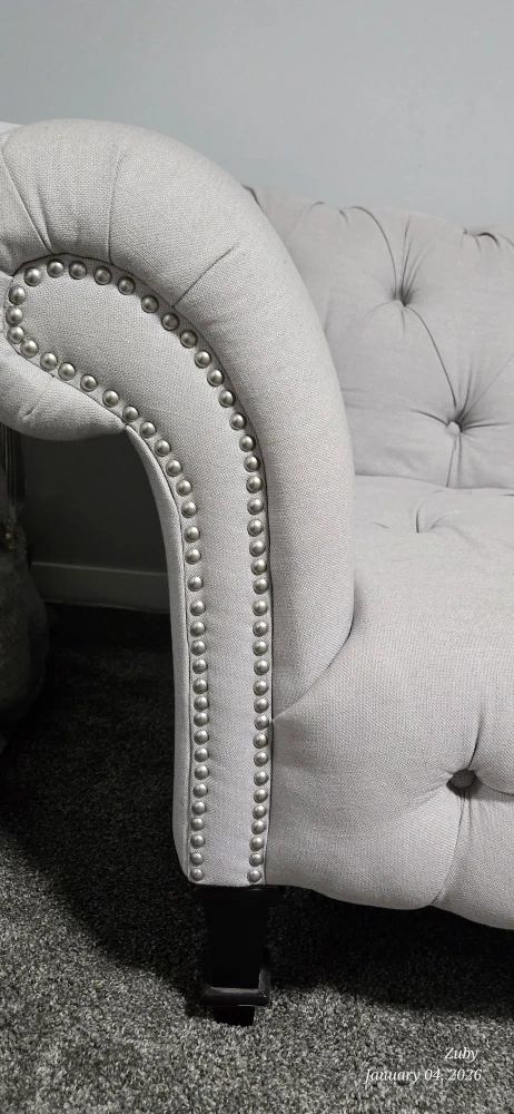 Selling a beautiful tufted Chesterfield sofa in light grey! This sofa features classic Chesterfield styling with button-tufted detailing and elegant rolled arms. It would make a great addition to any living room or seating area