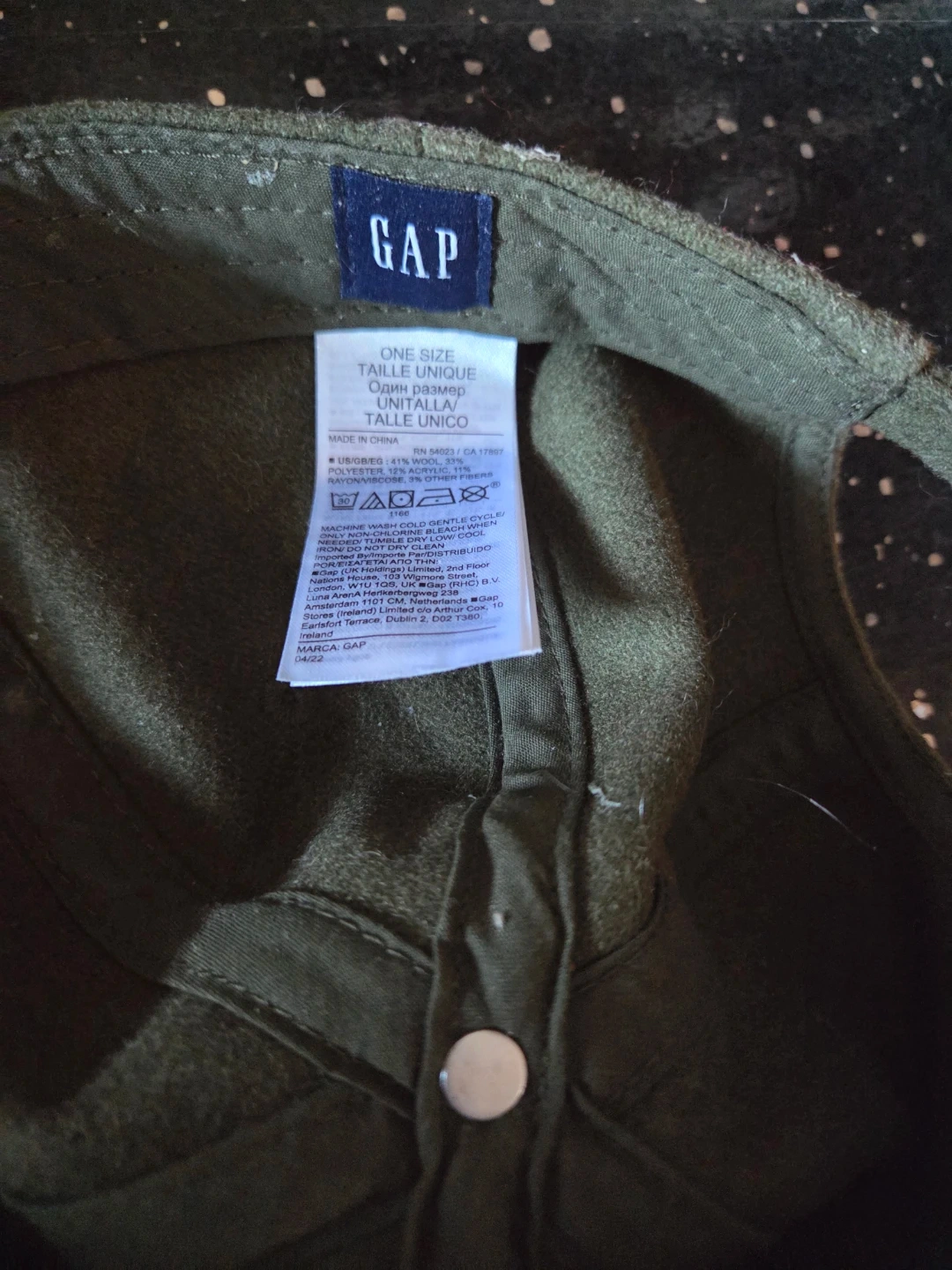 Selling a GAP baseball cap in olive green. It's a wool blend, making it nice and warm for cooler weather. It's a one-size-fits-all style!