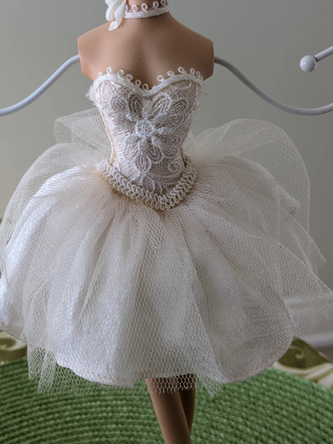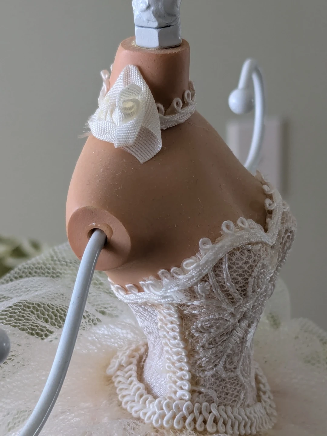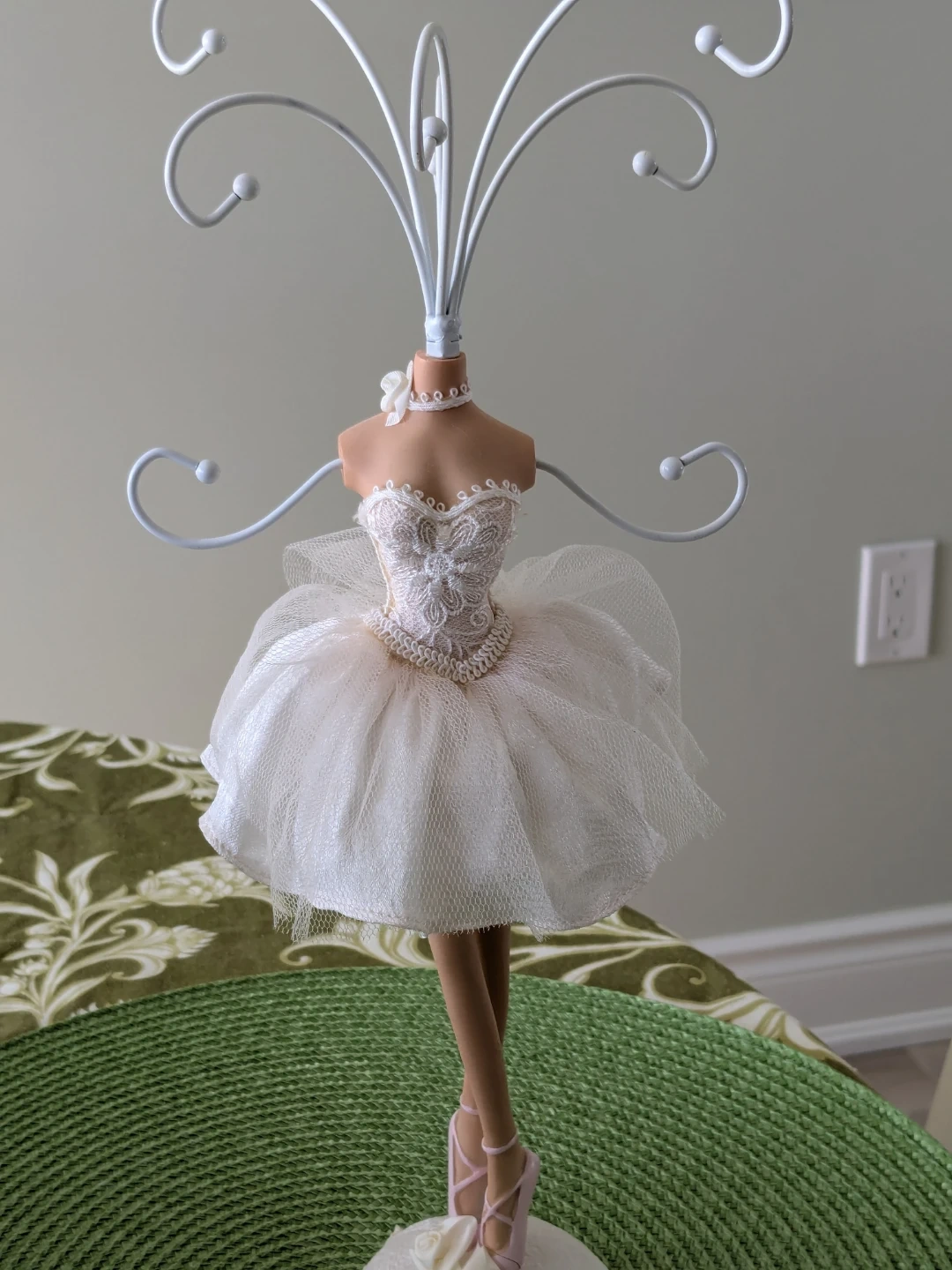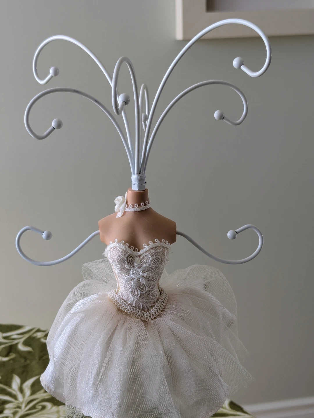 This charming jewelry organizer is shaped like a ballerina. It features a wire rack for hanging necklaces and earrings. The base is padded with lace trim.