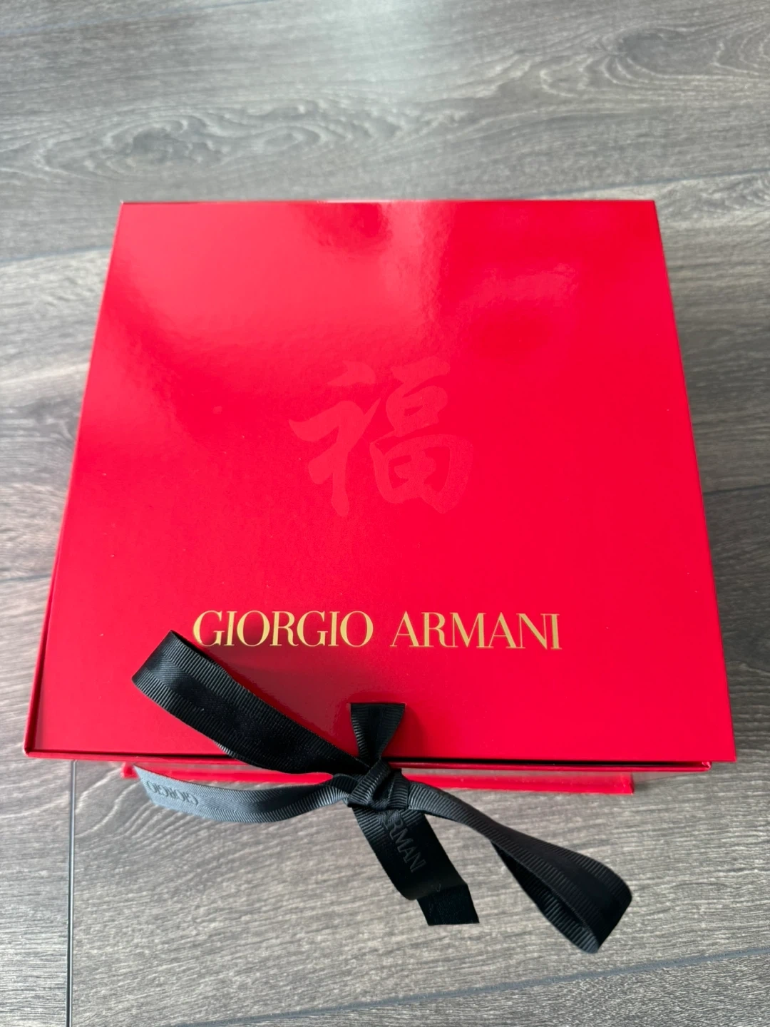 Chinese New Year Giorgio Armani gift box. It's a vibrant red colour and comes with a black ribbon. Perfect for gifting!