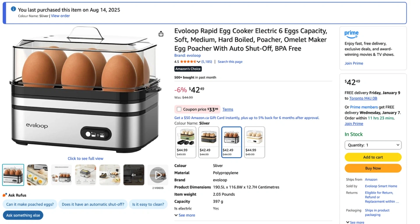 I'm selling an Evoloop Rapid Egg Cooker that's in like-new condition! It cooks up to 6 eggs at a time, whether you like them soft, medium, or hard boiled. It can even poach eggs or make omelets!
