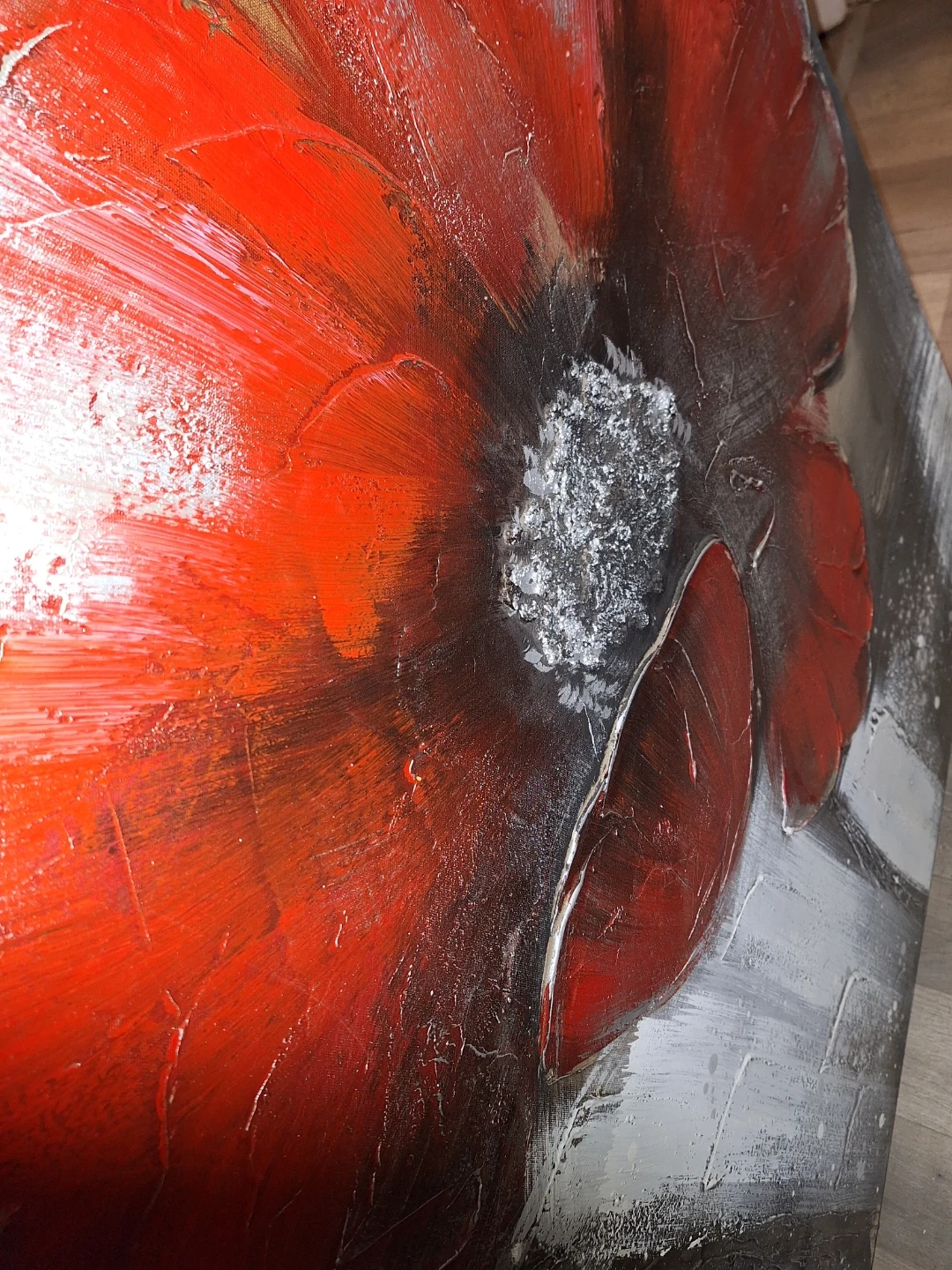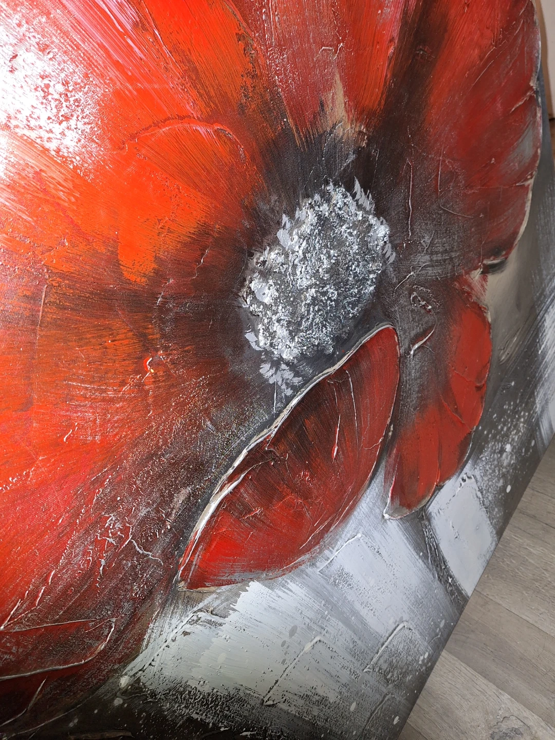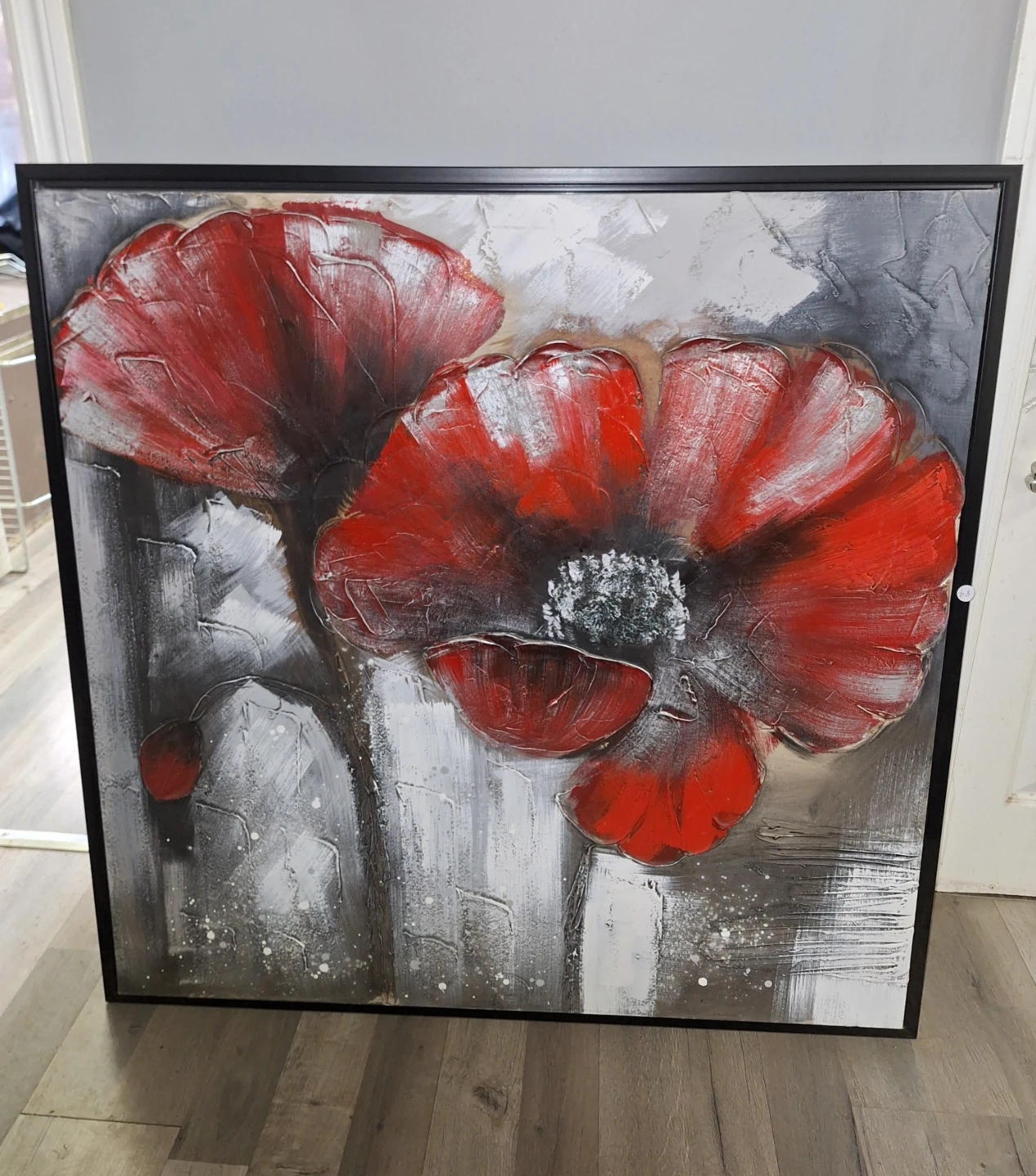 Beautiful red poppy painting with black and grey background on canvas with black frame. The artwork has thick brushstrokes and texture.