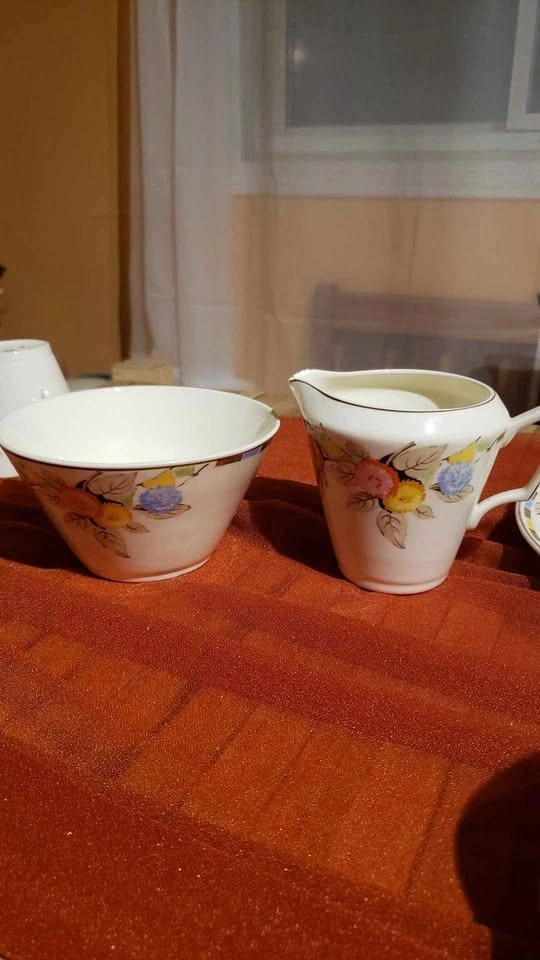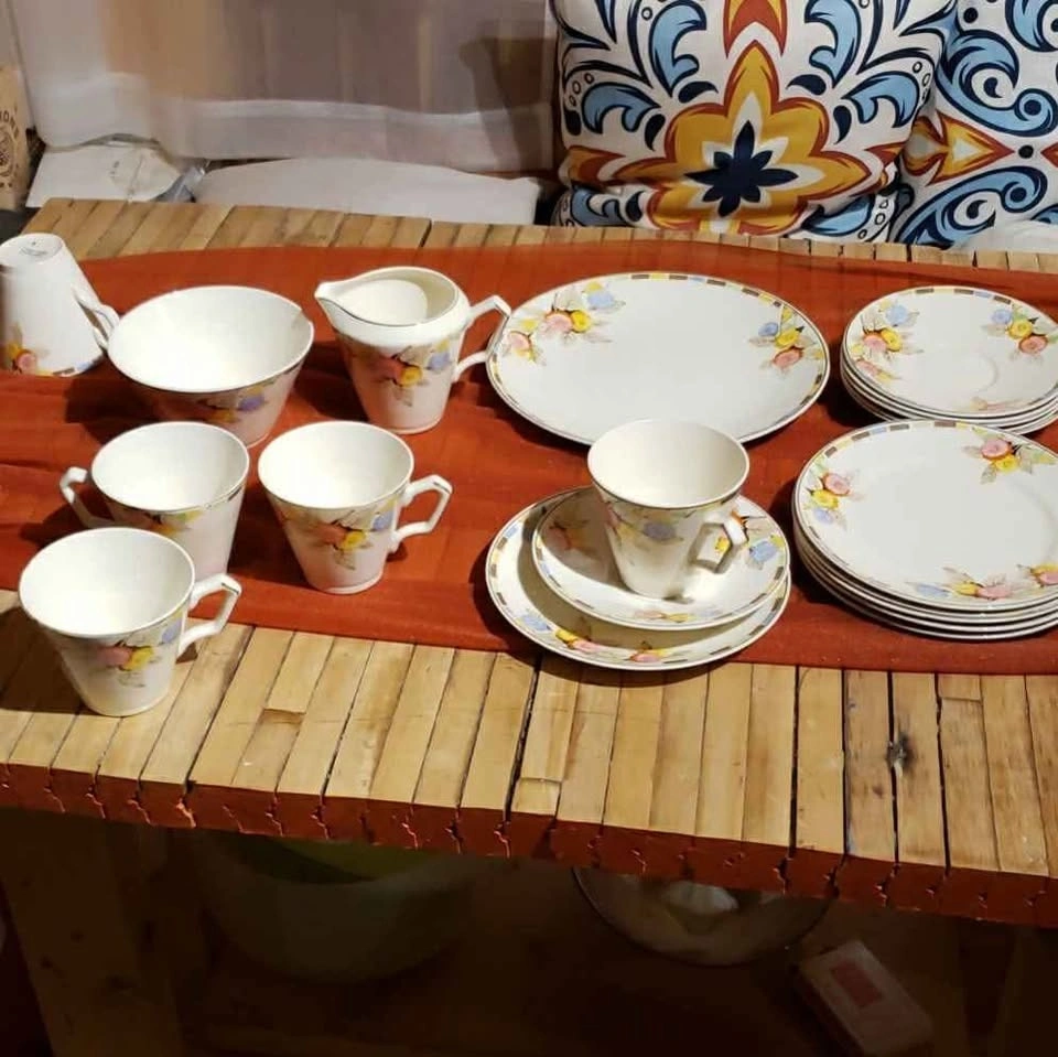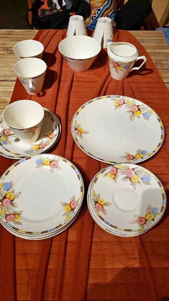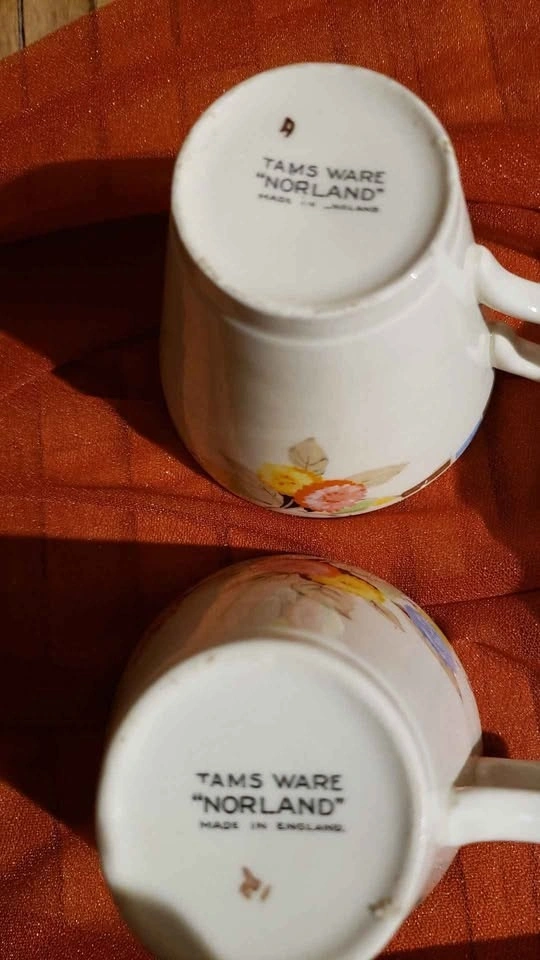 Used Tams ware "Norland" tea set made in England. The set has small milk pitcher an open sugar bowl, 5 cups (one is cracked), 6 tea cup saucers, 6 serving saucers and a serving plate. $10