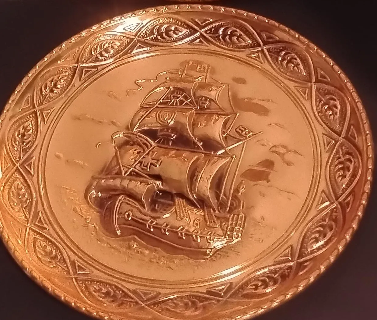 Selling a vintage decorative plate featuring a detailed ship design. It has an ornate border and appears to be made of a metallic material. It would make a great addition to a nautical-themed collection or as a unique piece of home decor