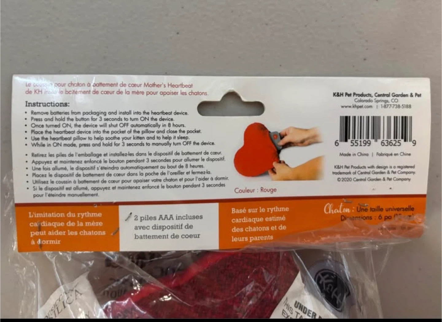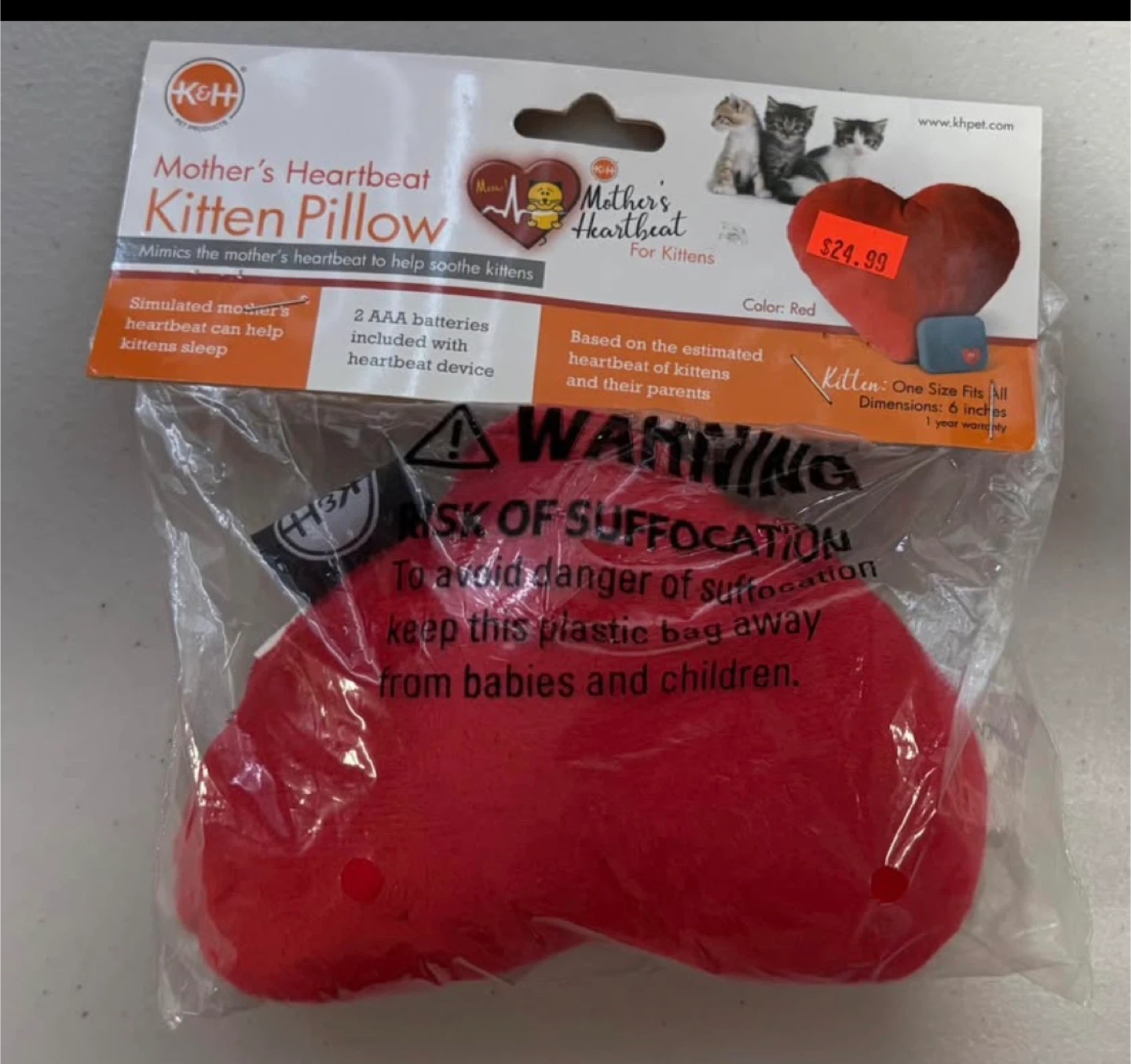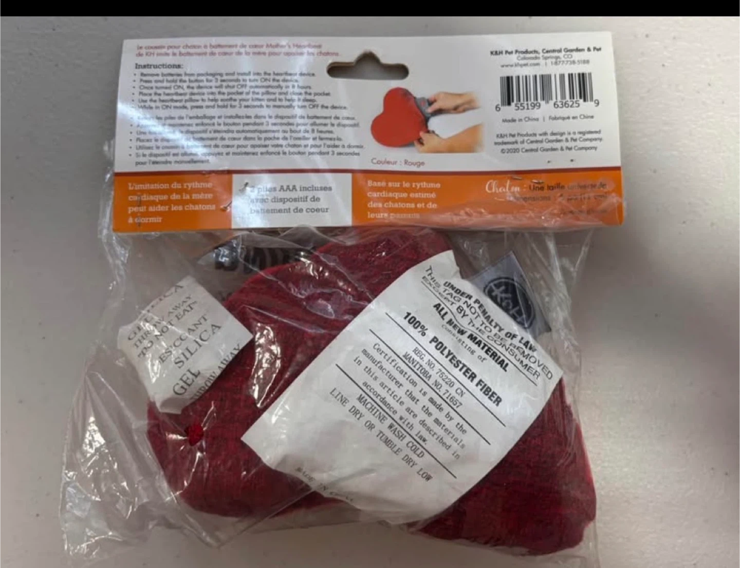 This K&H Mother's Heartbeat Kitten Pillow is designed to help soothe kittens. It mimics the mother's heartbeat to help kittens sleep. It comes with 2 AAA batteries included with the heartbeat device. The pillow is red and one size fits all kittens. Originally priced at $24.99, it's a great way to comfort your little one!