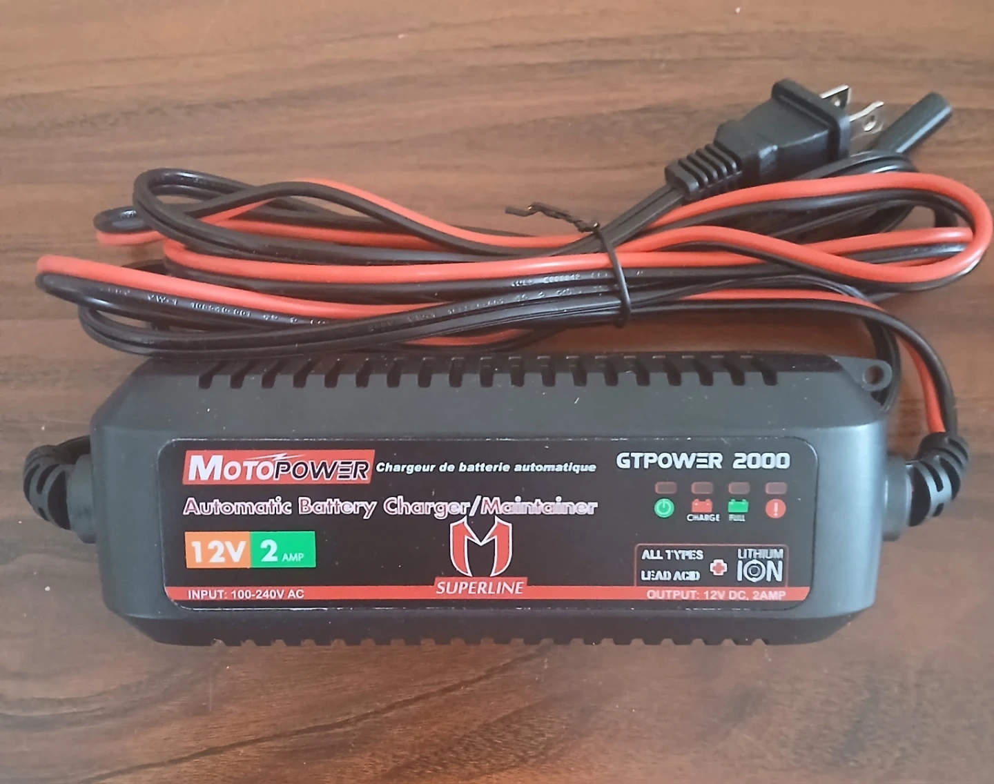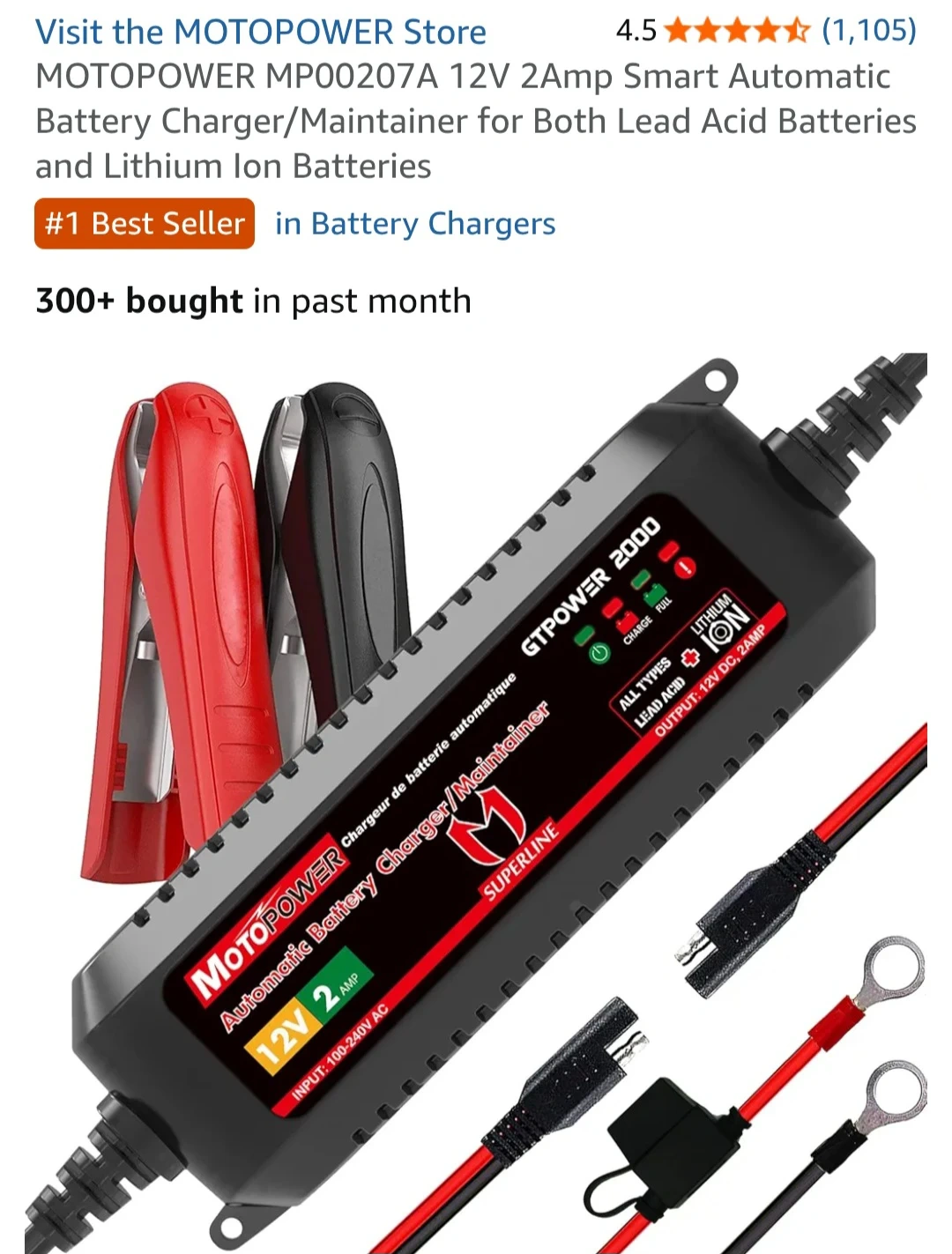 MOTOPOWER MP00207A 12V 2Amp Smart Automatic Battery Charger/Maintainer for Both Lead Acid Batteries and Lithium Ion Batteries