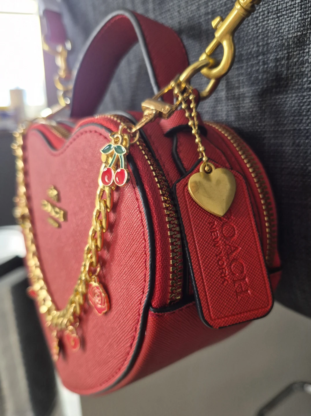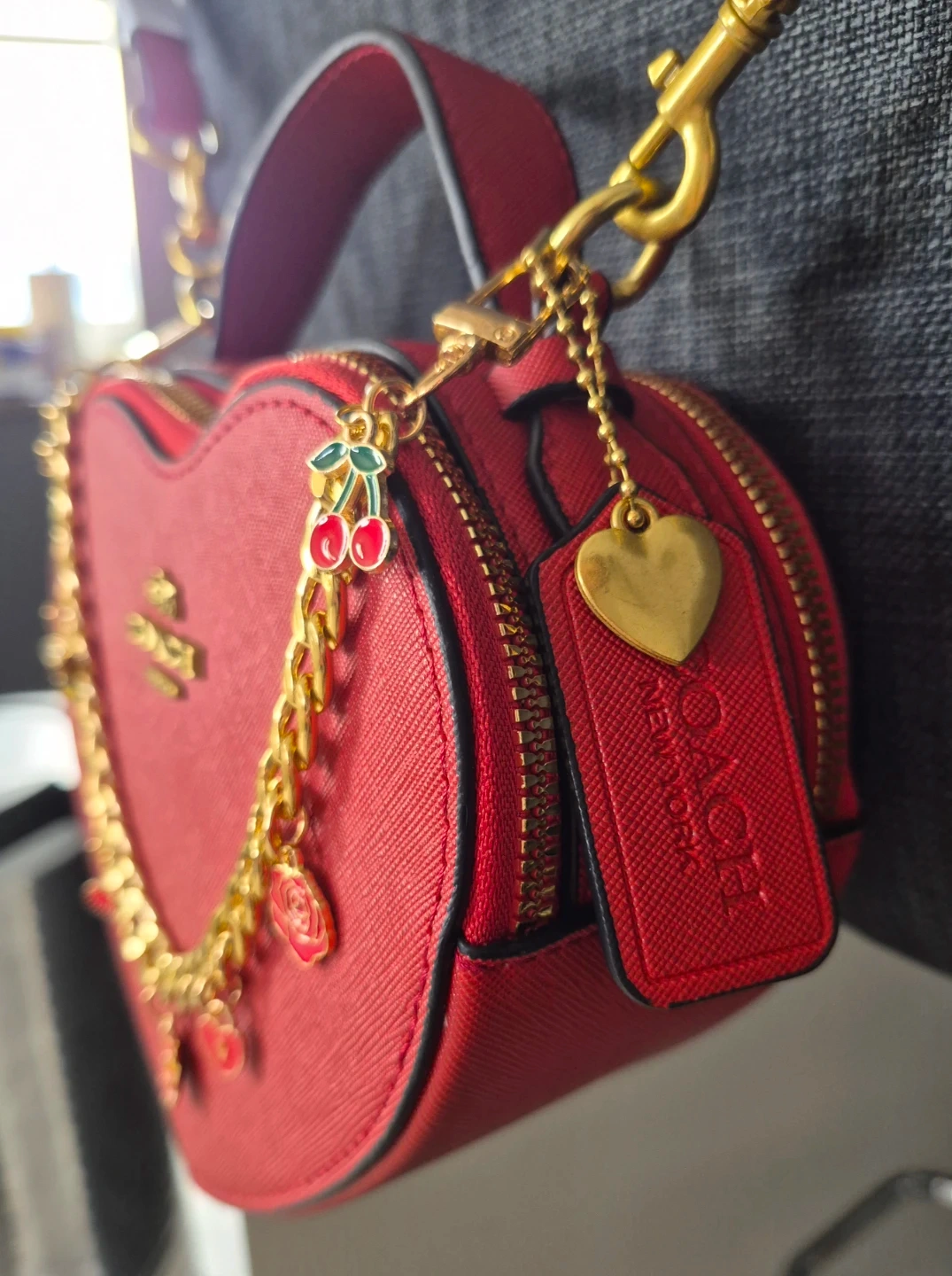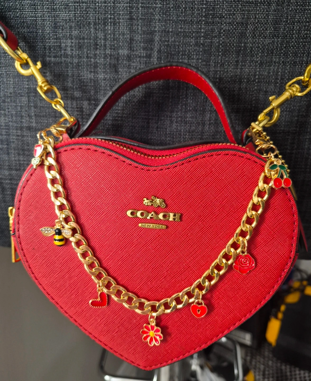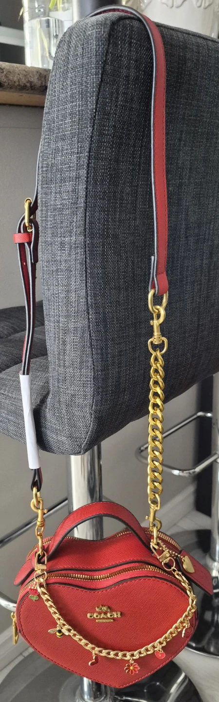 Selling a super cute Coach heart-shaped crossbody bag in red! It comes with a gold chain and adorable charms. Perfect for adding a pop of fun to any outfit