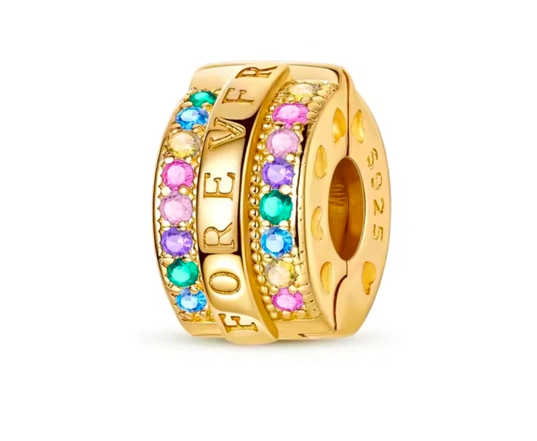This is a beautiful gold charm with the word 'FOREVER' engraved on it. It also has colourful gems around it. It is stamped S925.