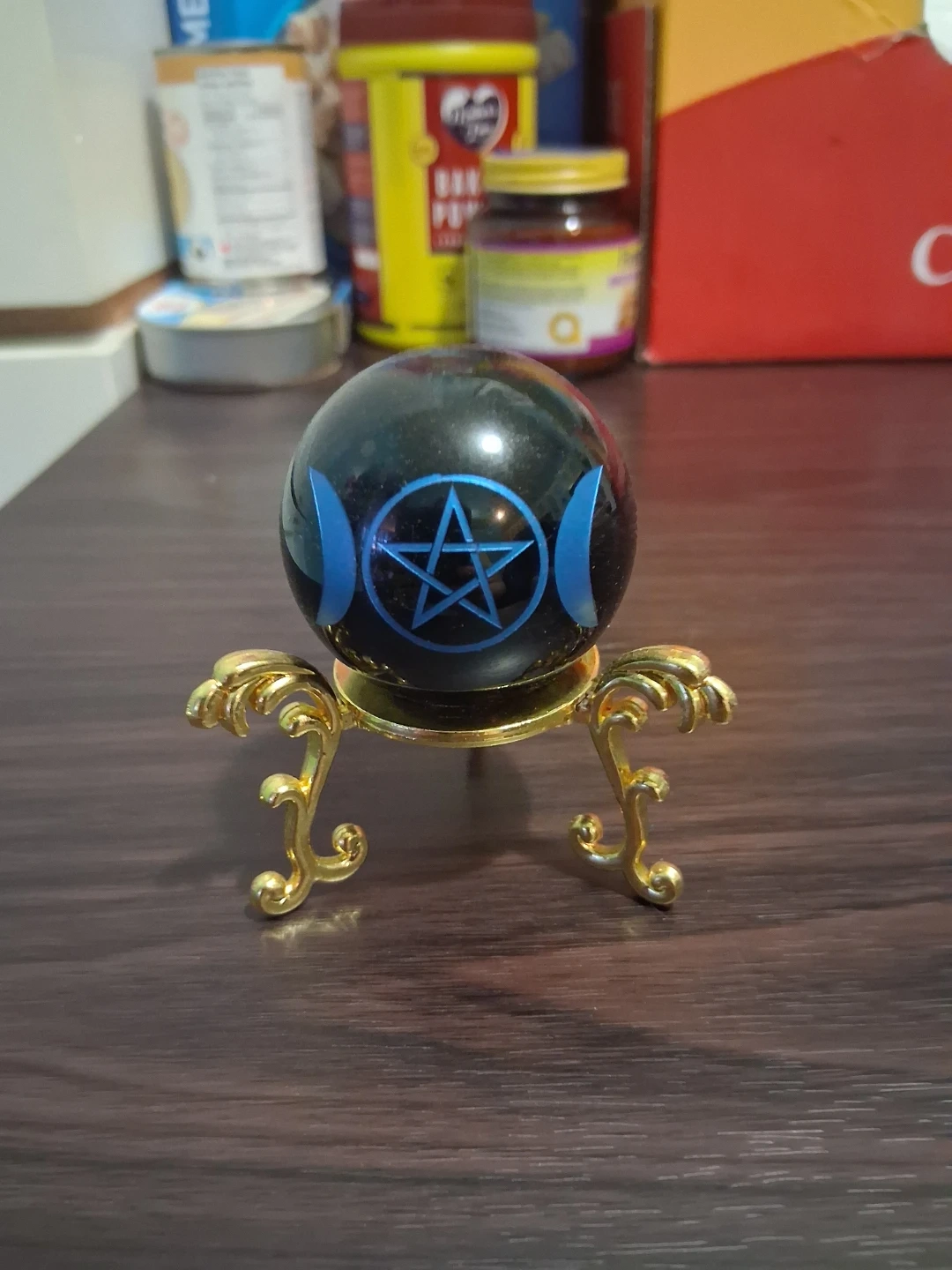 Add a touch of mystique to your space with this beautiful crystal ball! It features a striking design with a pentagram and crescent moons, perfect for anyone interested in witchcraft or unique home decor. The golden stand adds an elegant touch to this captivating piece
