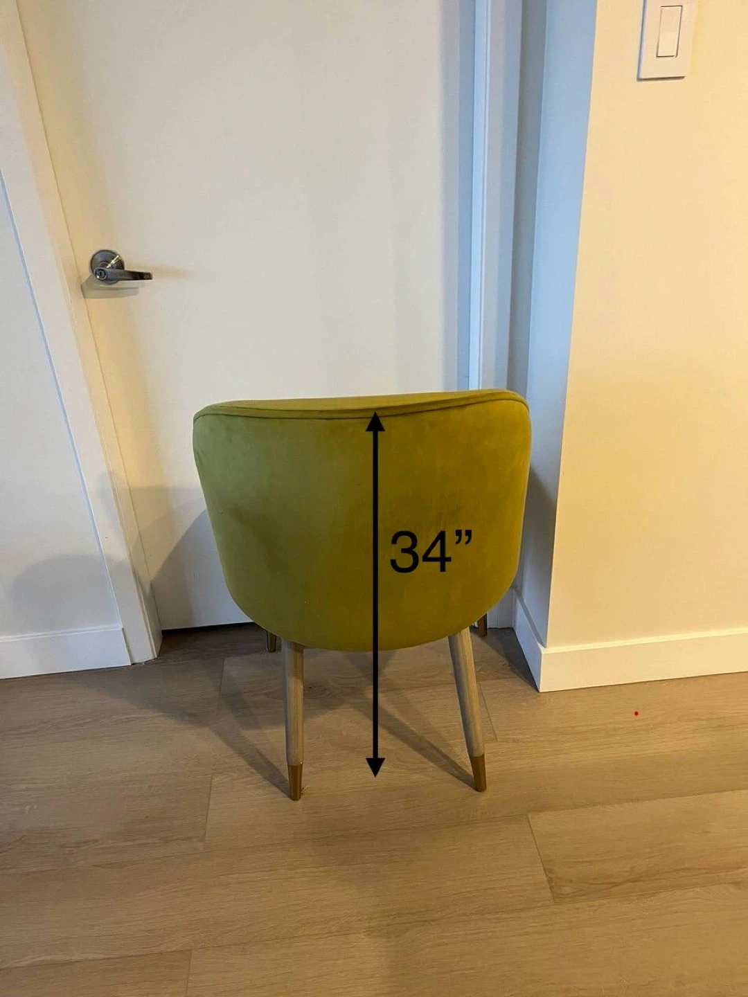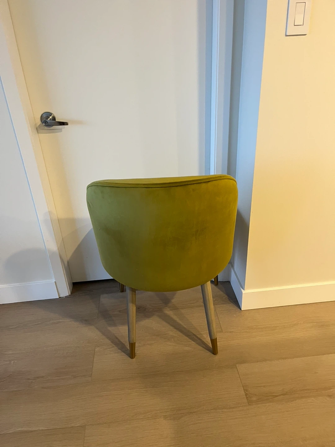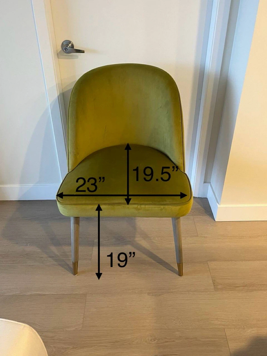 6x custom made chairs for sale. High quality easy care green velvet fabric with grey oak wood & brass gold leg.