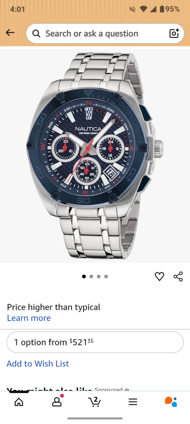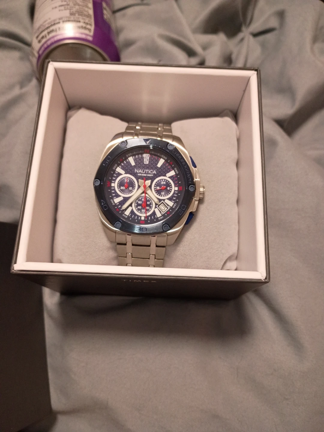 Selling a Nautica chronograph watch with a blue and silver design! It comes with its original box, brand new never worn so it's well-protected and ready for you
