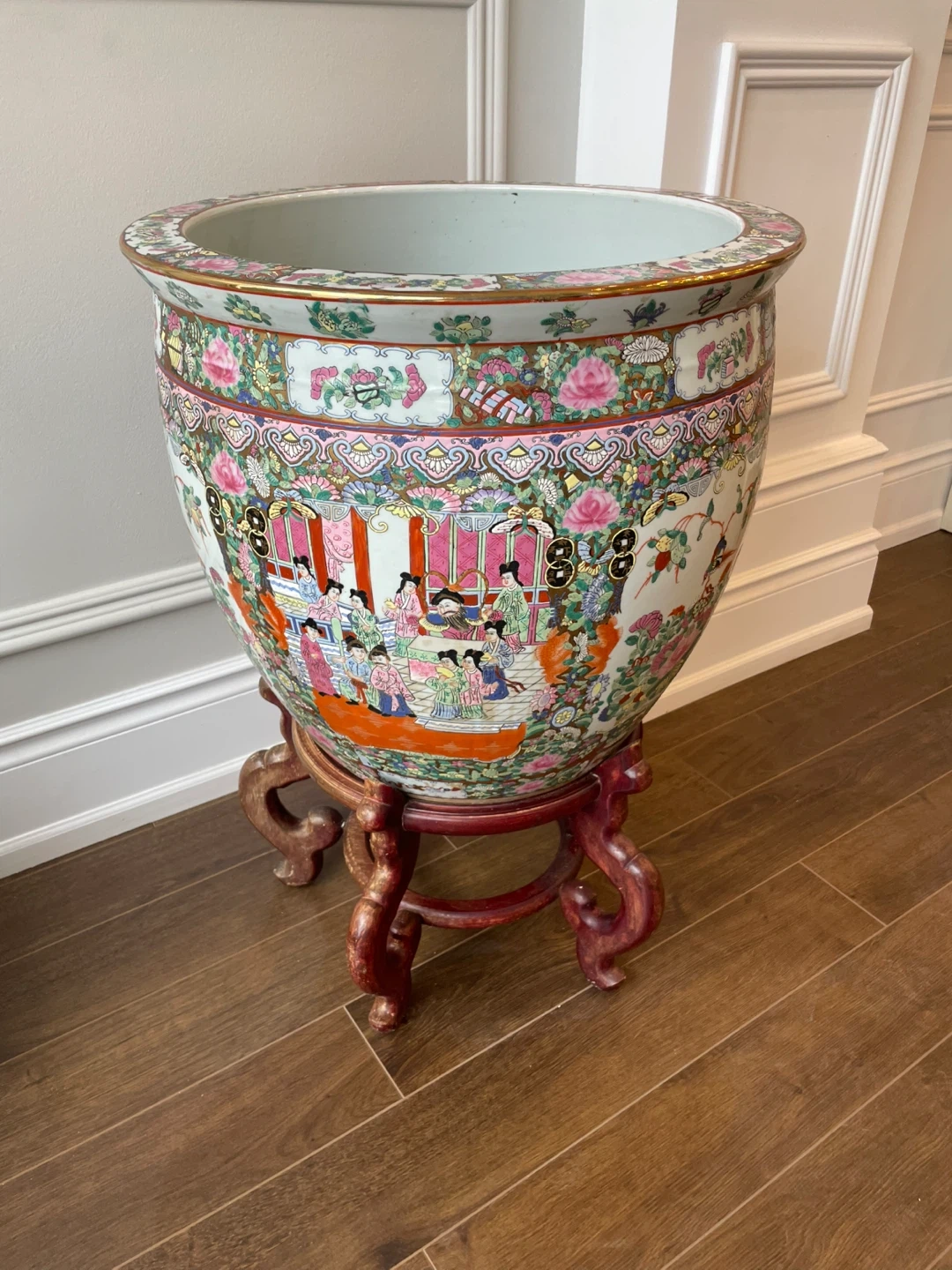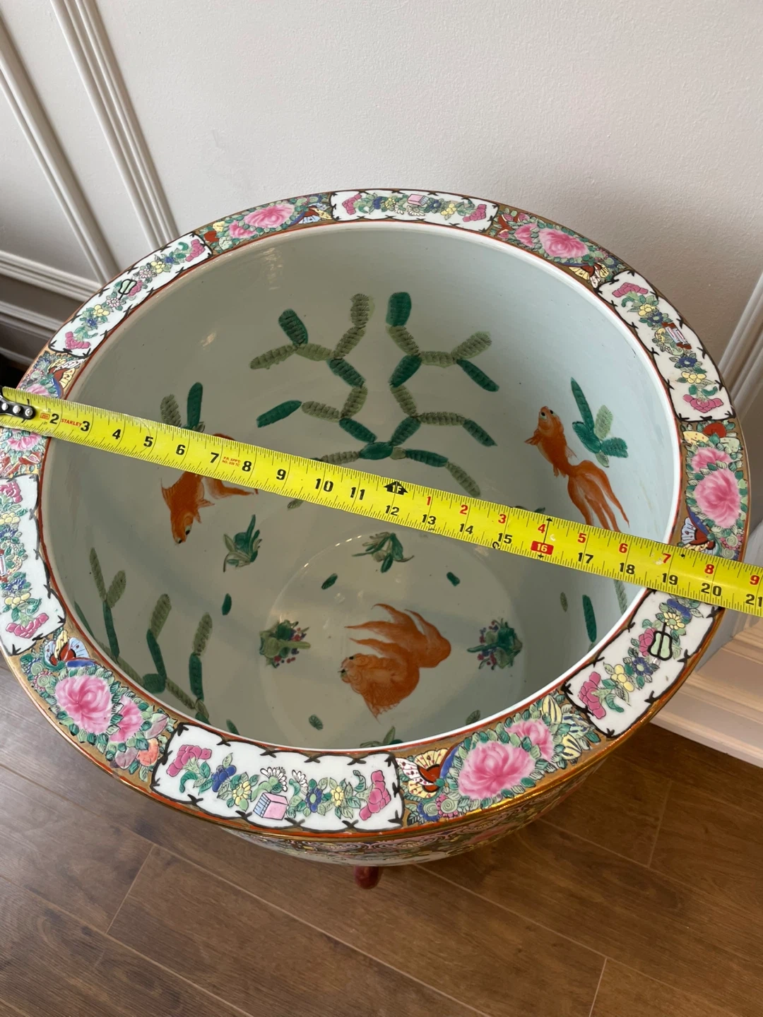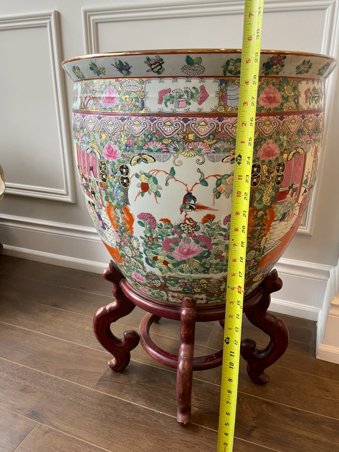 This is a beautiful, large porcelain pot! It features intricate designs and vibrant colours. The planter measures approximately 21 inches in diameter and 29inches in height including stand. Perfect for adding a touch of elegance to your home or garden