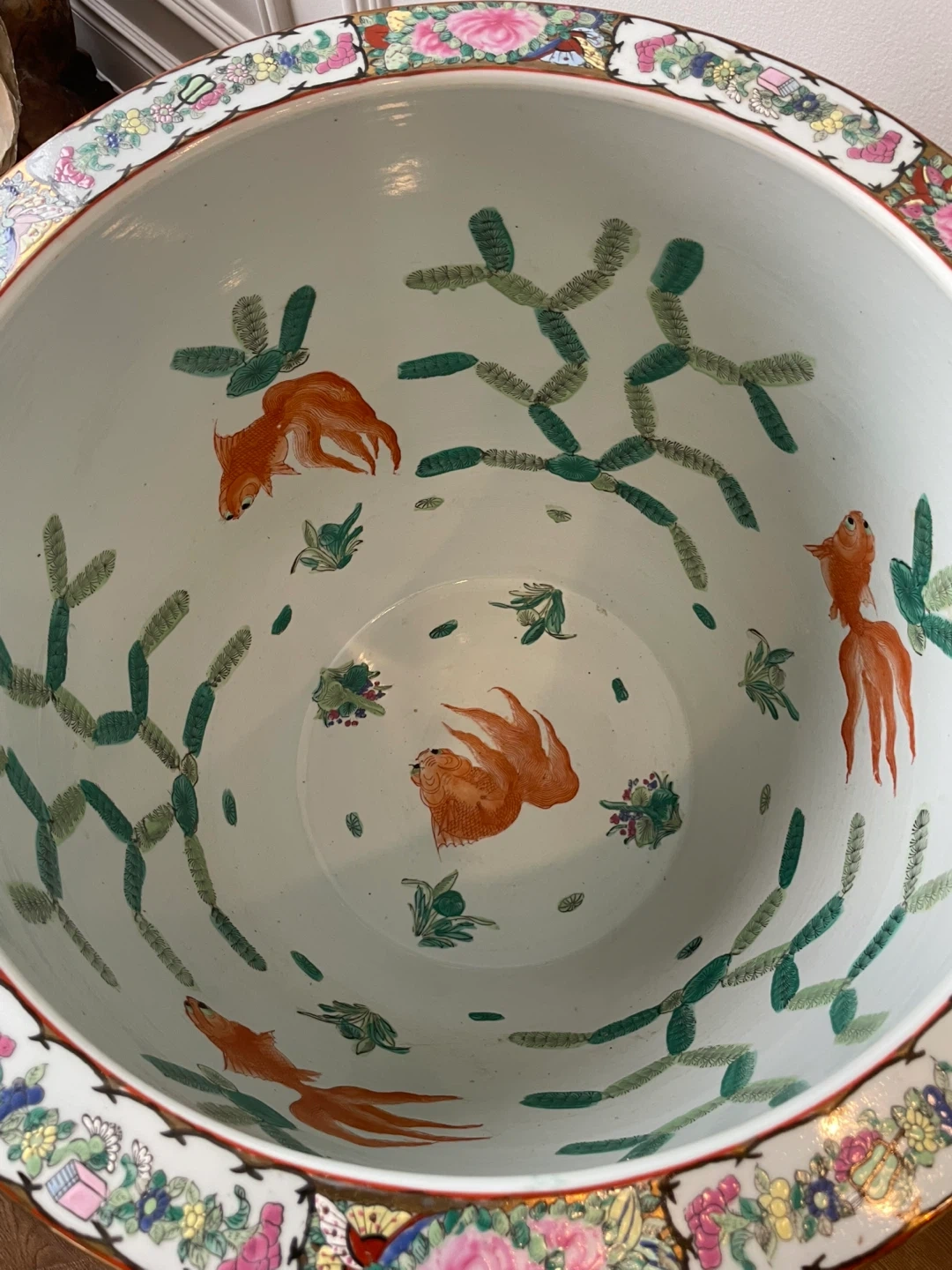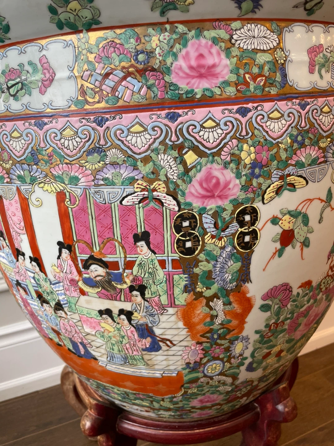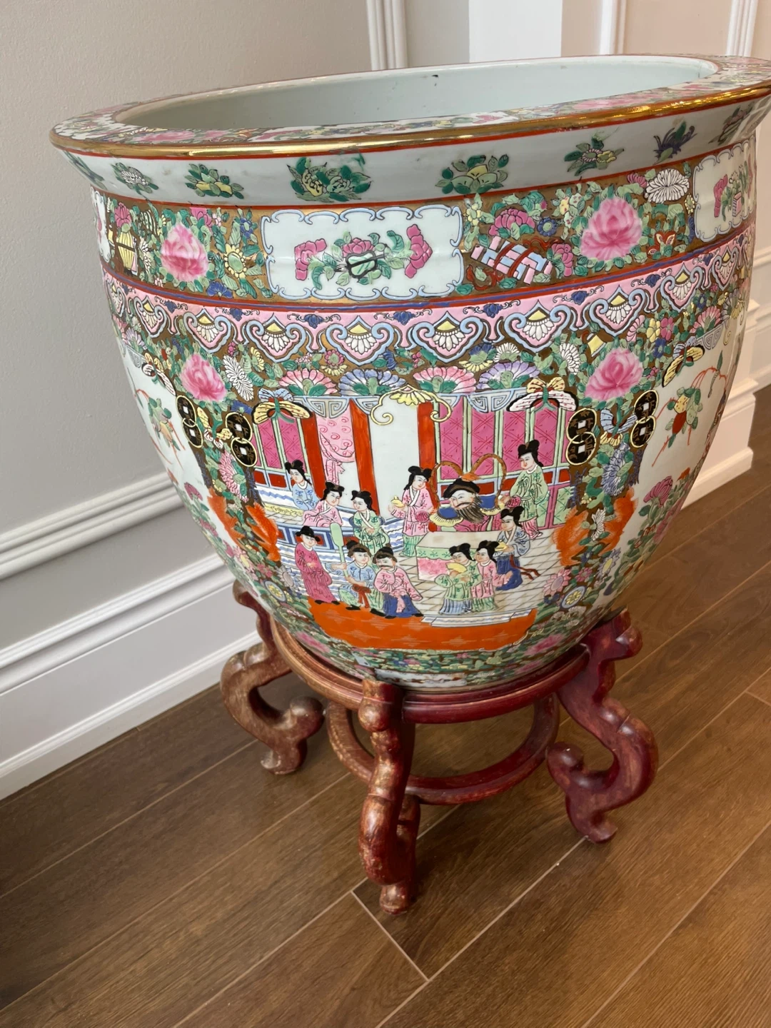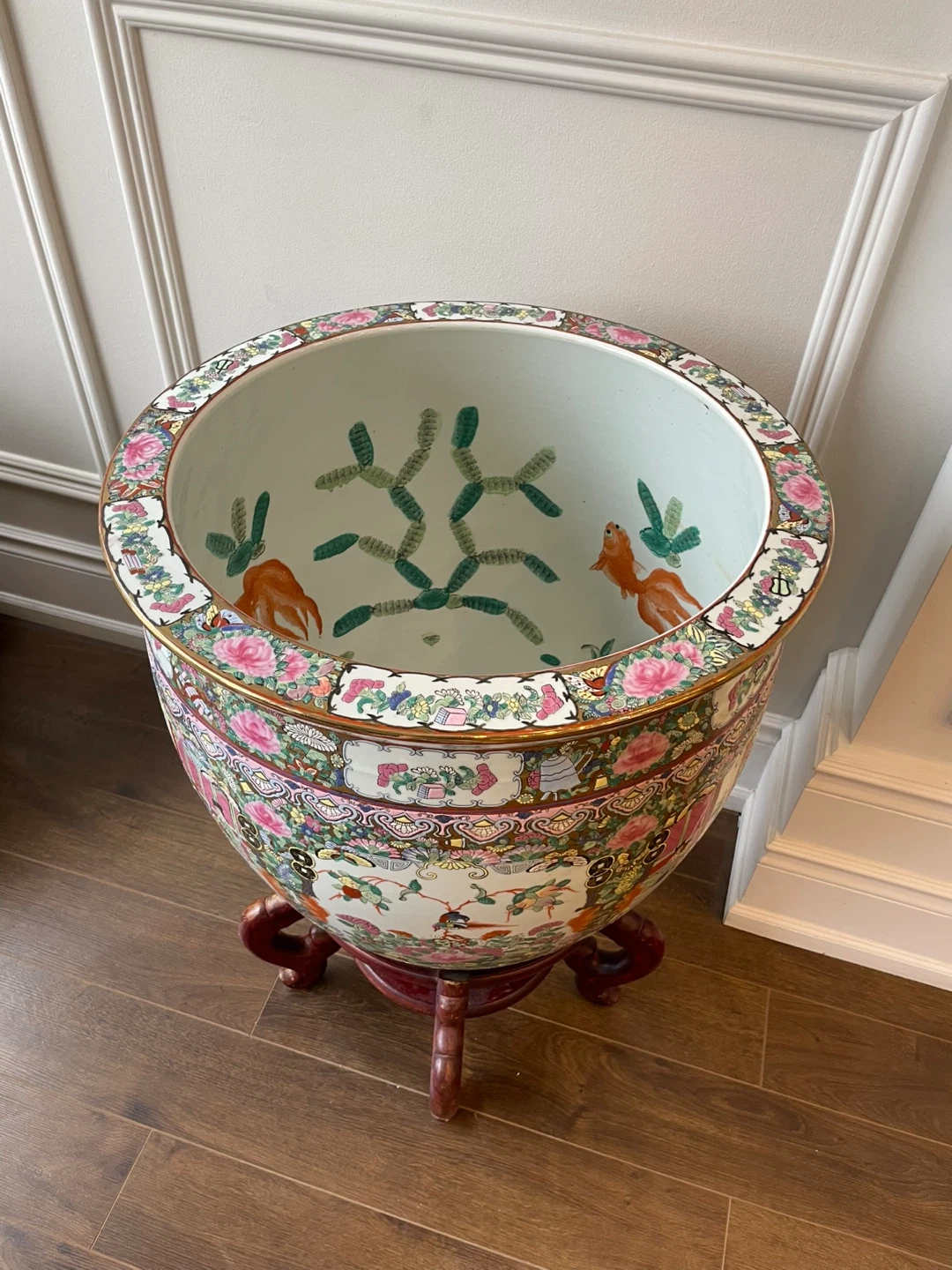 This is a beautiful, large porcelain pot! It features intricate designs and vibrant colours. The planter measures approximately 21 inches in diameter and 29inches in height including stand. Perfect for adding a touch of elegance to your home or garden