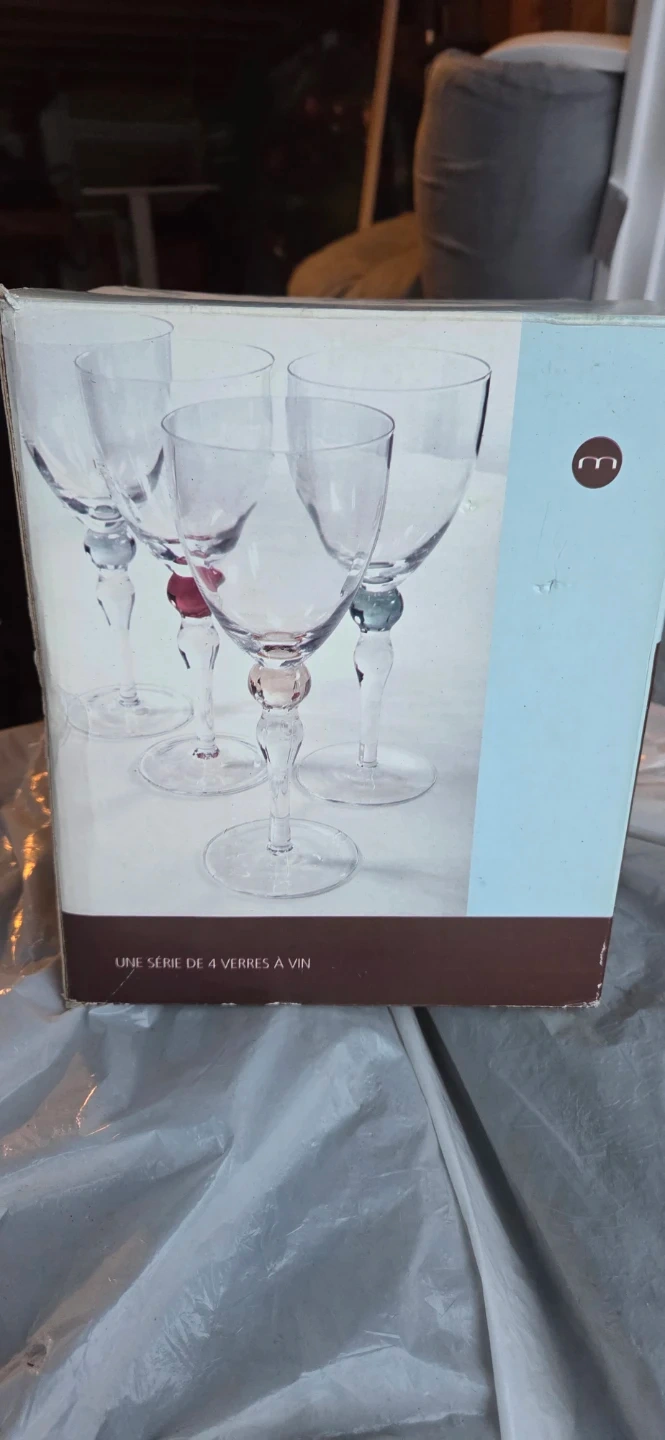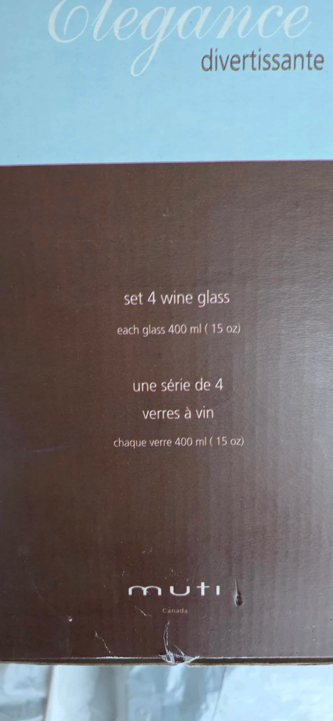 Selling a set of 4 Muti Elegance wine glasses! Each glass holds 400 ml (15 oz). They come in the original box, perfect for gifting or adding a touch of elegance to your dining table