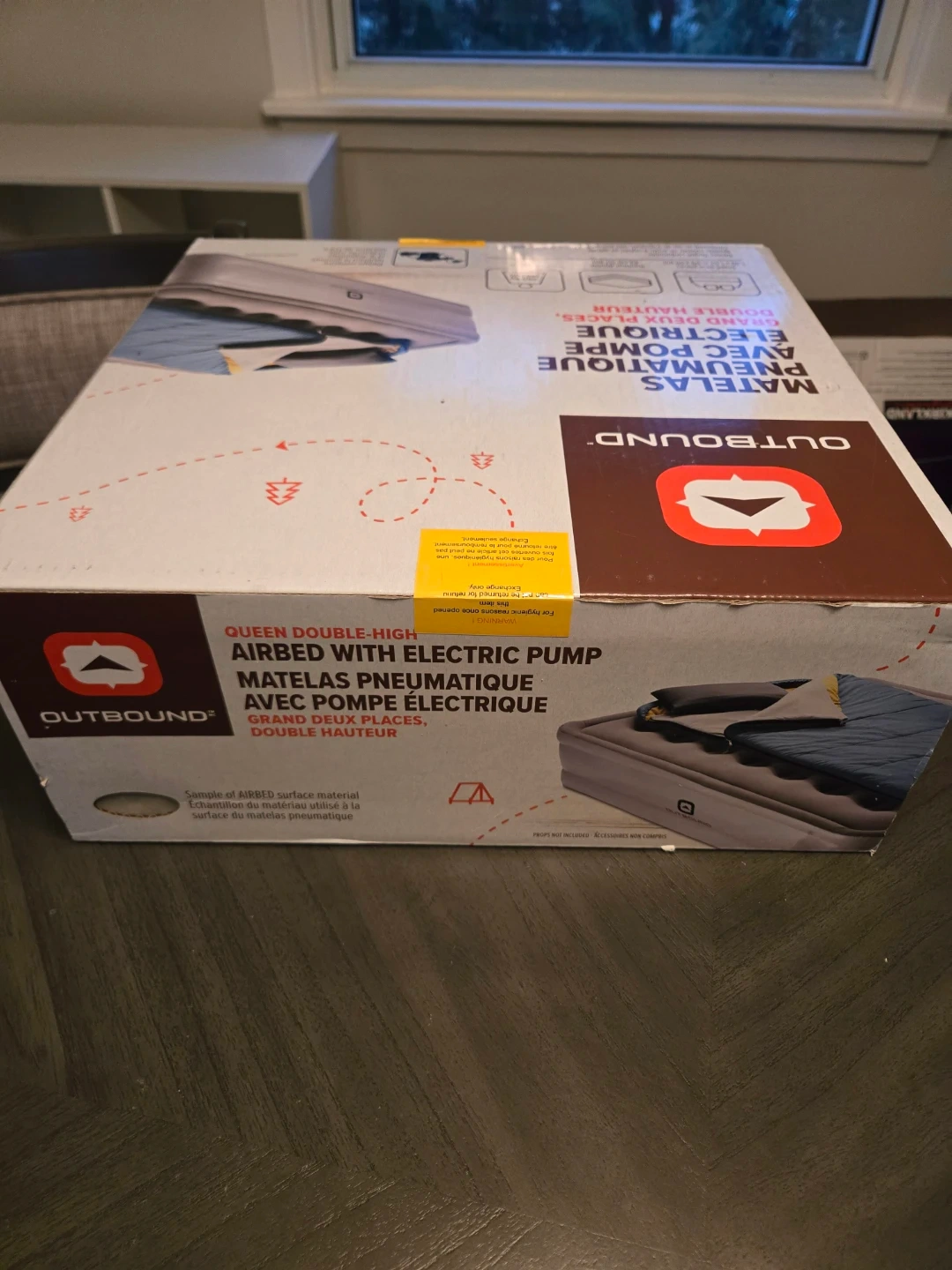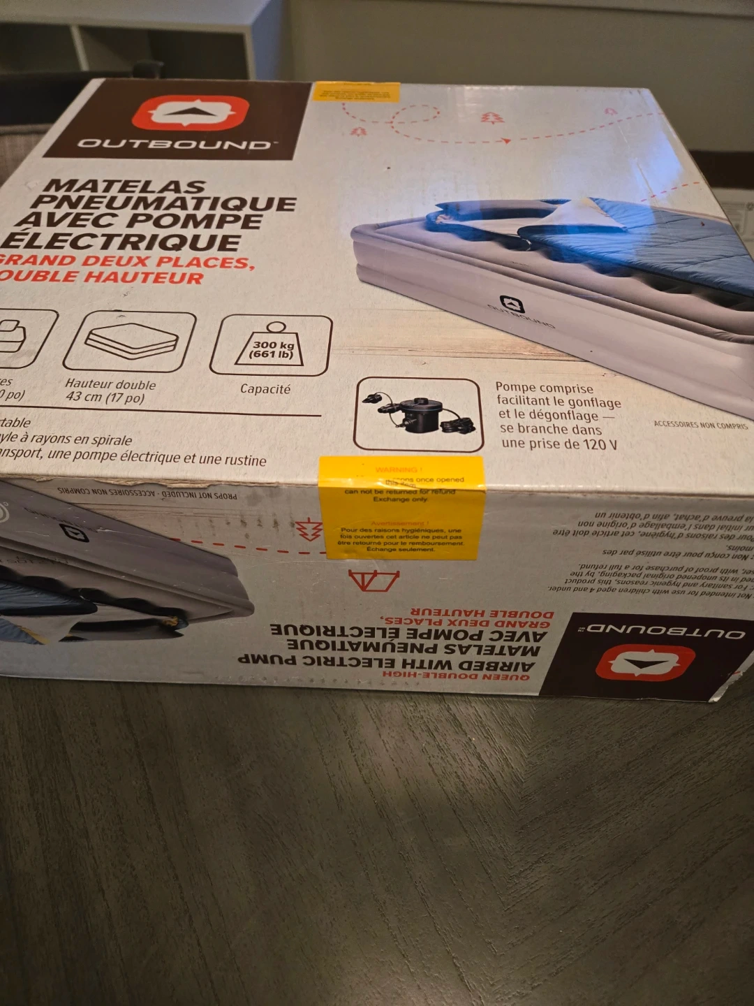 Selling a brand new unopened Outbound Queen Double-High Airbed with Electric Pump.