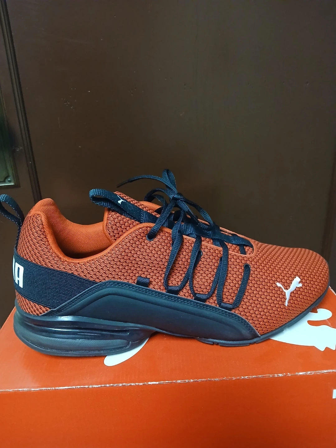Selling a pair of size 13m Puma Axelion running shoes for men. They have a stylish design and are in good condition. The color is a mix of red and black. Perfect for running or casual wear!