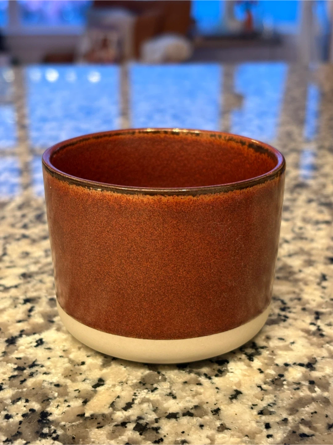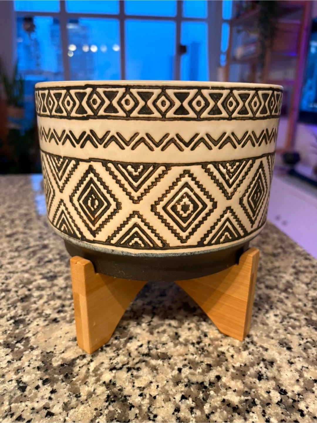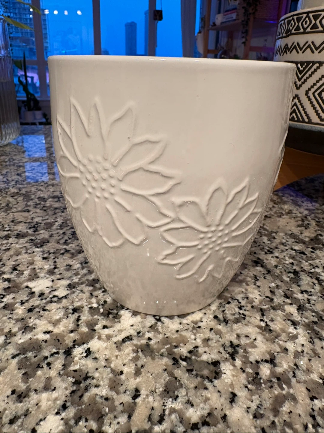 Selling a few decorative plant pots. There's a white taller pot with raised floral pattern $8 (5.5x5β), a brown pot with a white base $5 (2.5x3β), and a patterned pot on a wooden stand $10 (5x7β). There is a small chip on the flower pot but itβs very small and not noticeable. Would prefer to sell altogether so priority will be given there.