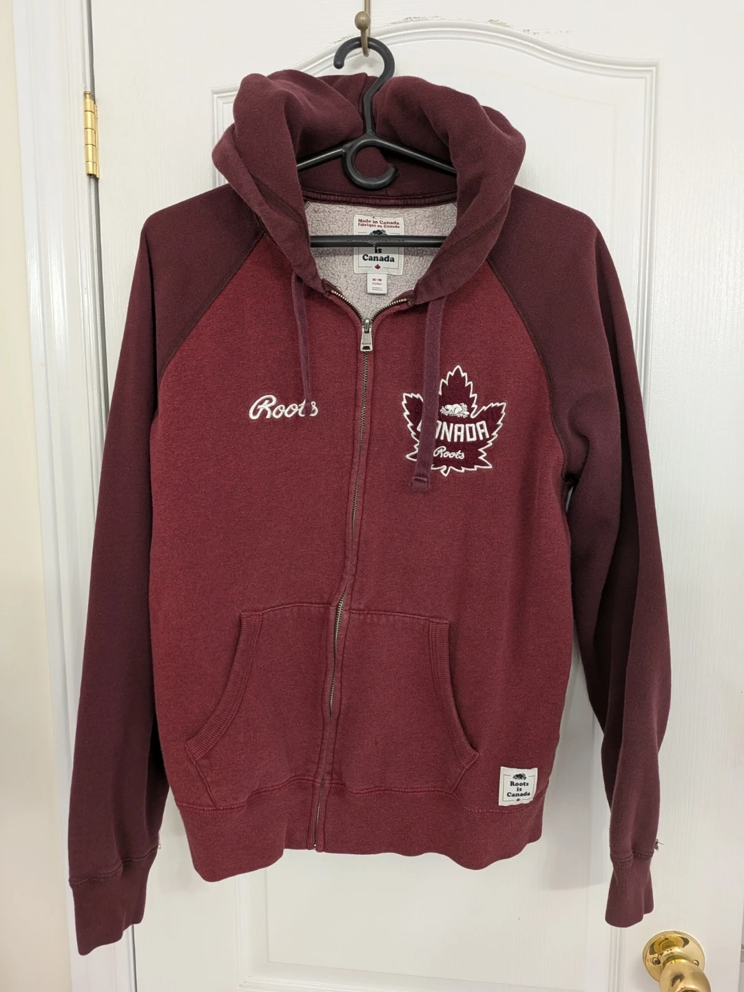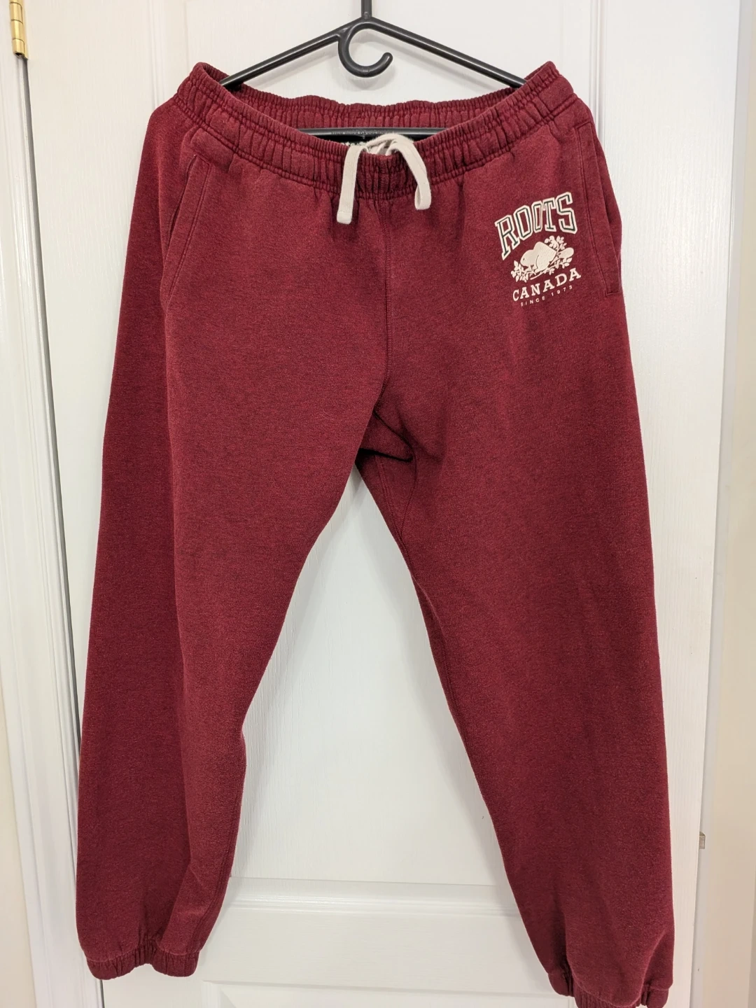 Selling a comfy Roots set in a lovely burgundy colour! The set includes sweatpants and a zip-up hoodie. Both are in great condition and perfect for cozy days or casual outings. Size M/M