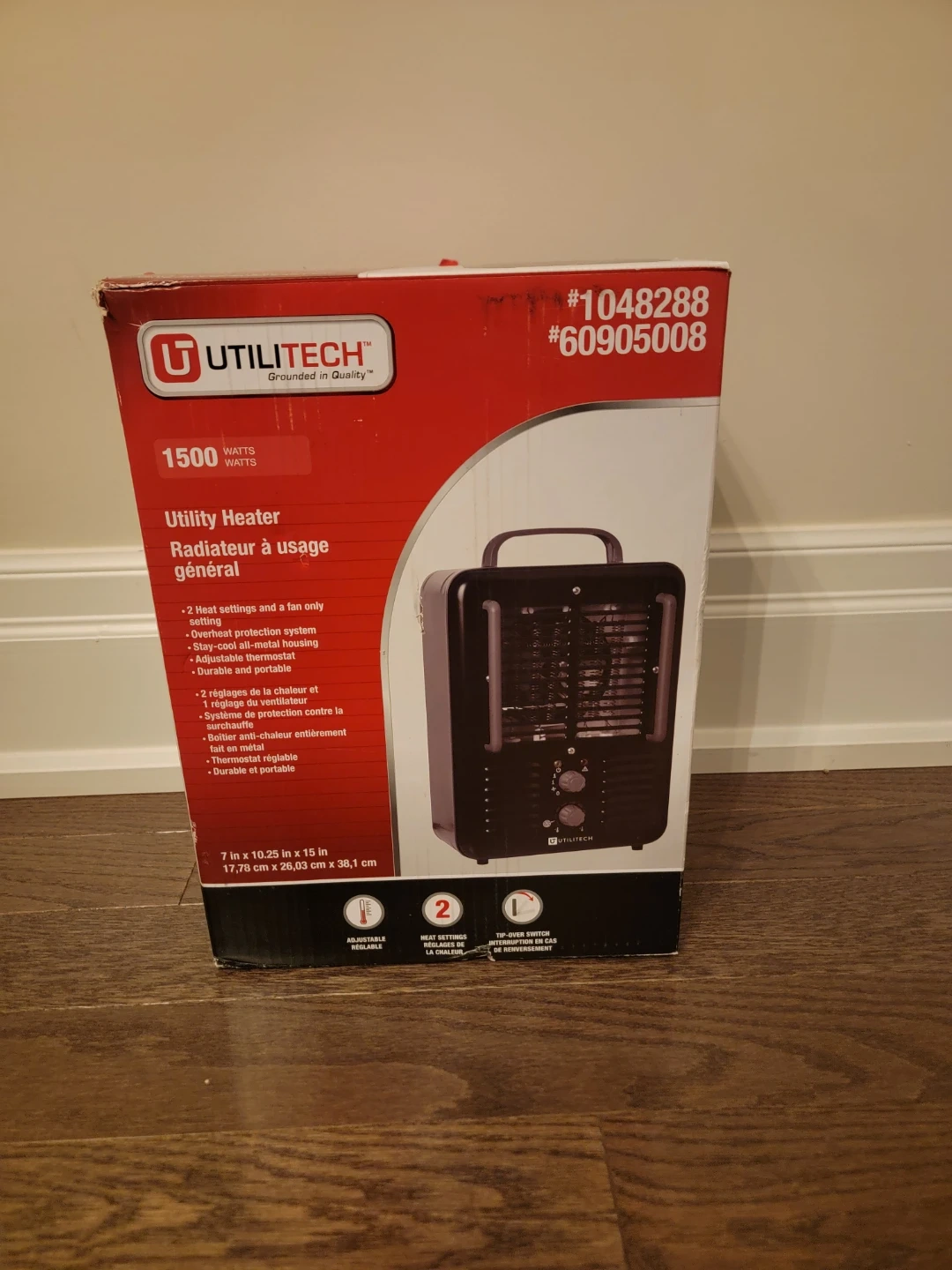 Selling a Utilitech Utility Heater in excellent condition! It's a 1500 watt heater with 2 heat settings and a fan-only setting. It also has a stay-cool all-metal housing and is durable and portable. The box is included. Dimensions are 7 in x 10.25 in x 15 in.