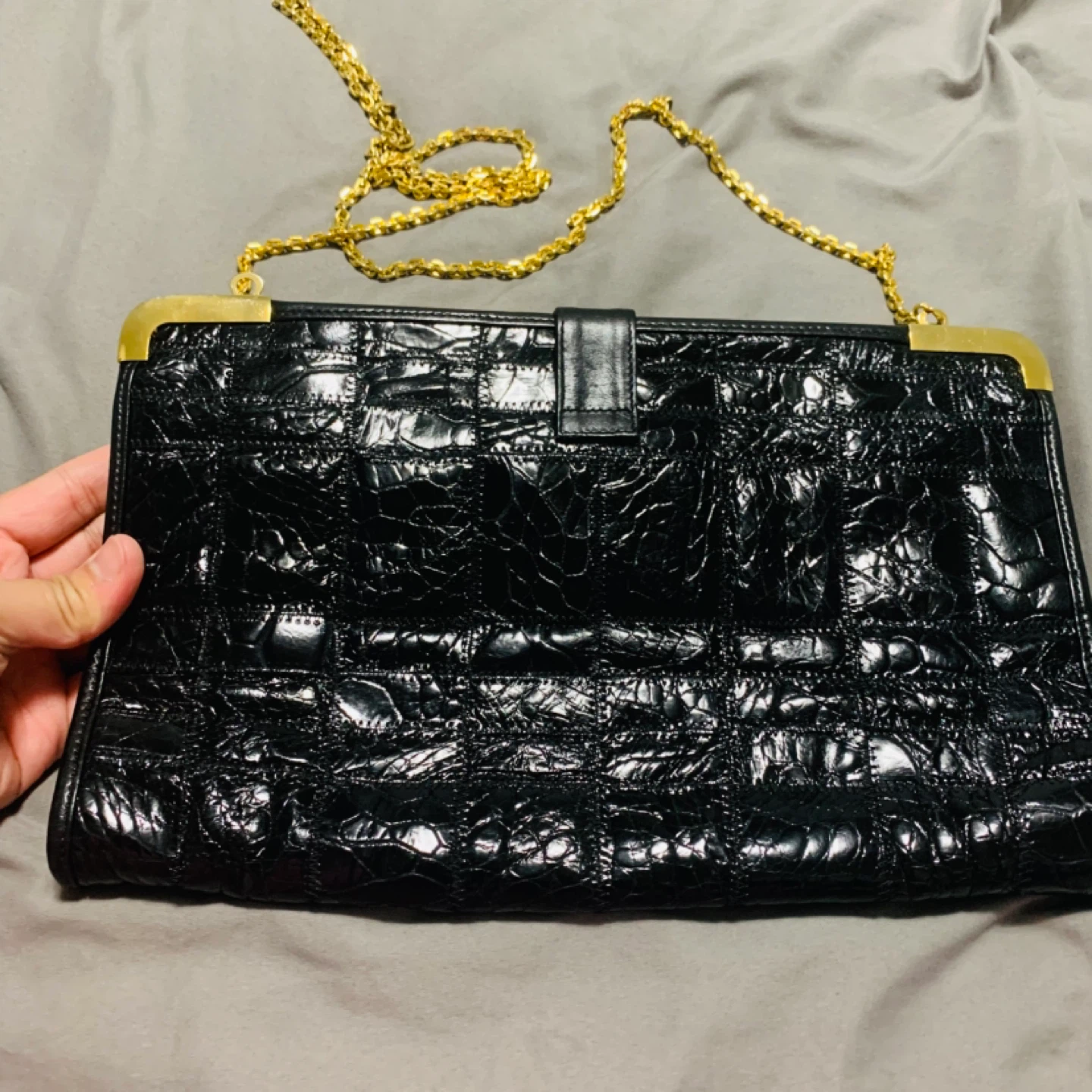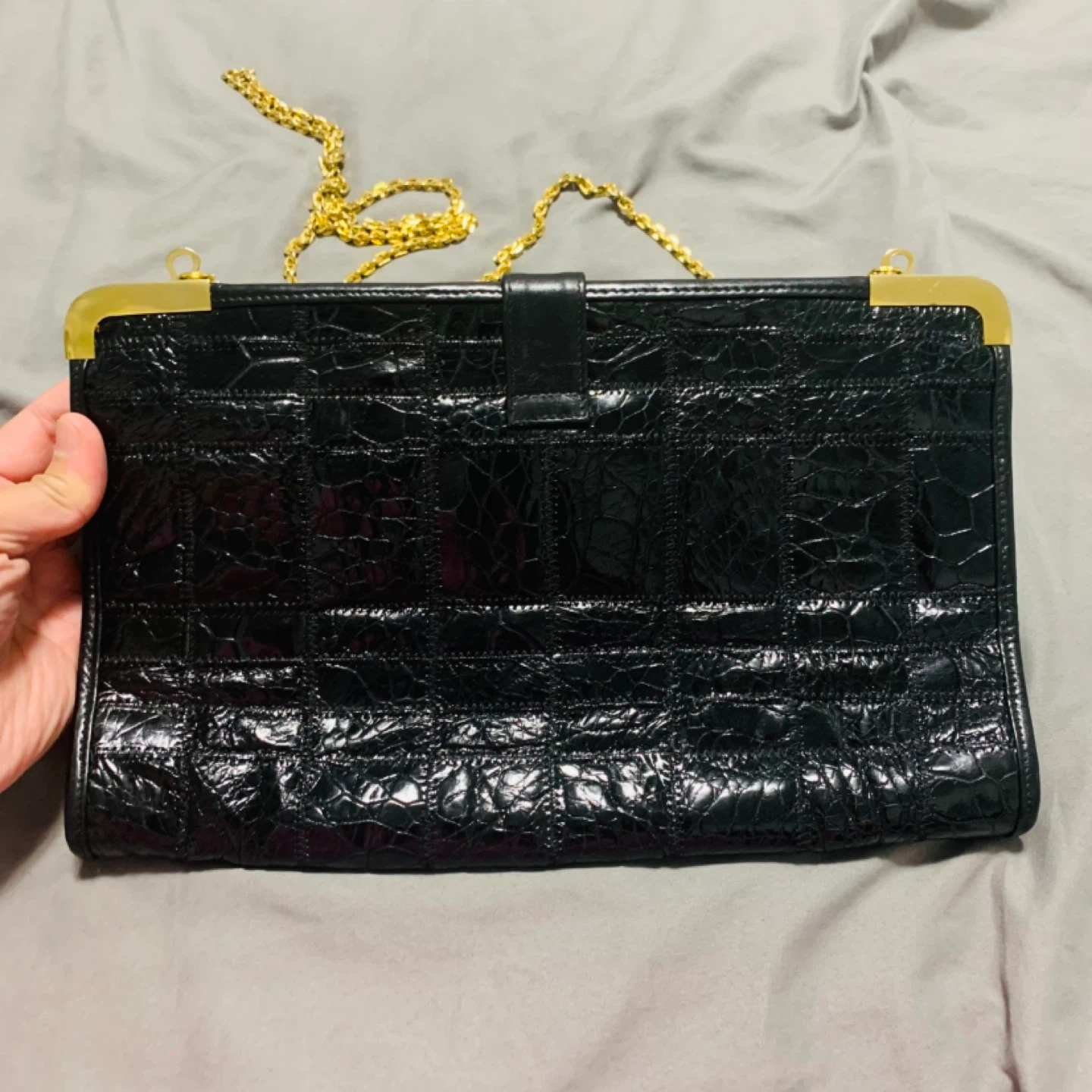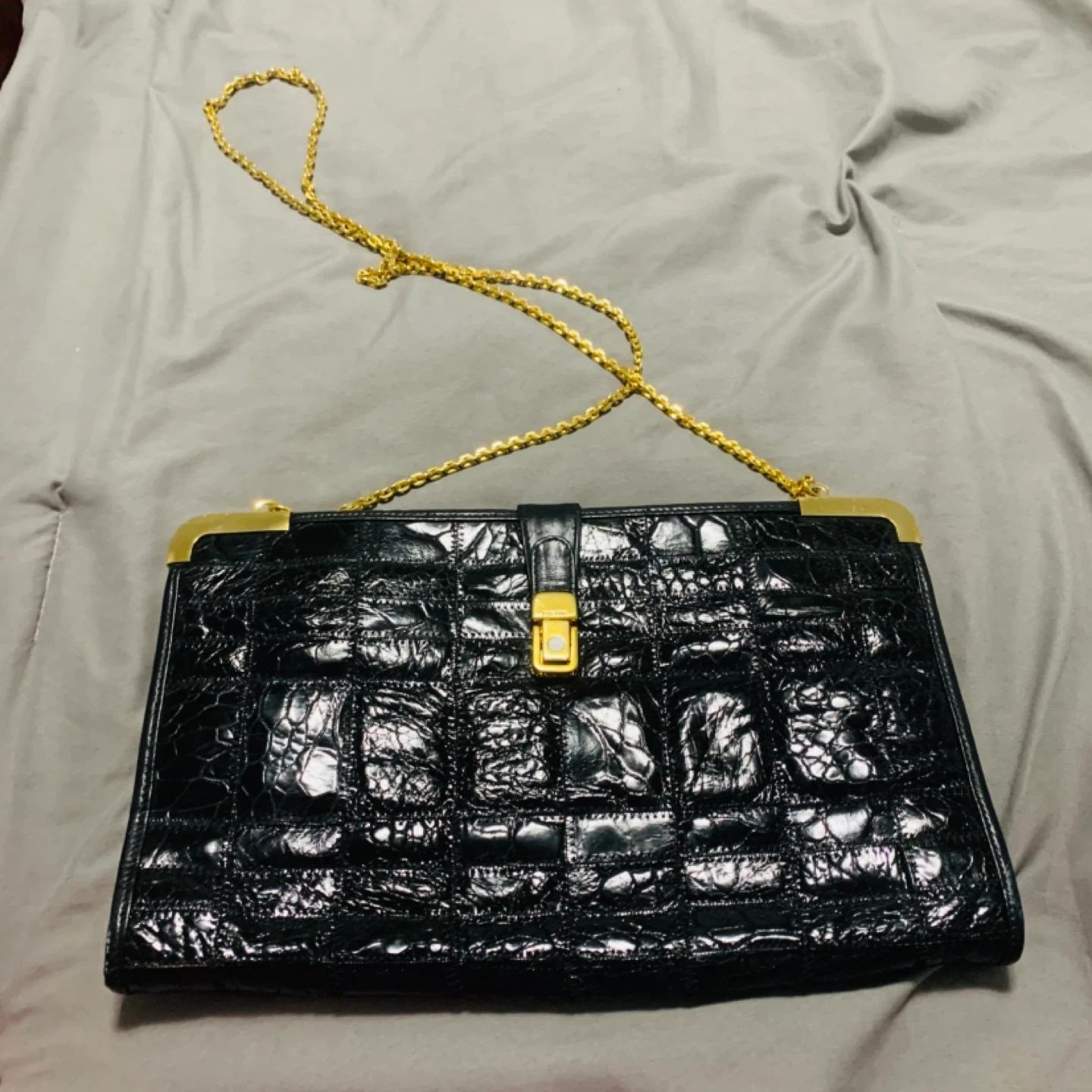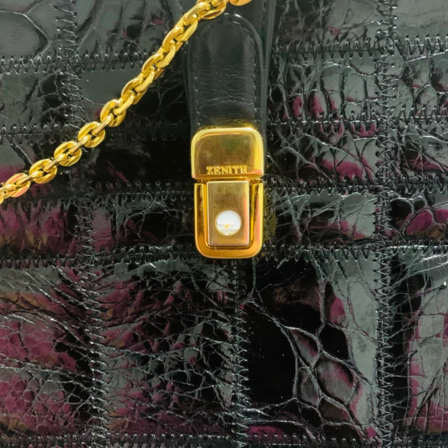 This is a beautiful vintage Zenith bag with a unique croc-embossed leather design in black. It features a gold-tone clasp and chain, adding a touch of elegance to the overall look. Perfect for a night out or special occasion!