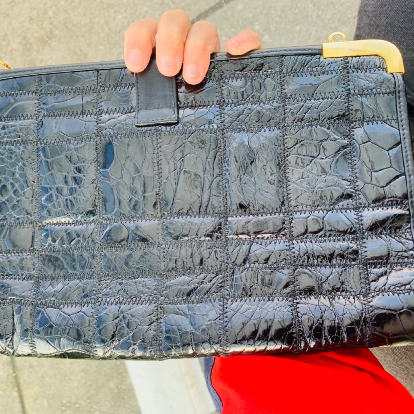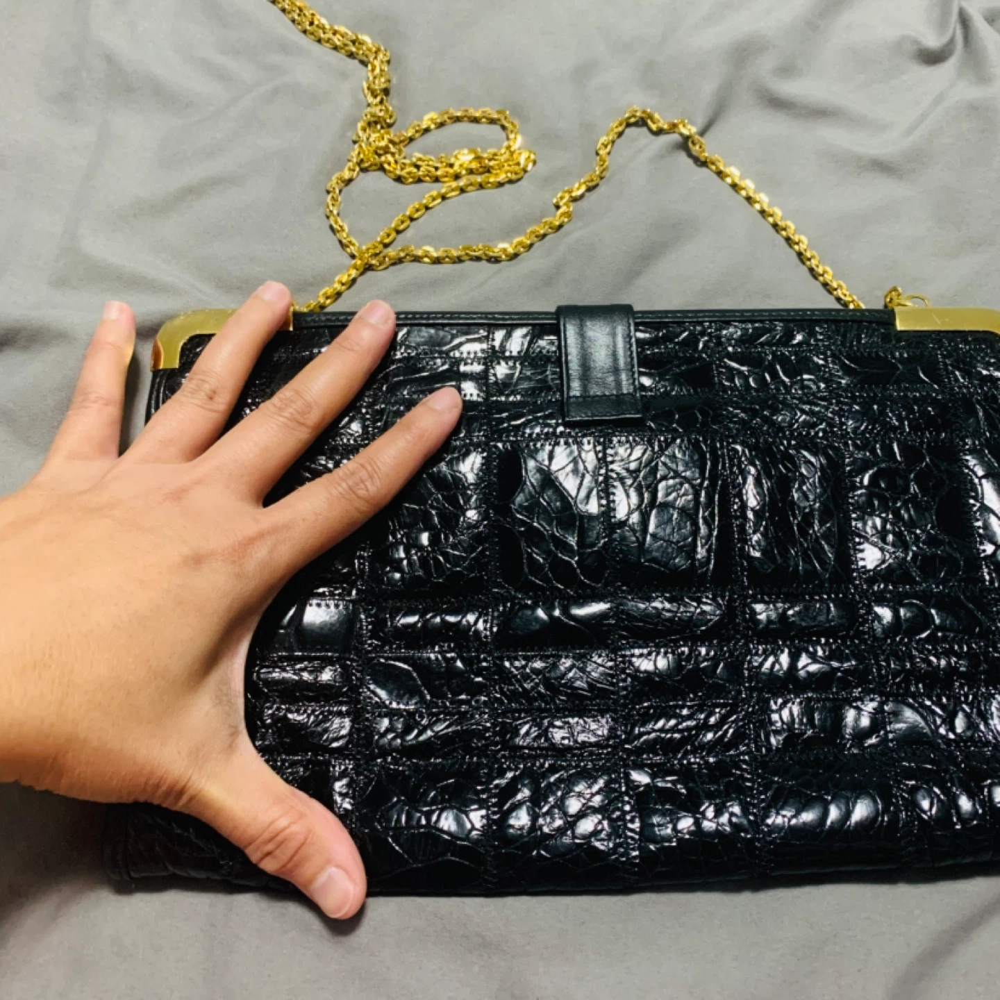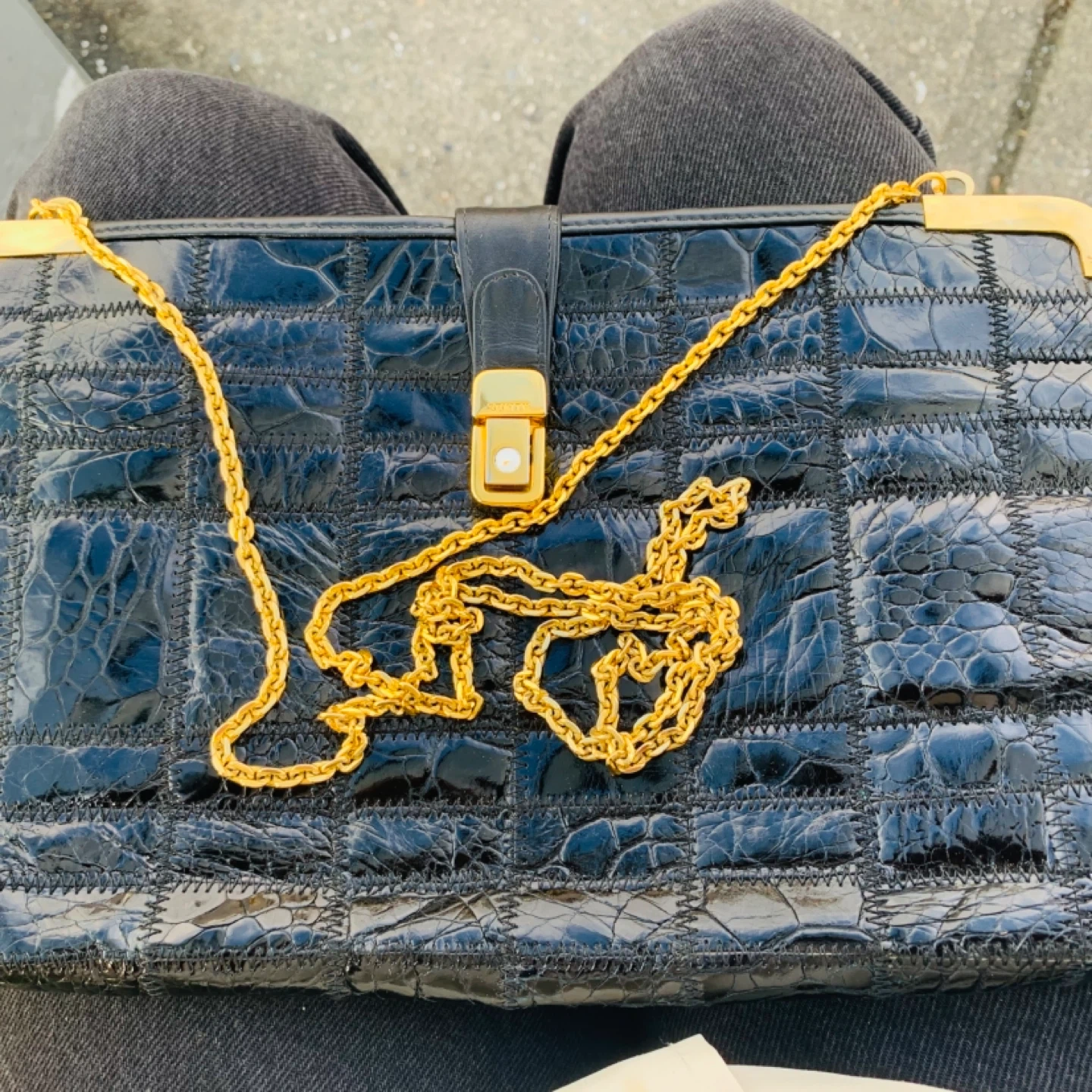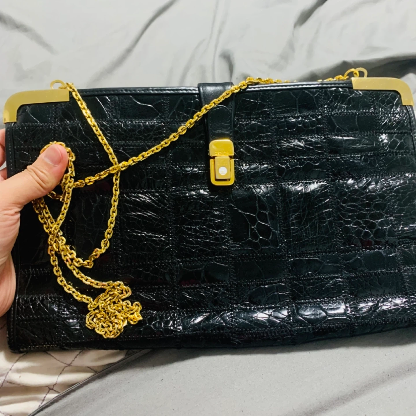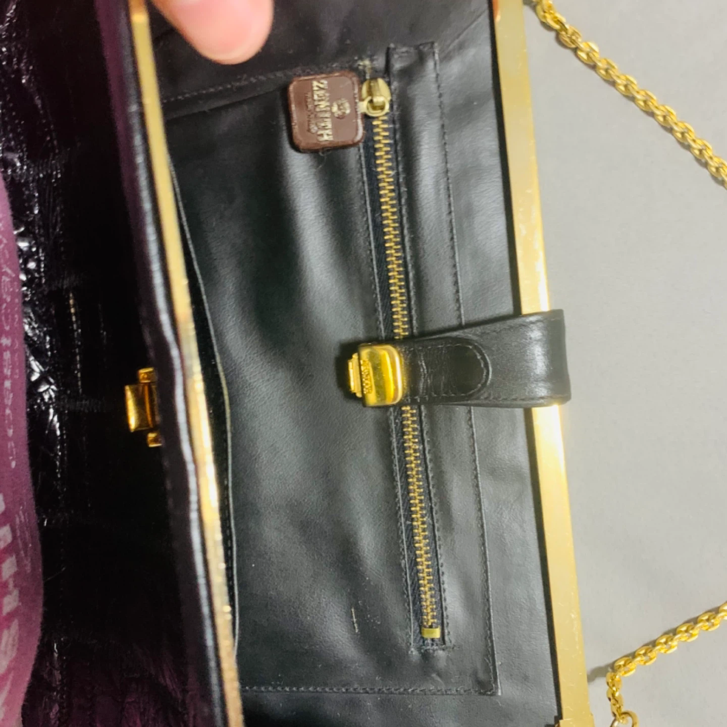 This is a beautiful vintage Zenith bag with a unique croc-embossed leather design in black. It features a gold-tone clasp and chain, adding a touch of elegance to the overall look. Perfect for a night out or special occasion!