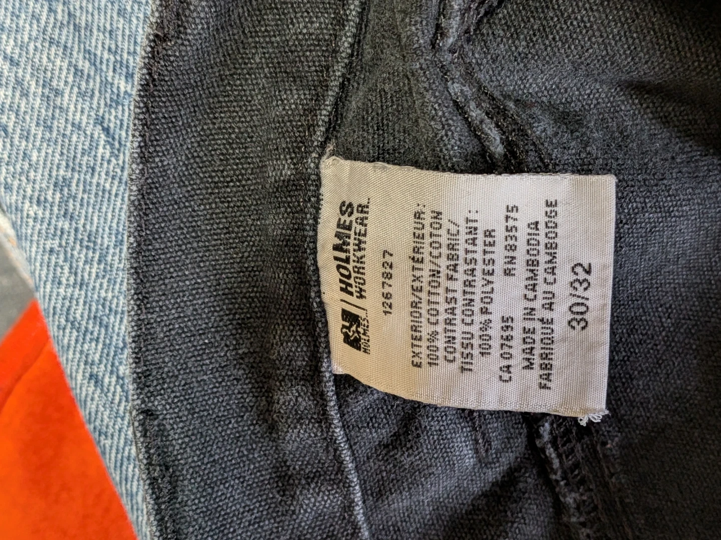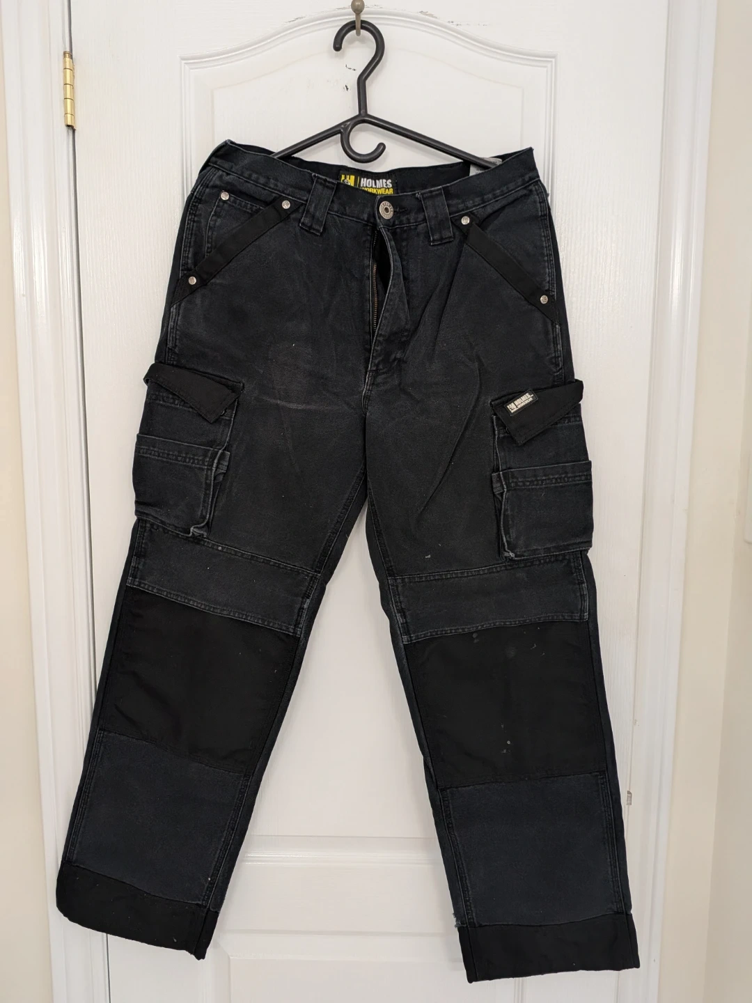 Selling a pair of Holmes Workwear carpenter pants in black. They are size 30/32 and made of 100% cotton exterior with a polyester contrast fabric. Perfect for work or casual wear!