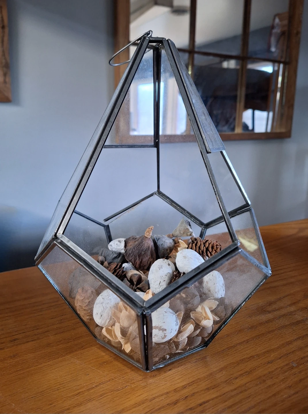 Glass diamond shaped terrarium with metal frame, filled with pinecones, dried flowers and plant matter (potpouri style, but no scent). Great decorative piece.