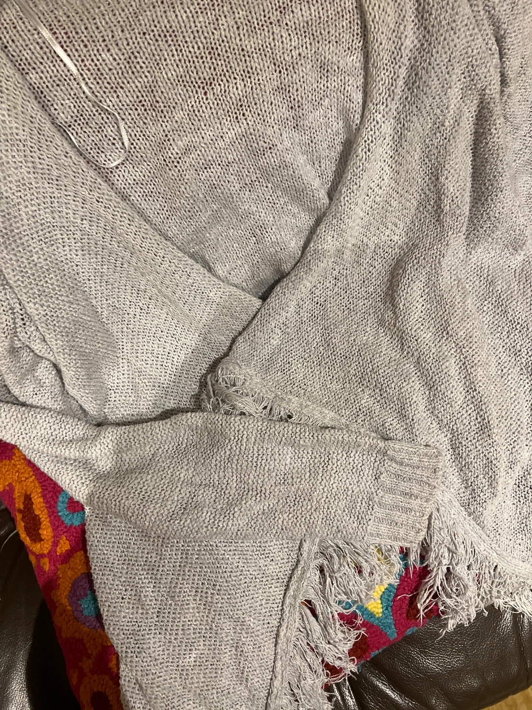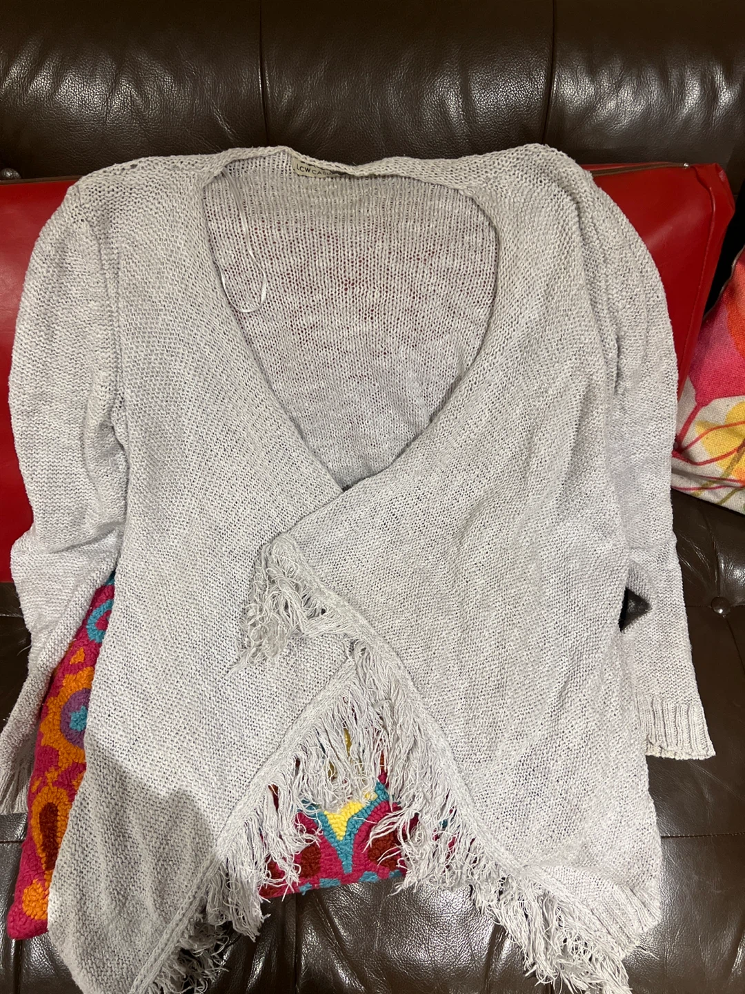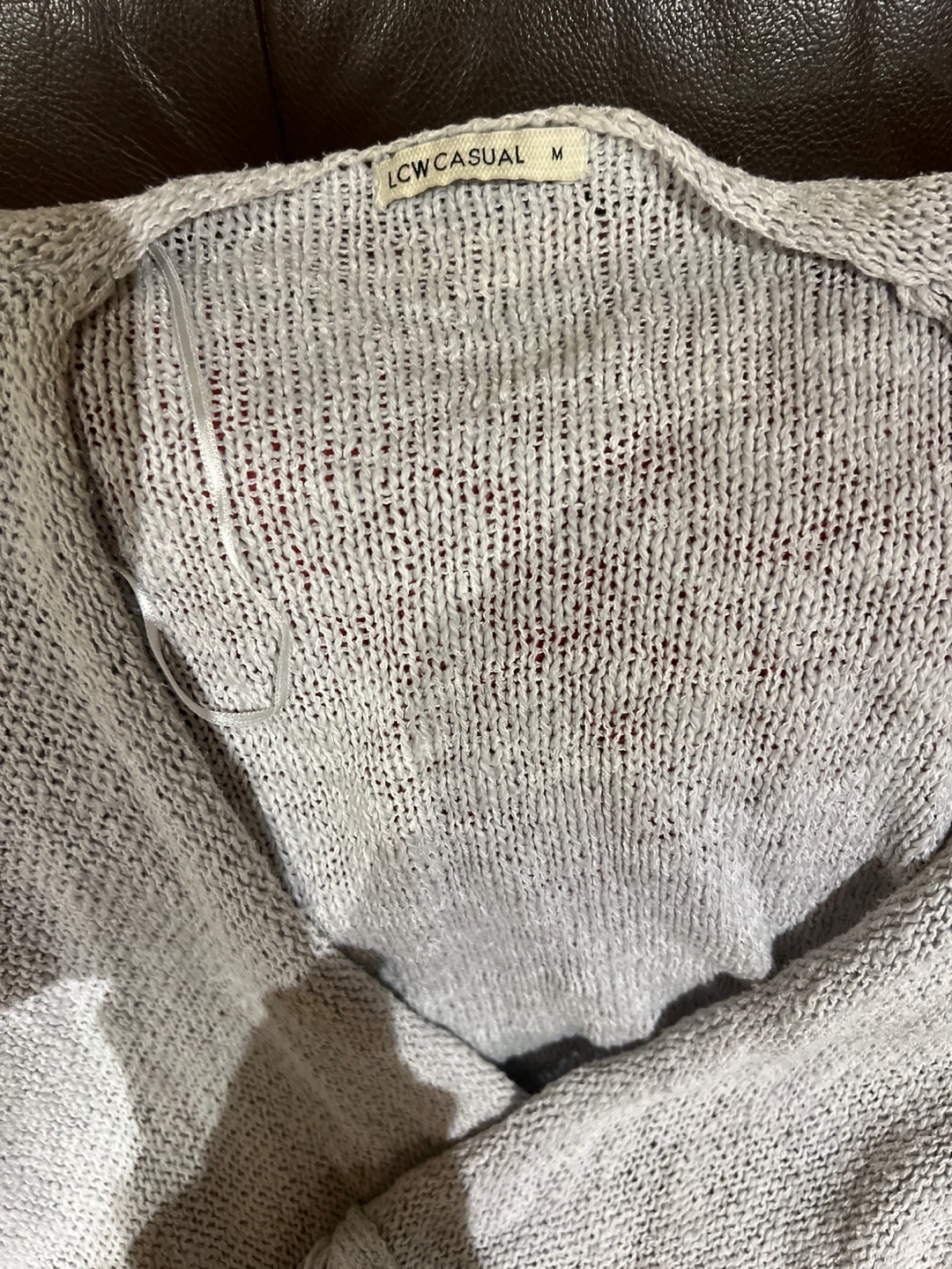 Selling a light grey cardigan from LCW Casual. It's a size medium and has a bit of a distressed look with fringe detailing. Perfect for layering!