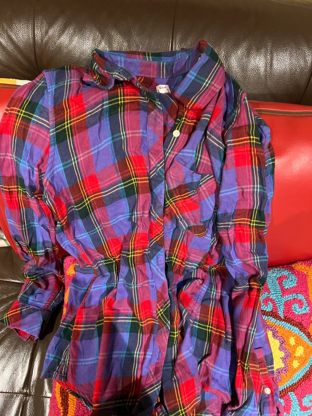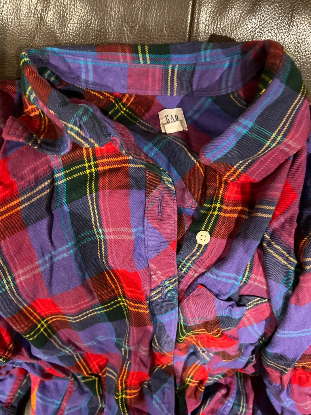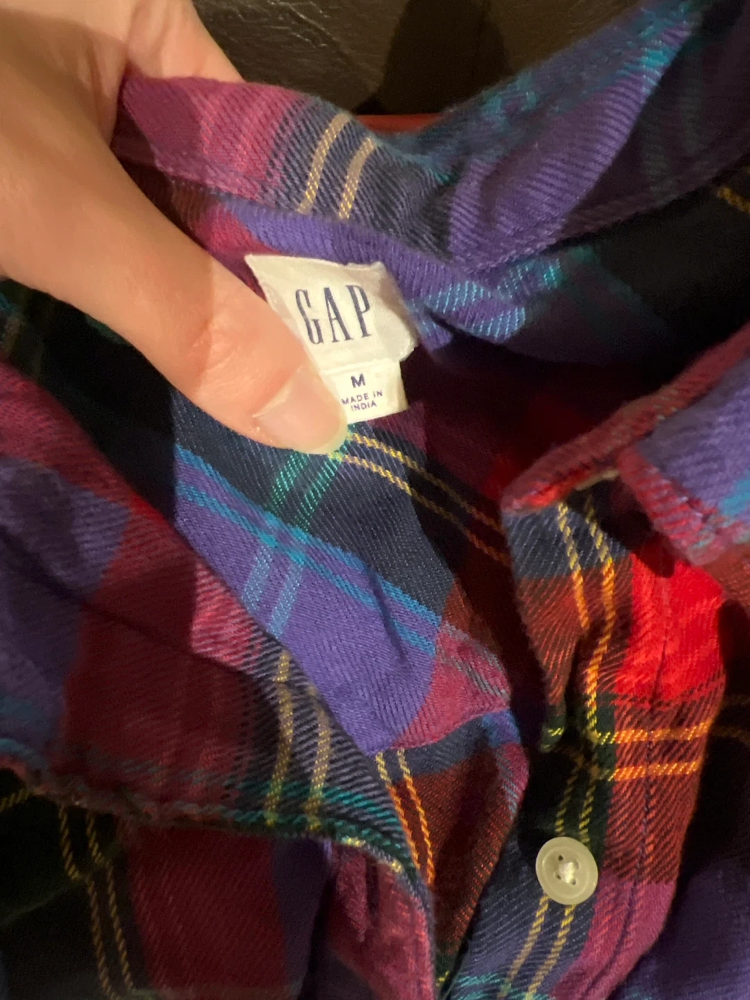 Selling a Gap flannel shirt in size medium. It features a colourful plaid pattern with shades of purple, red, blue, and yellow. Perfect for layering or wearing on its own!