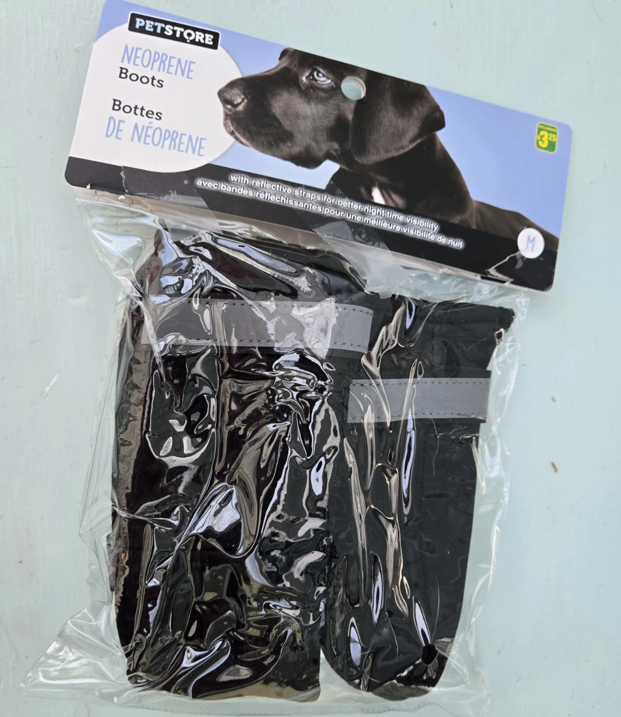 Keep your furry friend's paws protected with these neoprene boots! They're brand new and come in size M (2 in. by 6.in) These boots are perfect for all weather conditions and feature reflective straps for better nighttime visibility. Bought them at Dollarama.