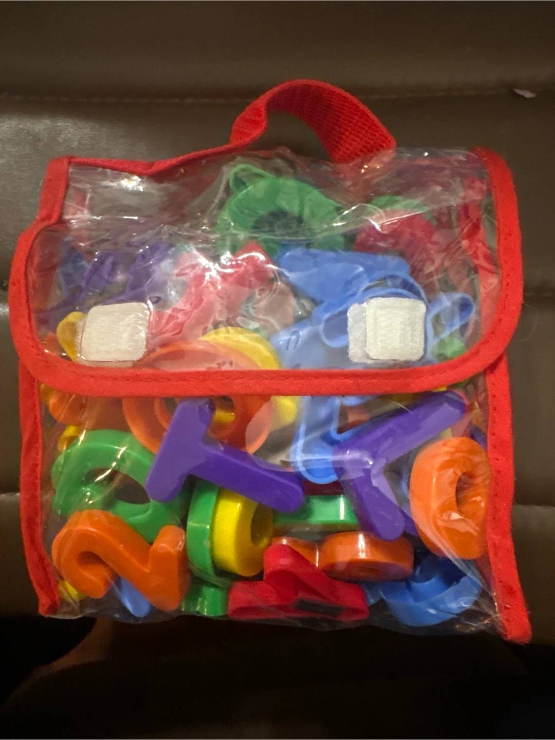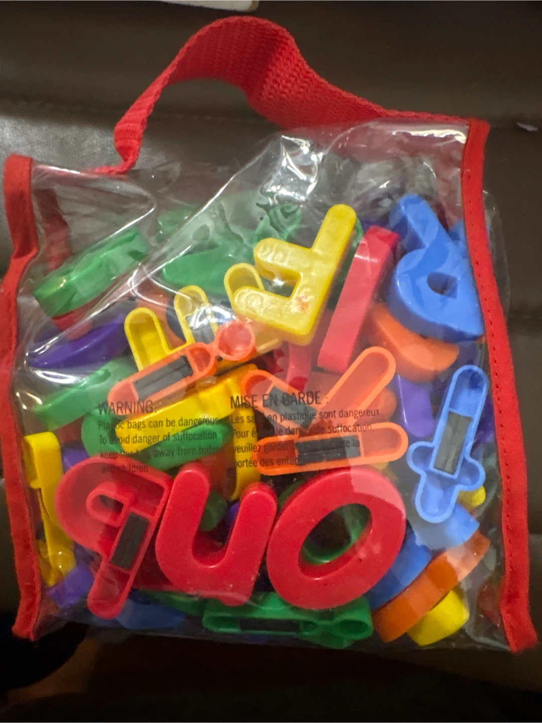 A bag of colorful magnetic alphabet letters and numbers! Great for learning and fun on the fridge or any magnetic surface. Perfect for kids learning their ABCs and numbers.