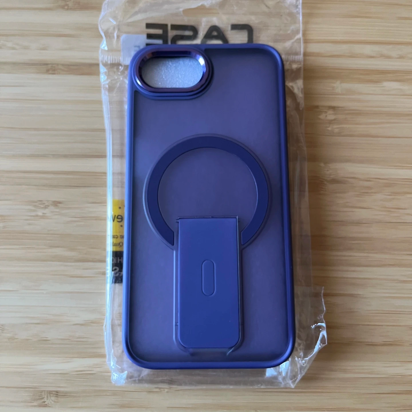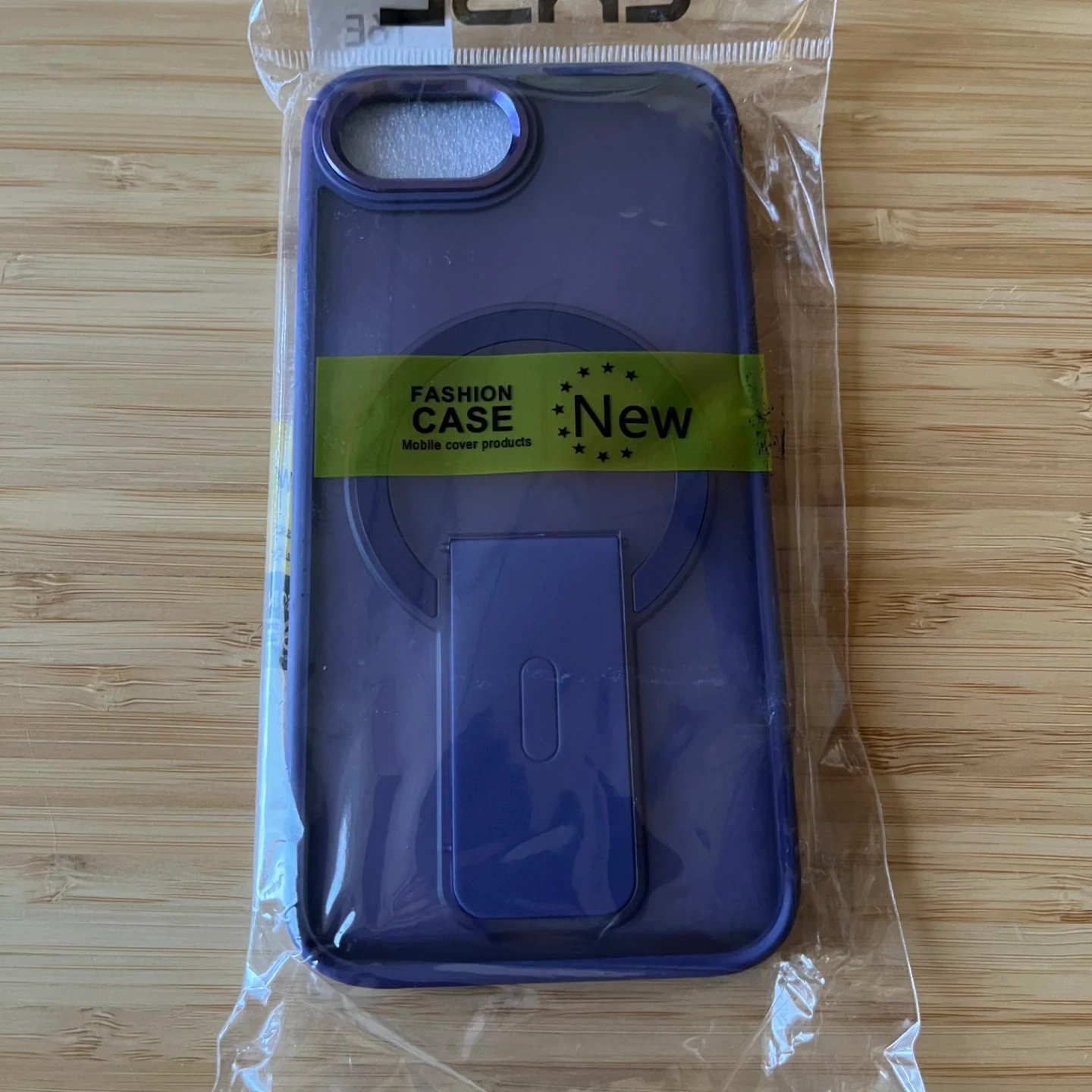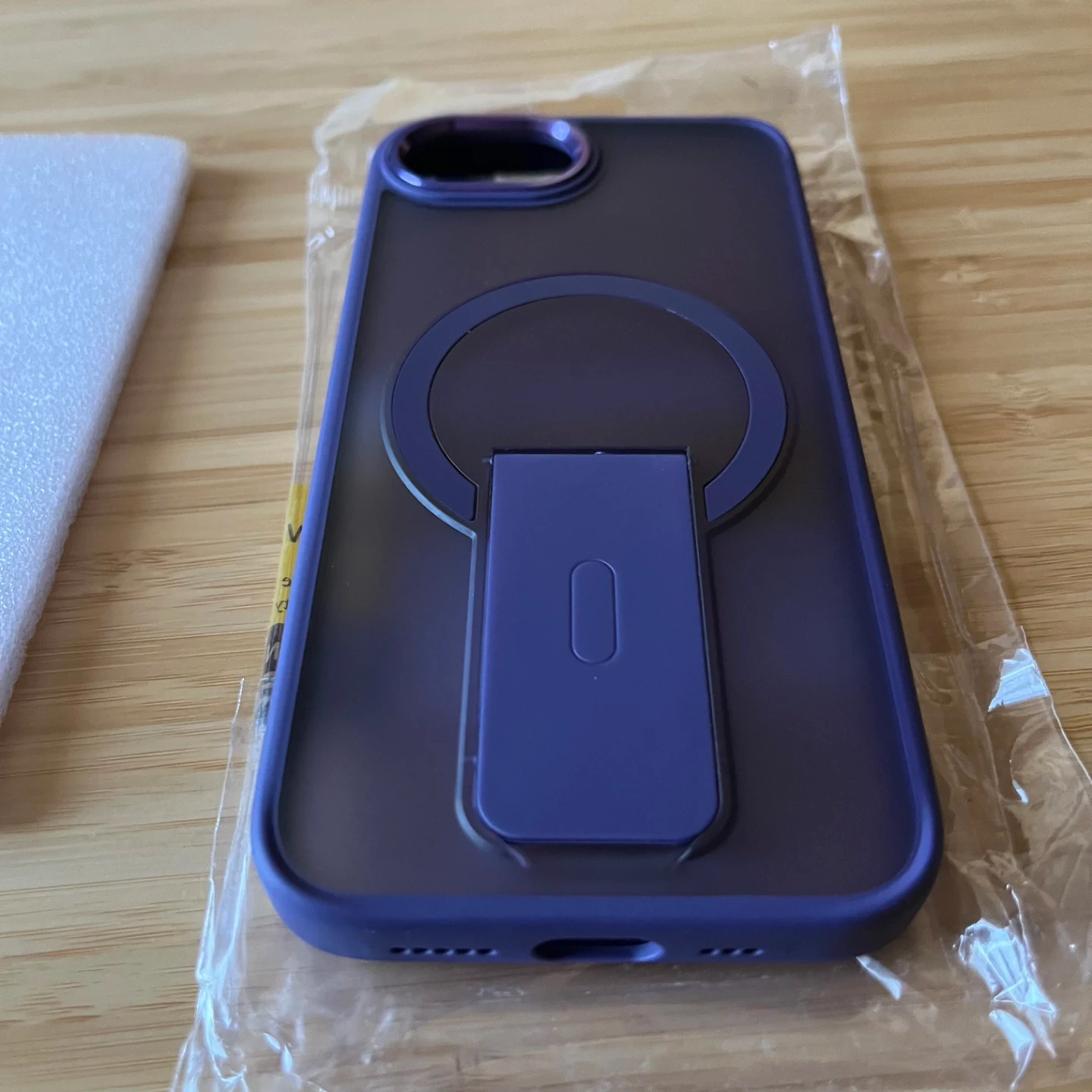 New purple case for iPhone 16e. It features a grippy border that allows for easy and secure hold in the hand but also added drop protection. The back is hard frosted plastic that allows you to see the Apple logo. It has an integrated ring that protects the camera lens. There's a built in metal ring for Magsafe accessories and a pop out stand that allows you to prop up your phone for hands free viewing or filming.