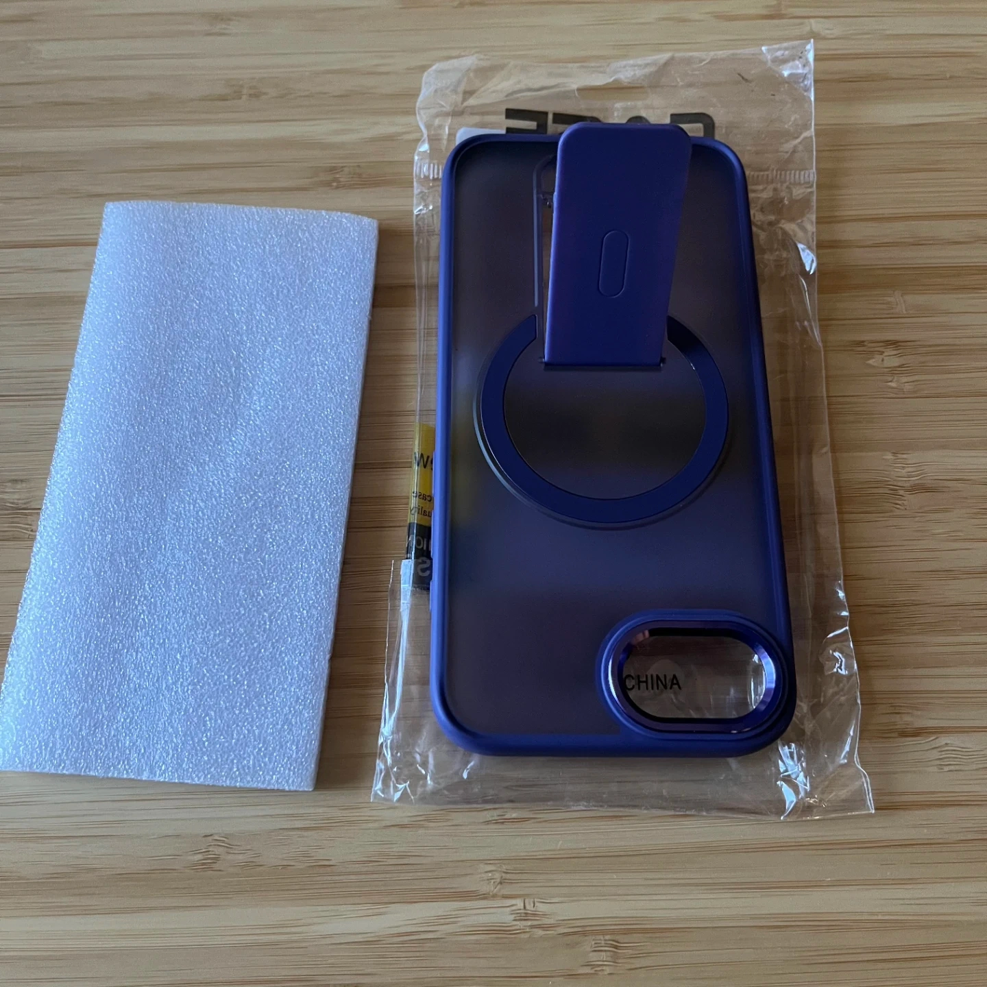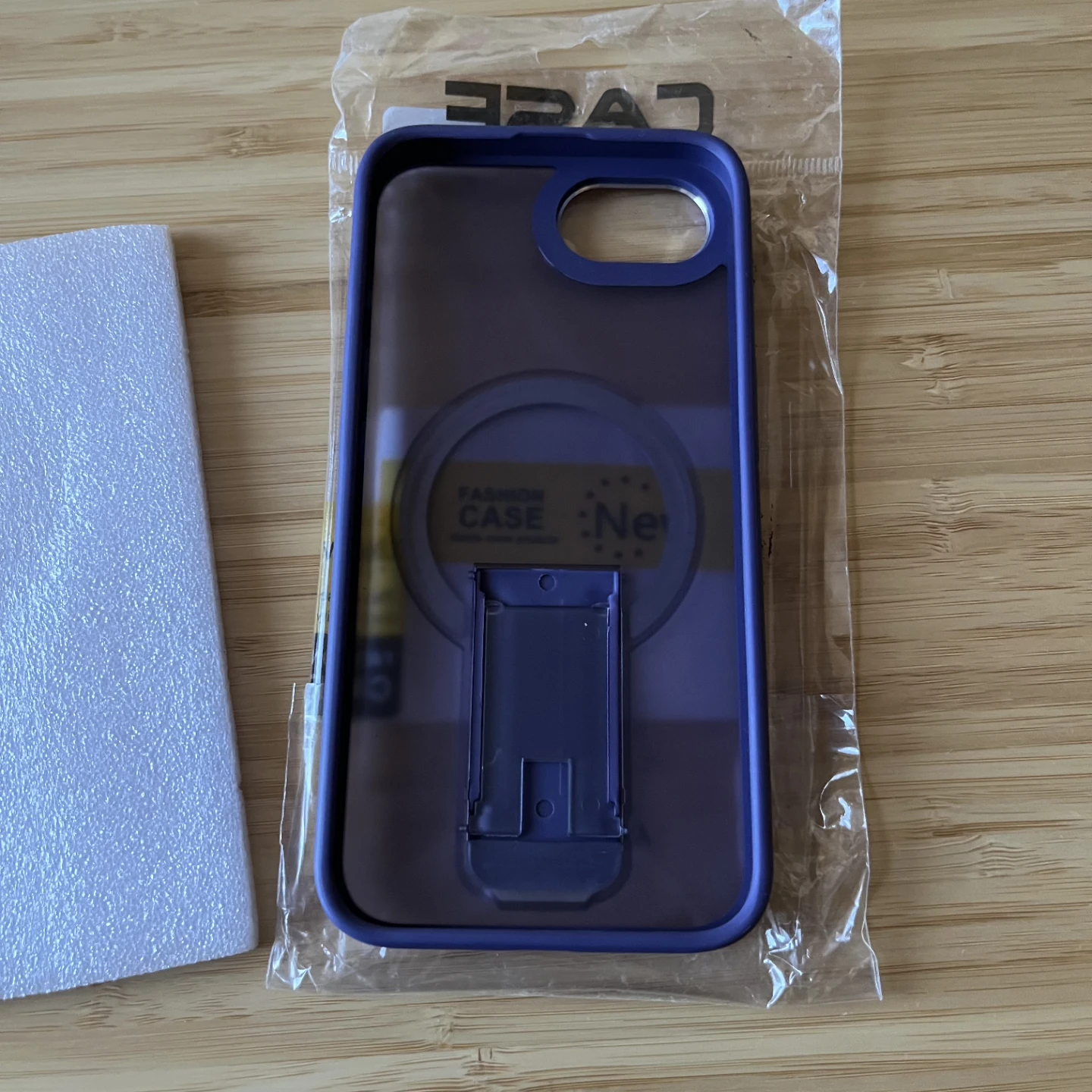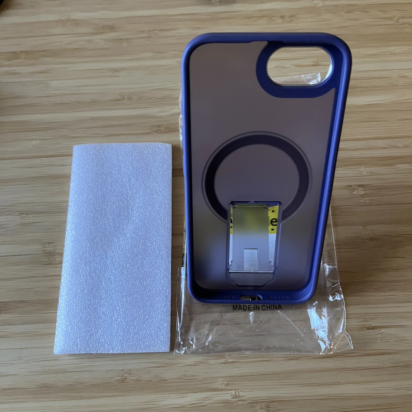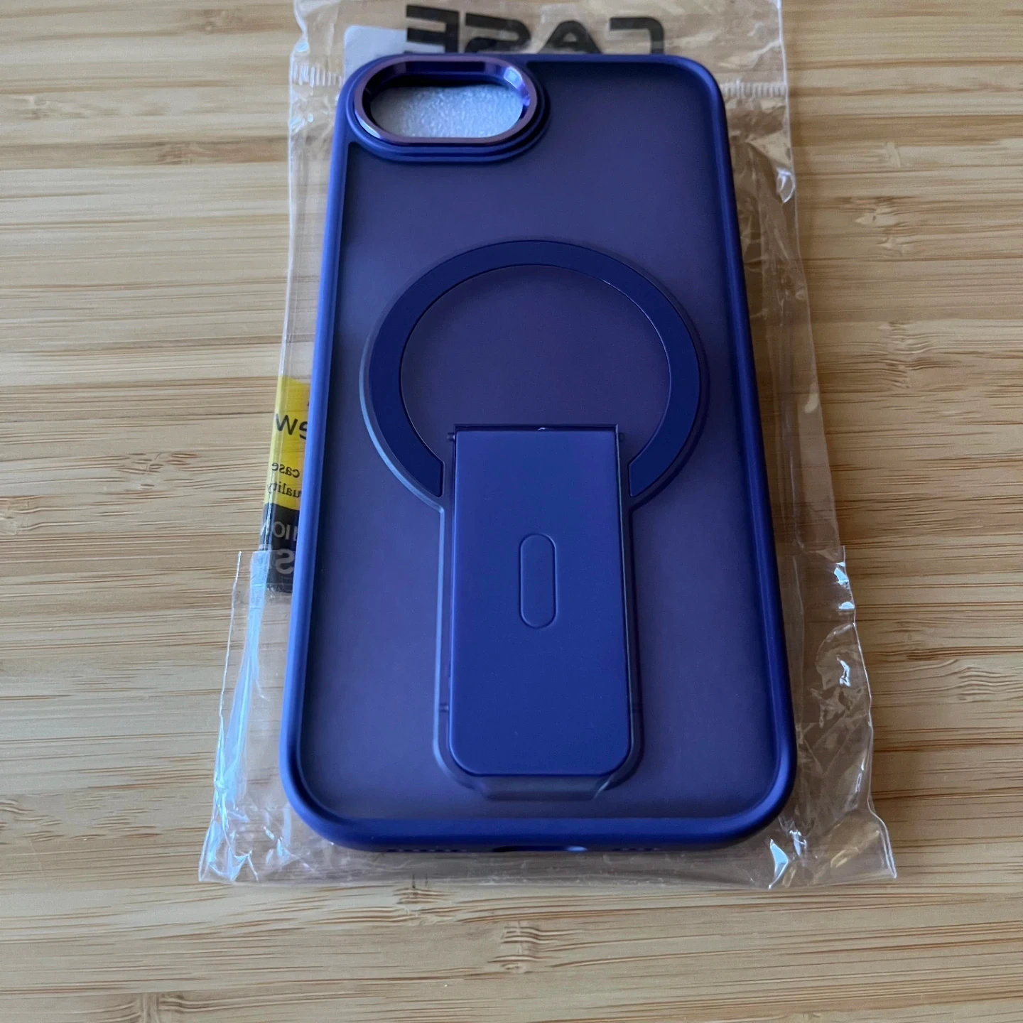 New purple case for iPhone 16e. It features a grippy border that allows for easy and secure hold in the hand but also added drop protection. The back is hard frosted plastic that allows you to see the Apple logo. It has an integrated ring that protects the camera lens. There's a built in metal ring for Magsafe accessories and a pop out stand that allows you to prop up your phone for hands free viewing or filming.
