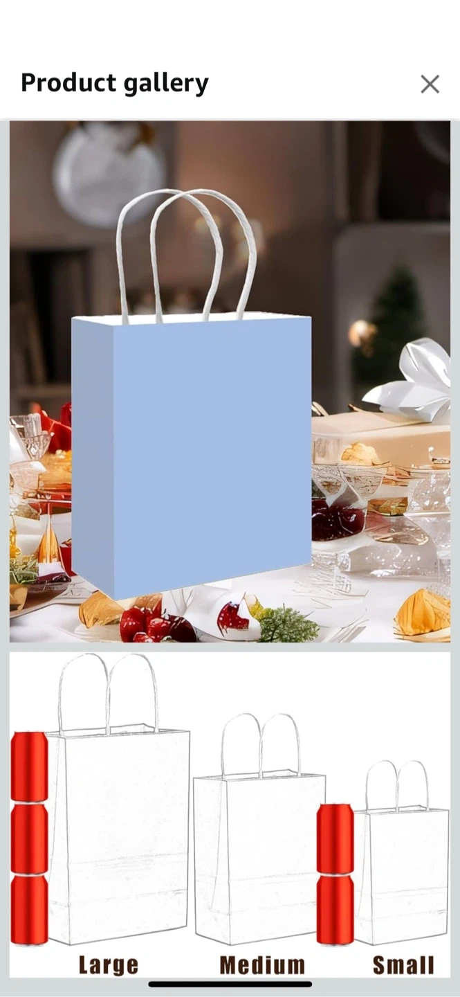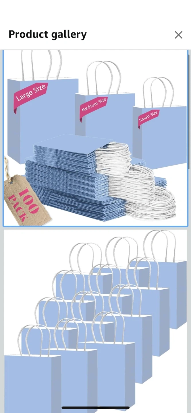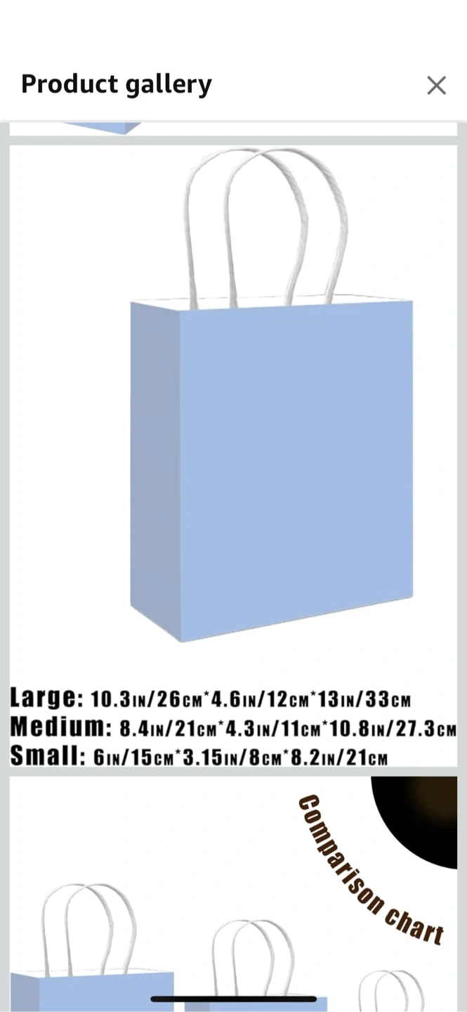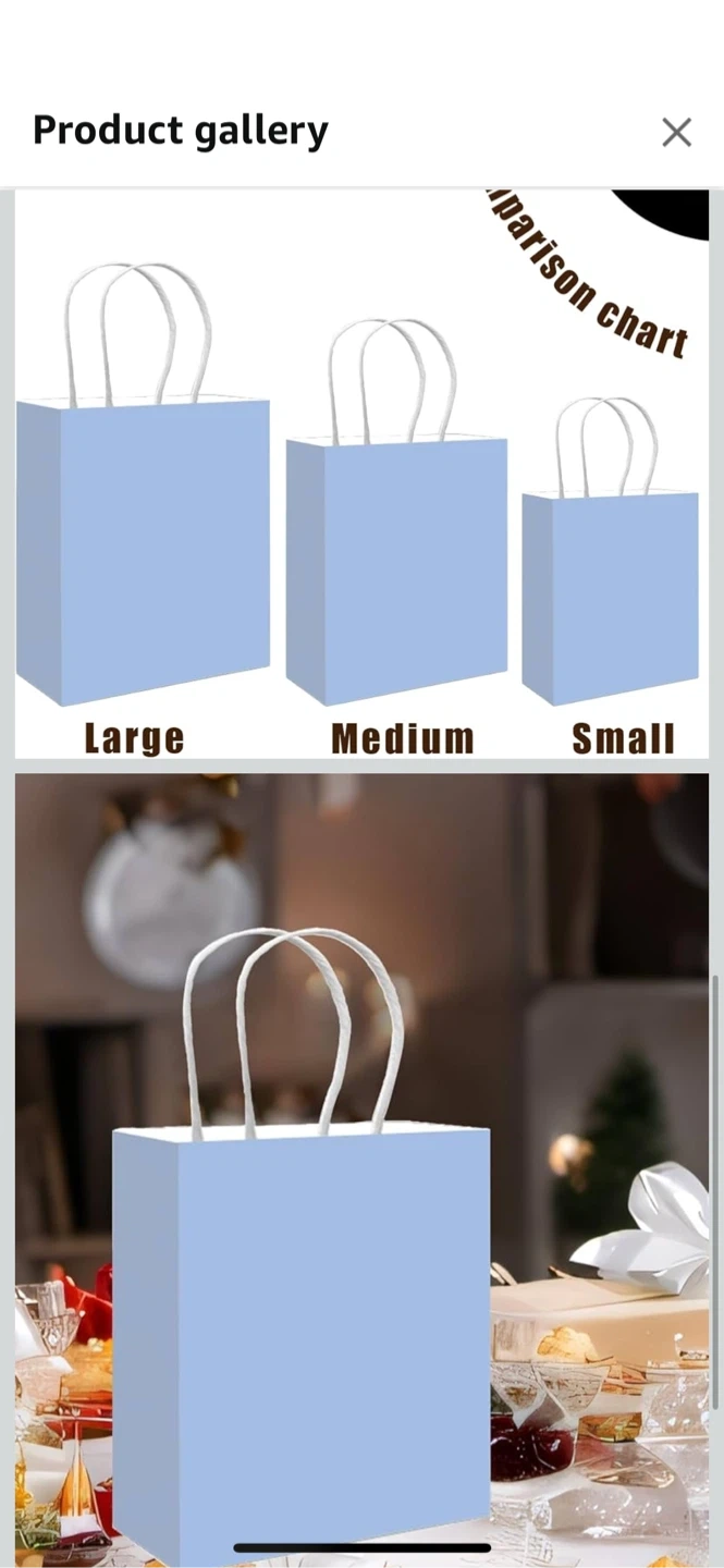 I have some light blue paper gift bags available. They are medium size, measuring 8.4in/21cm * 4.3in/11cm * 10.8in/27.3cm. Perfect for small gifts and party favours! They are large and medium and small size