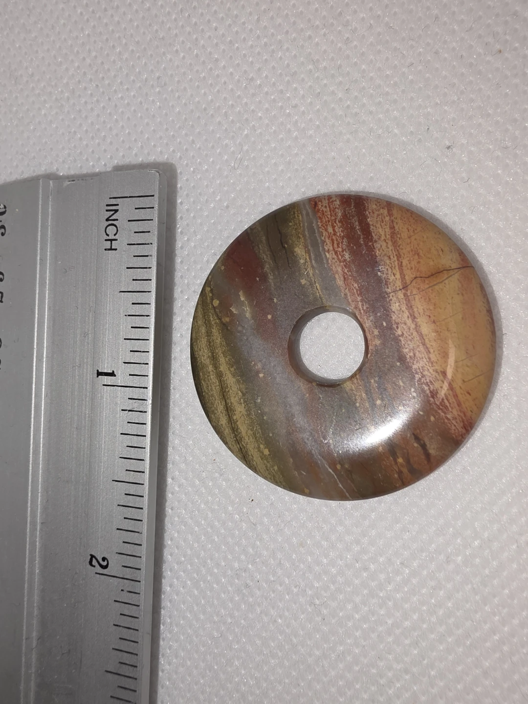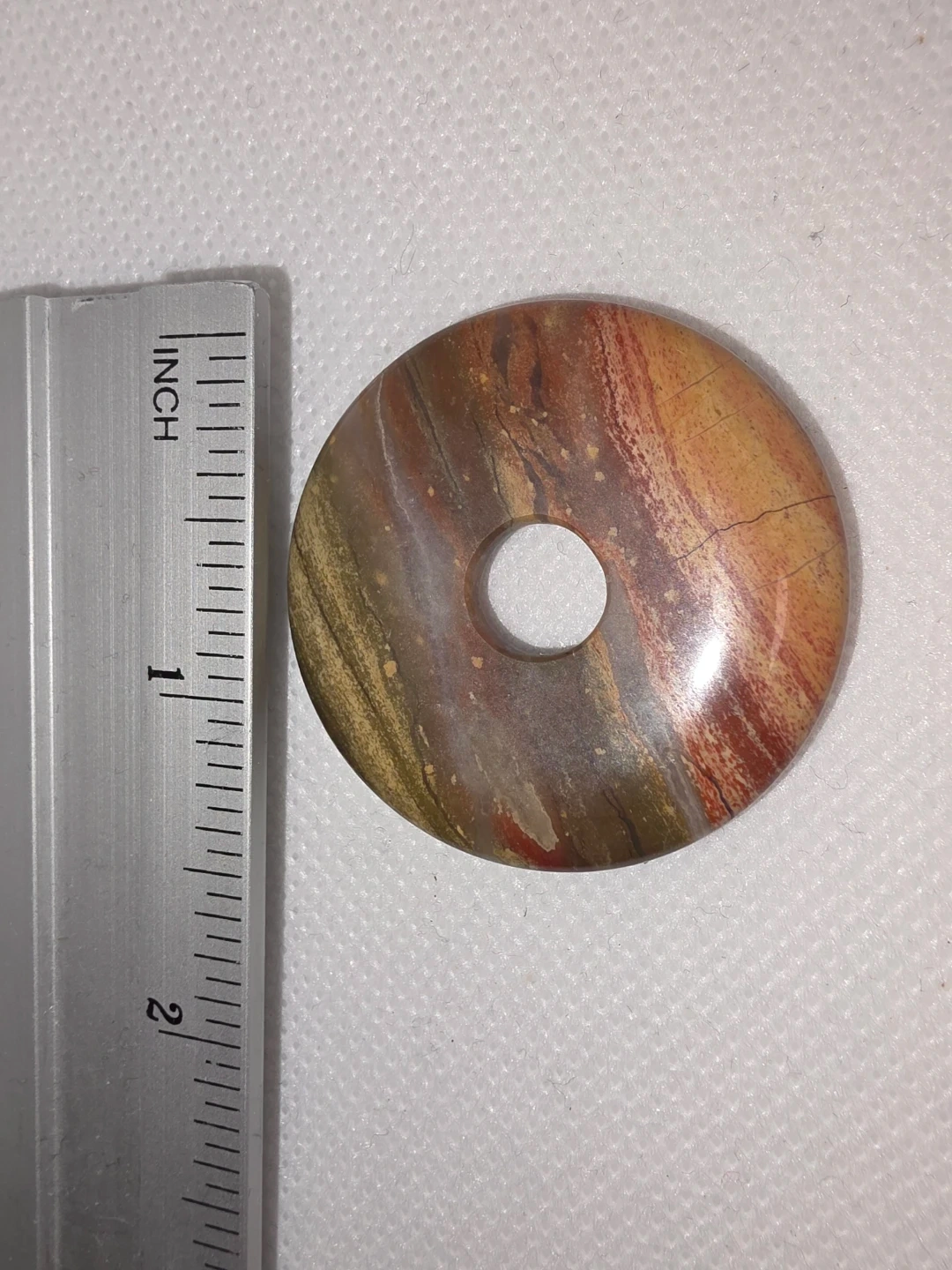 Here's a beautiful polychrome jasper donut stone! It's a unique piece with lovely colours and patterns. Perfect for adding a touch of natural beauty to your collection or for use in crafts. Perfect for a necklace. Pickup near High Park Station. From my own personal collection.