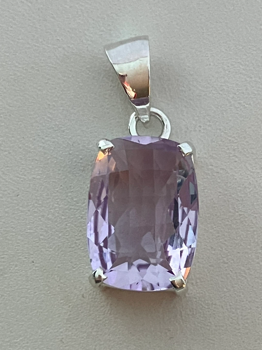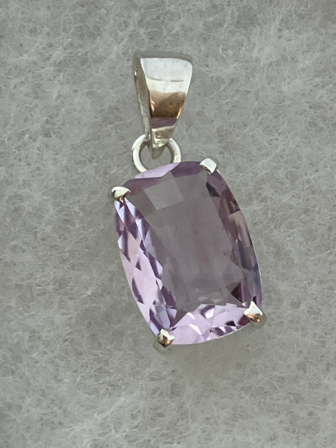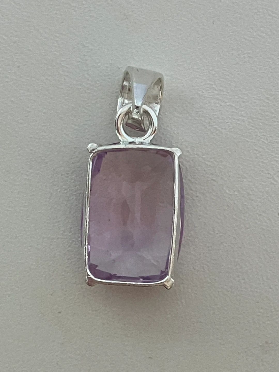 Here's a lovely amethyst pendant set in sterling silver. It's in great condition and ready to add a touch of elegance to any outfit. The stone has a beautiful light purple hue.