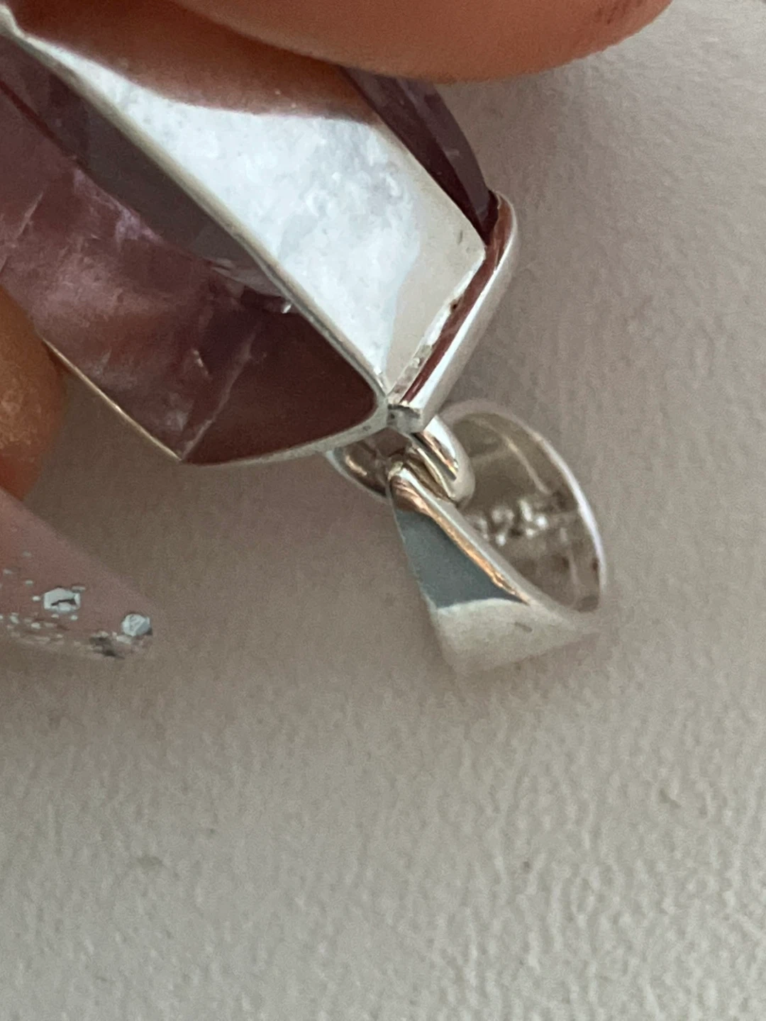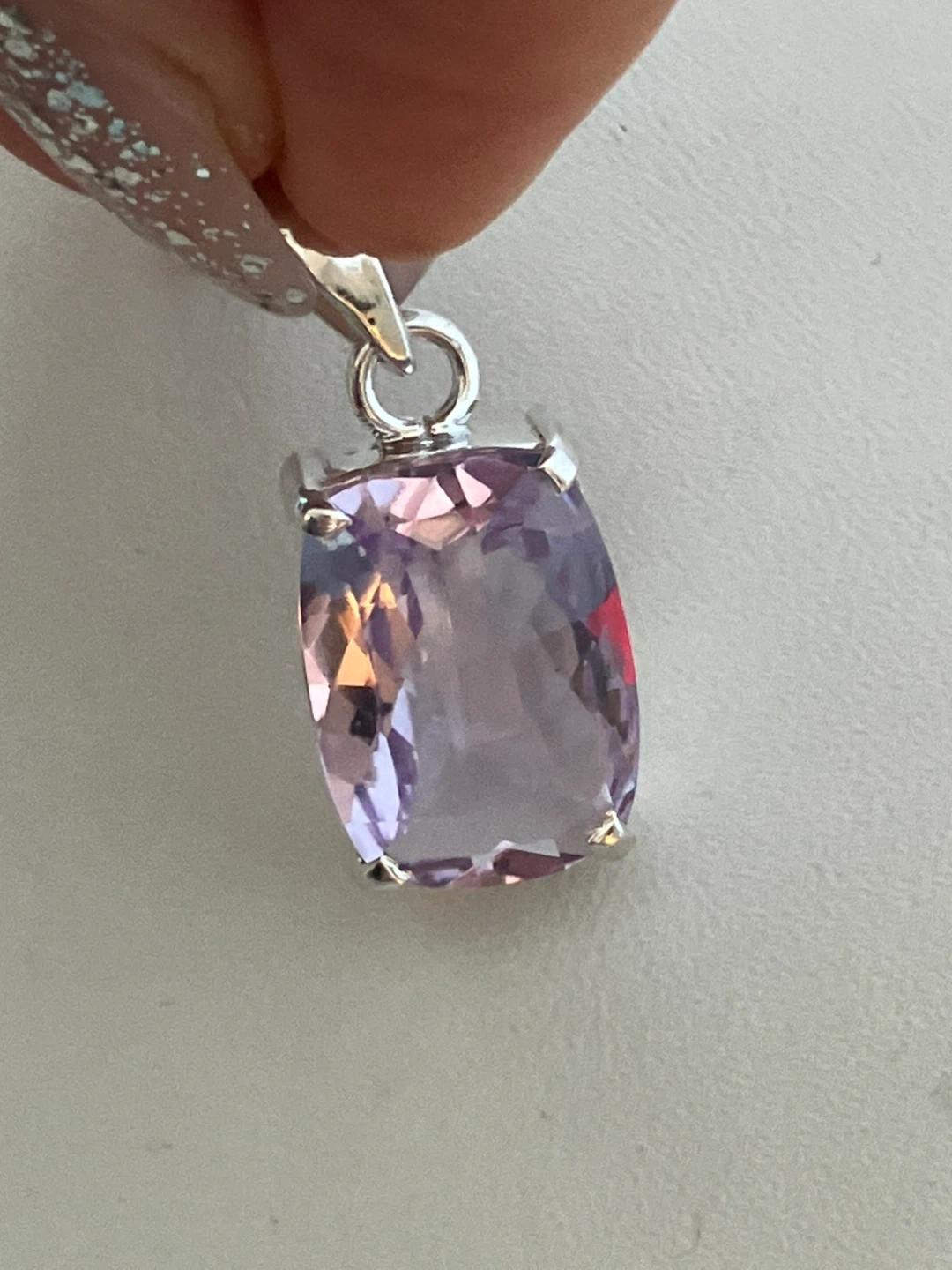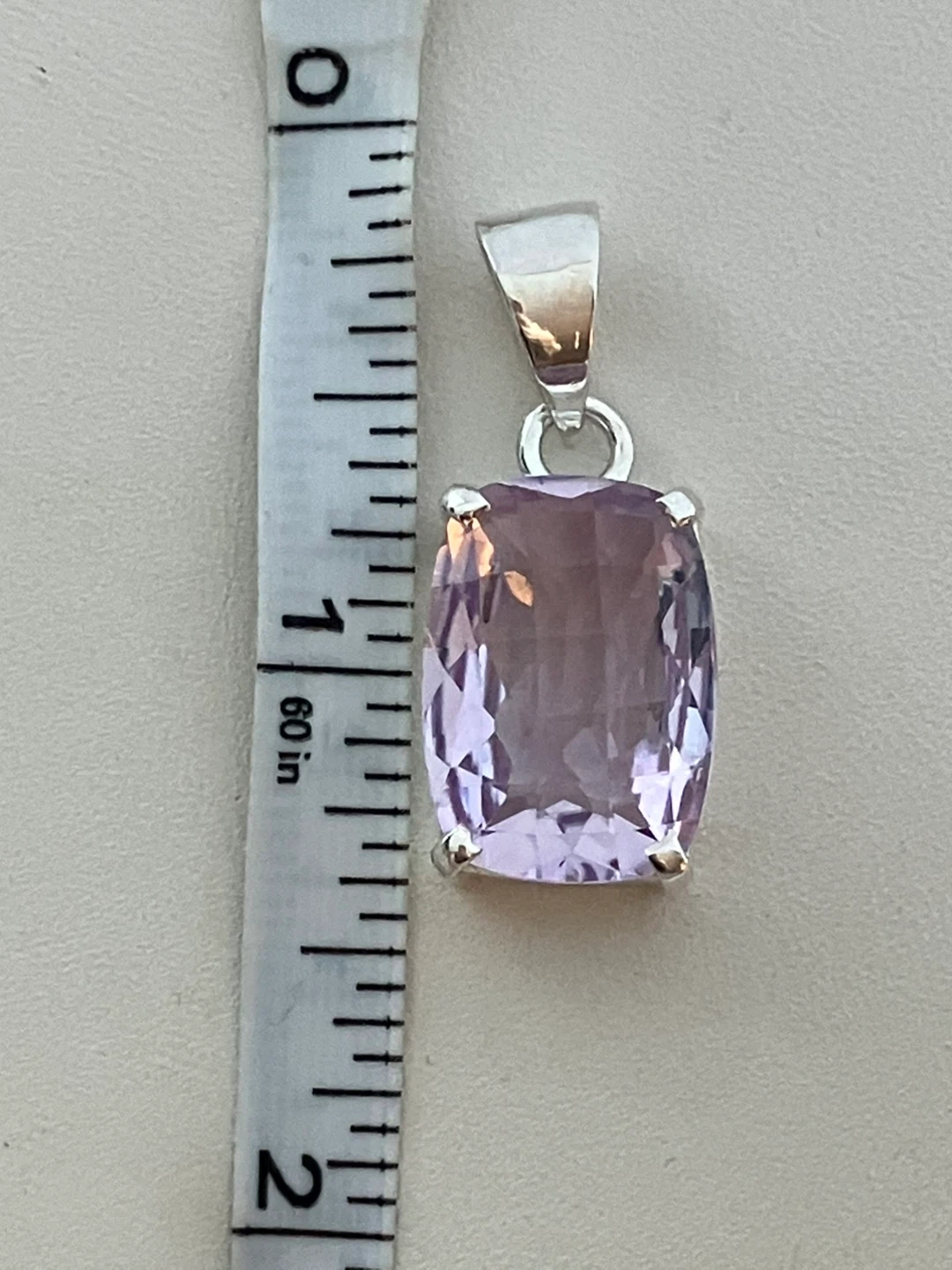 Here's a lovely amethyst pendant set in sterling silver. It's in great condition and ready to add a touch of elegance to any outfit. The stone has a beautiful light purple hue.