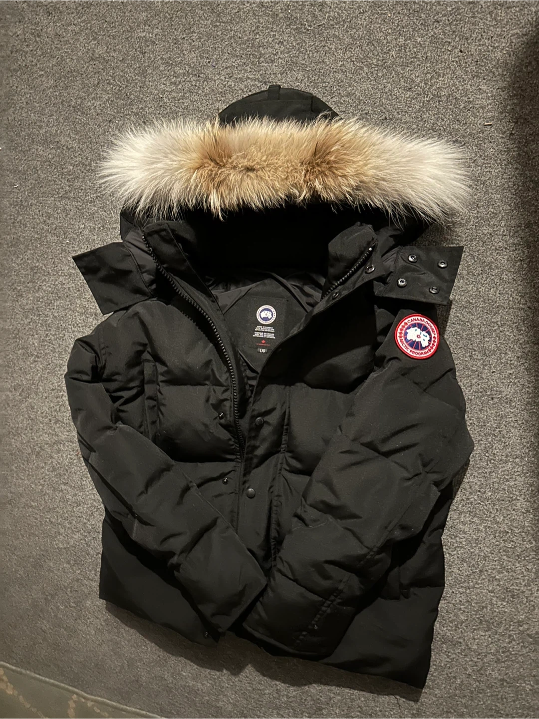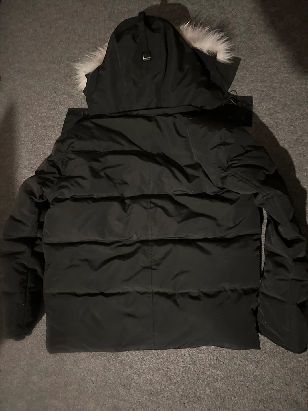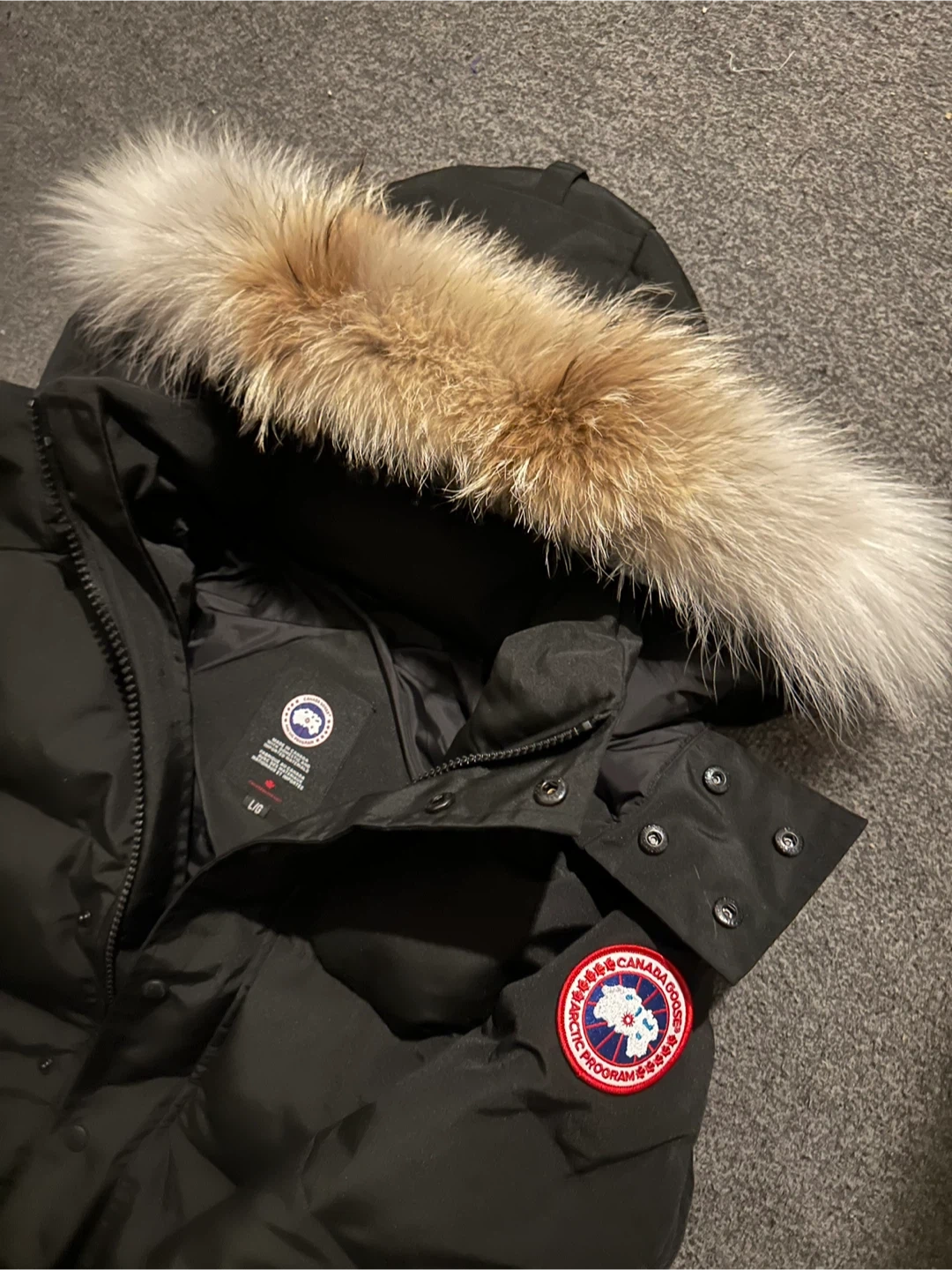 Selling a Canada Goose black down parka. It's in great condition and ready to keep you warm this winter! The parka features a fur-trimmed hood and the classic Canada Goose logo patch.