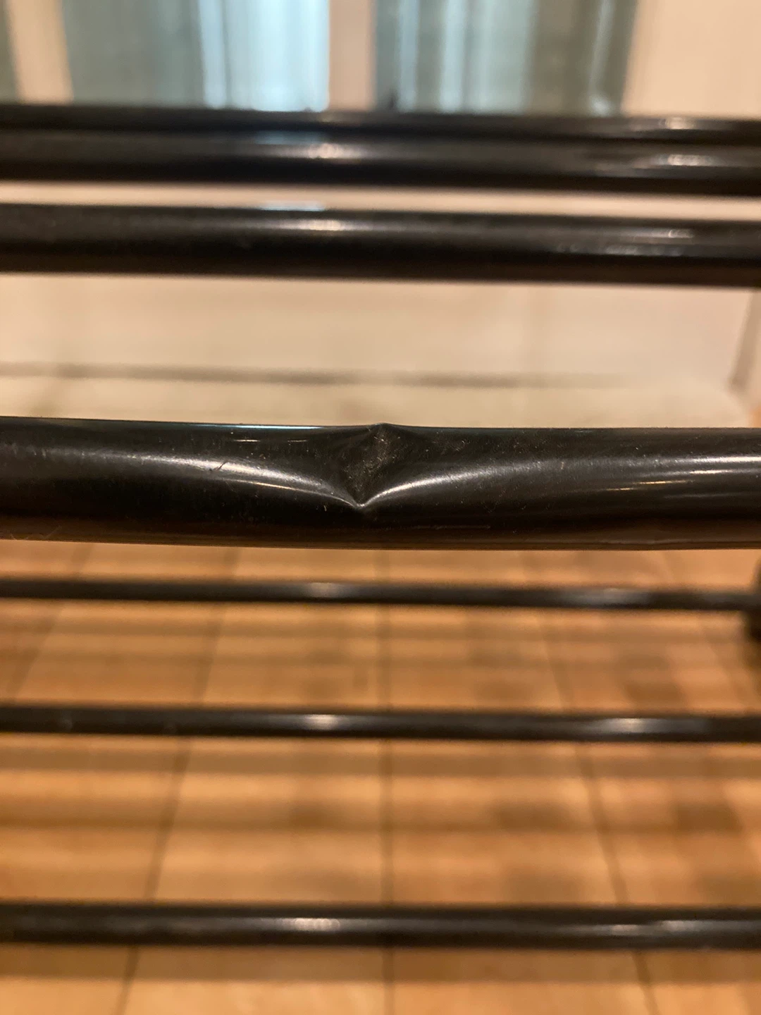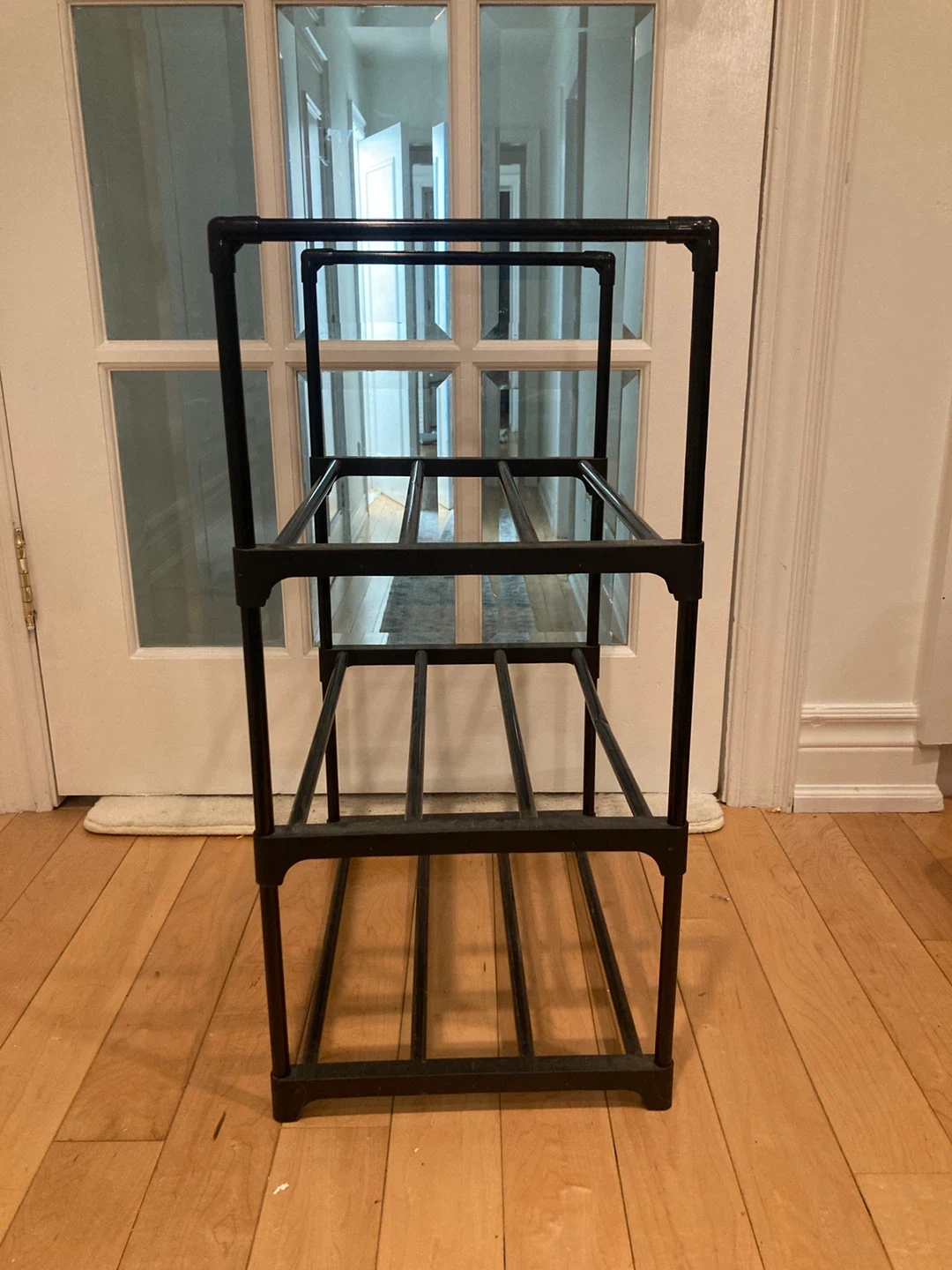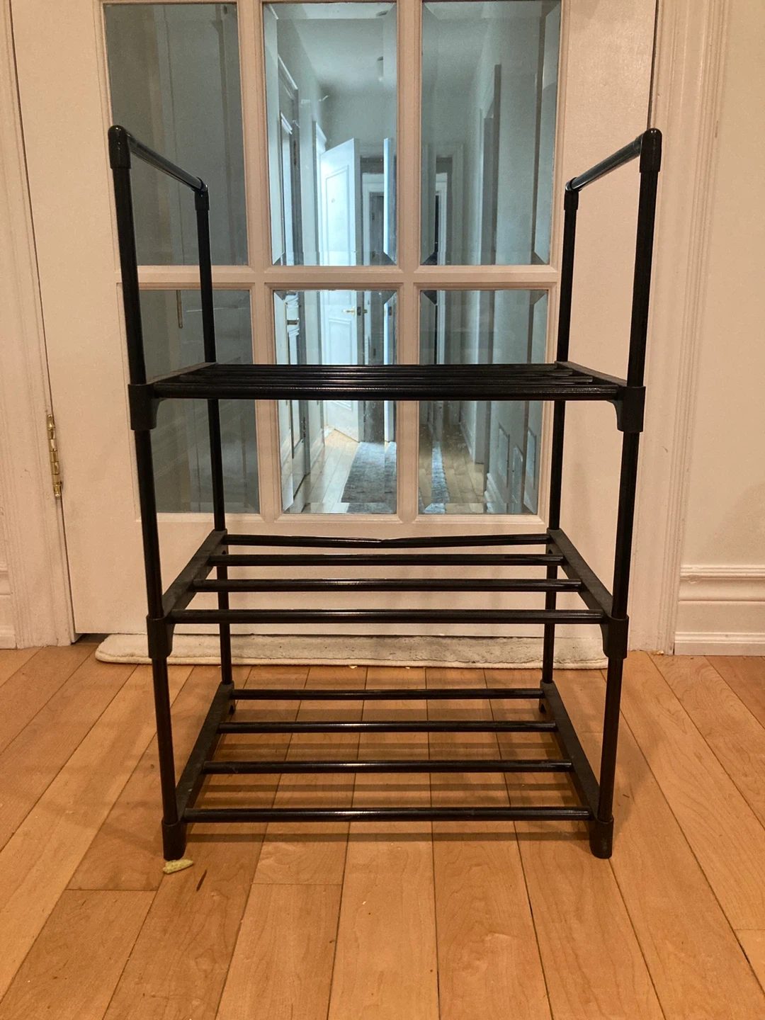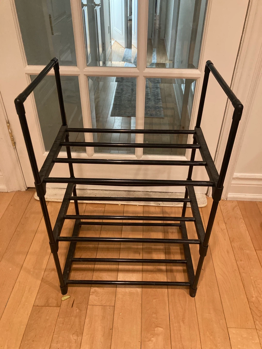 Selling a black metal shoe rack with 3 tiers! There is a small dent on one of the bars, as shown in the photos, but it's still perfectly functional for storing your shoes or other items