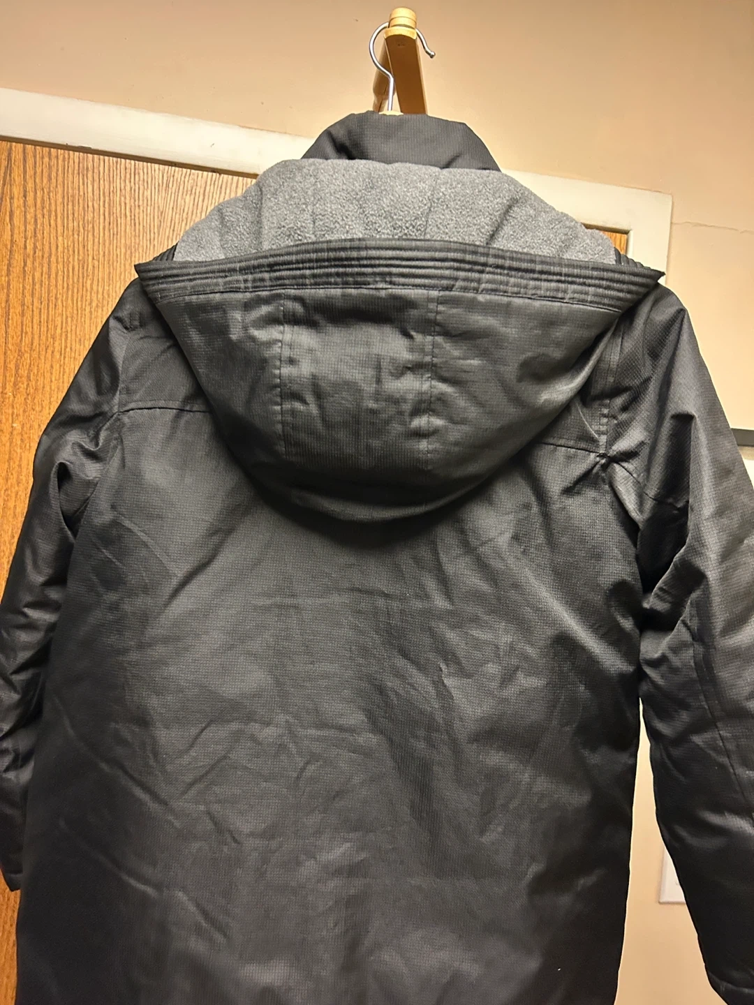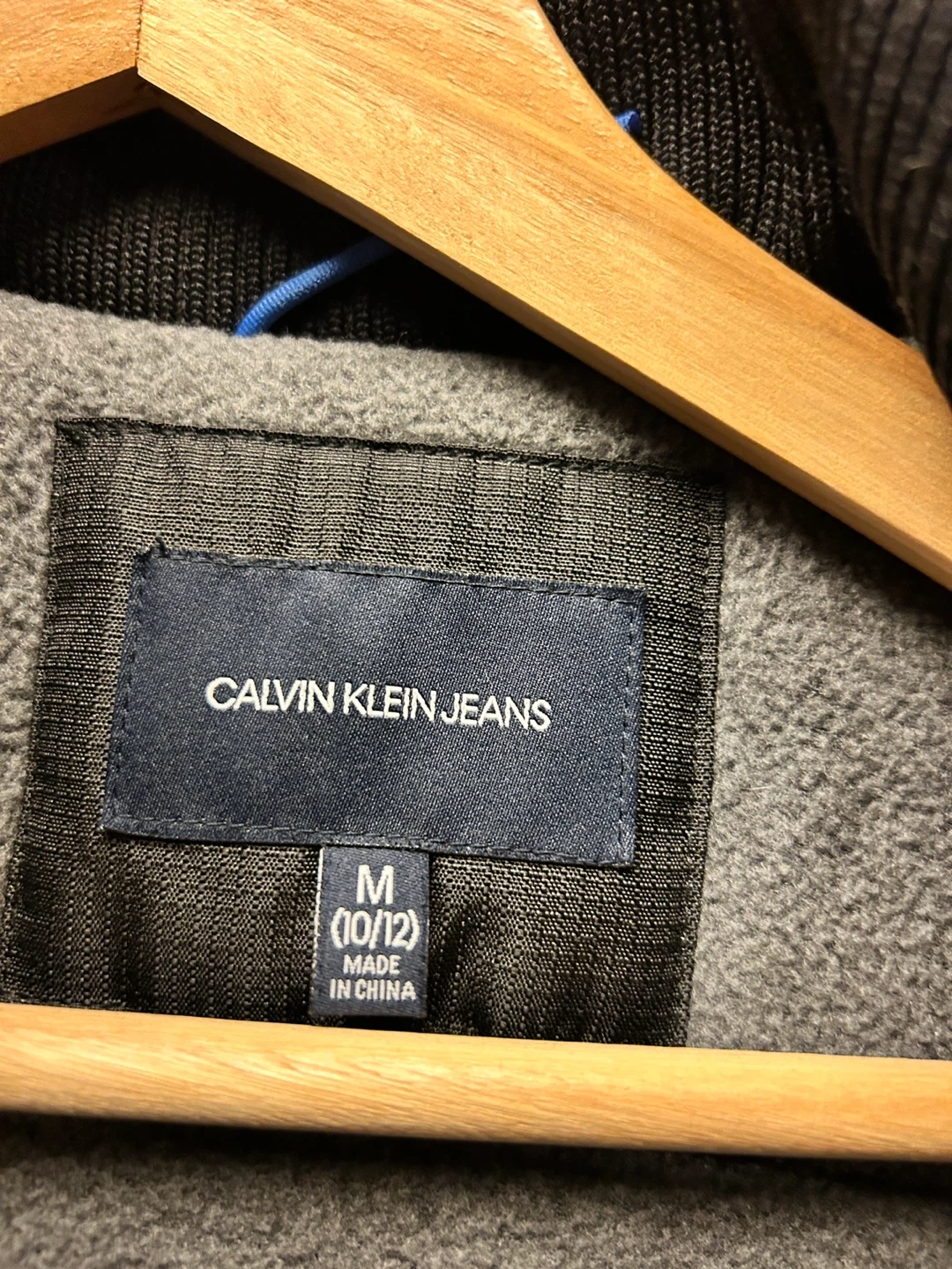 Selling a Calvin Klein Jeans winter jacket in size M (10/12). It's a stylish and warm jacket, perfect for the Canadian winter. The jacket is black with a grey lining and features several pockets. It has a hood for extra protection against the elements. The brand logo is visible on the front.