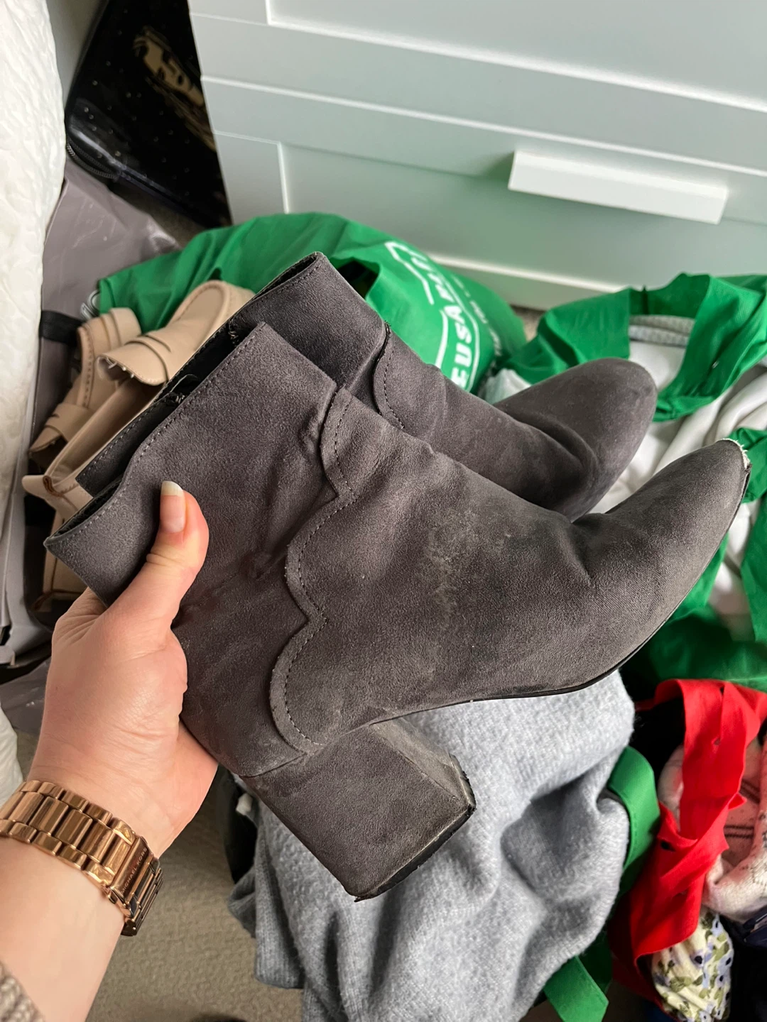 Giving away a pair of grey suede ankle boots. They are in used condition, as shown in the photos - some scuffing by the toe.